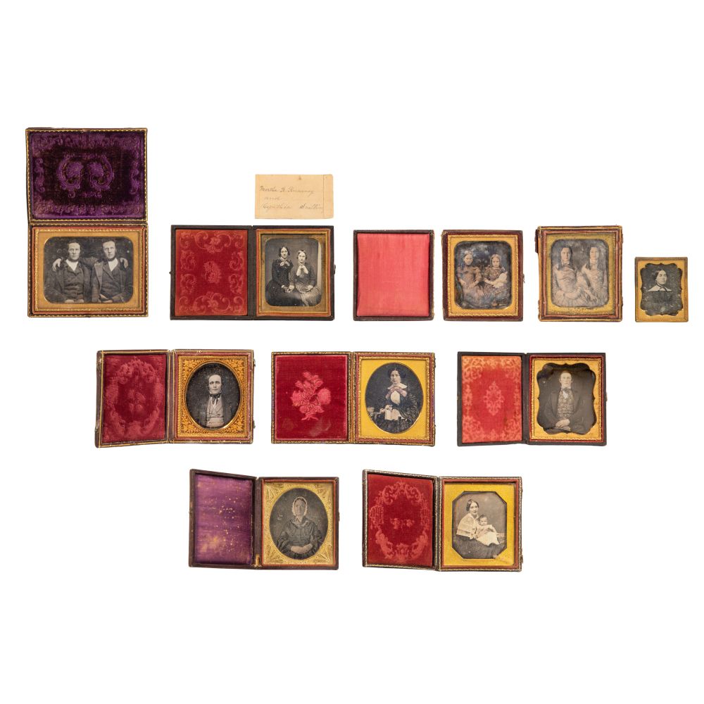 (10) daguerreotypes depicting portraits of men, women and children, most having metal frames set in velvet lined leather, wood, gutta-percha or resin cases