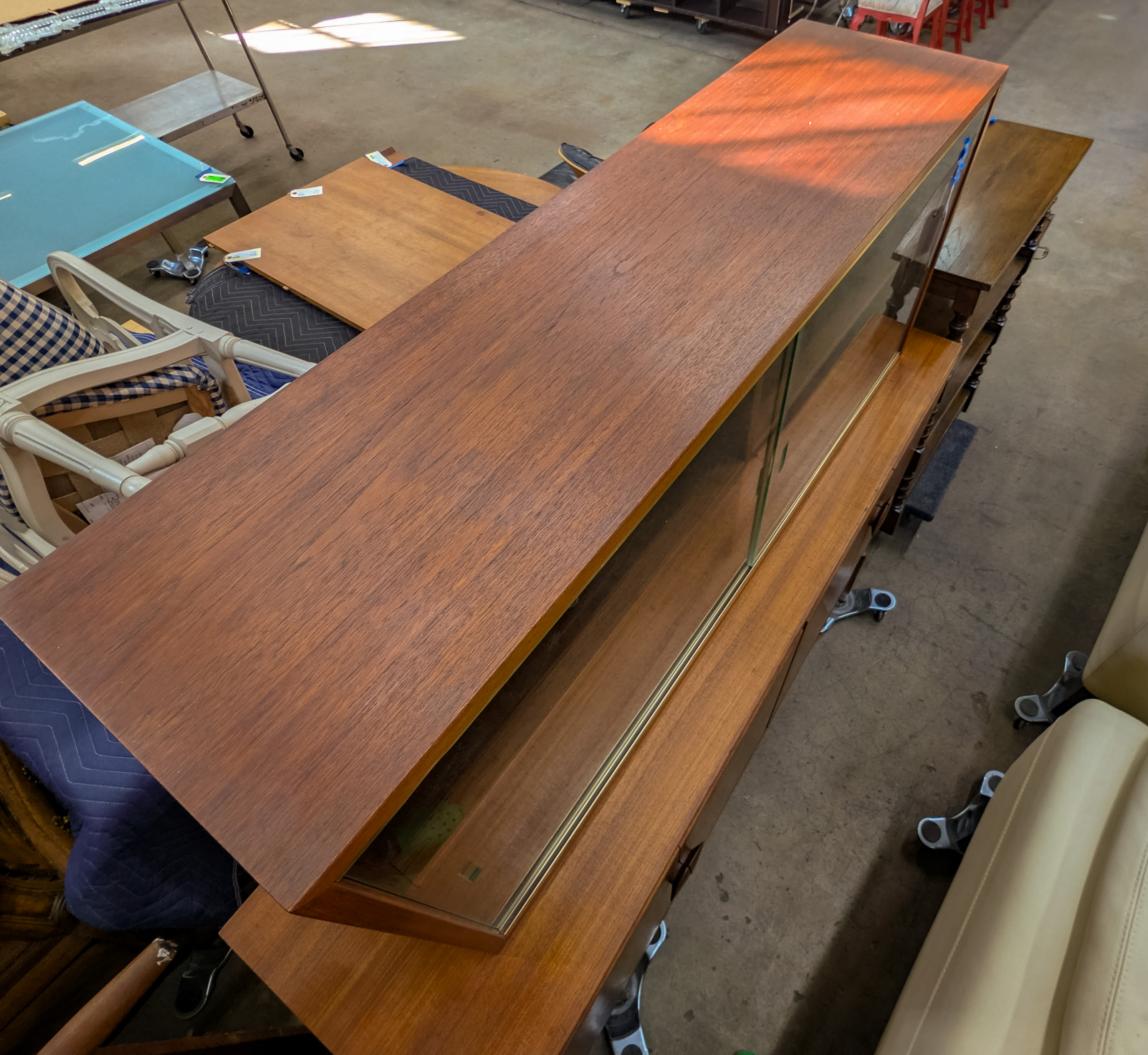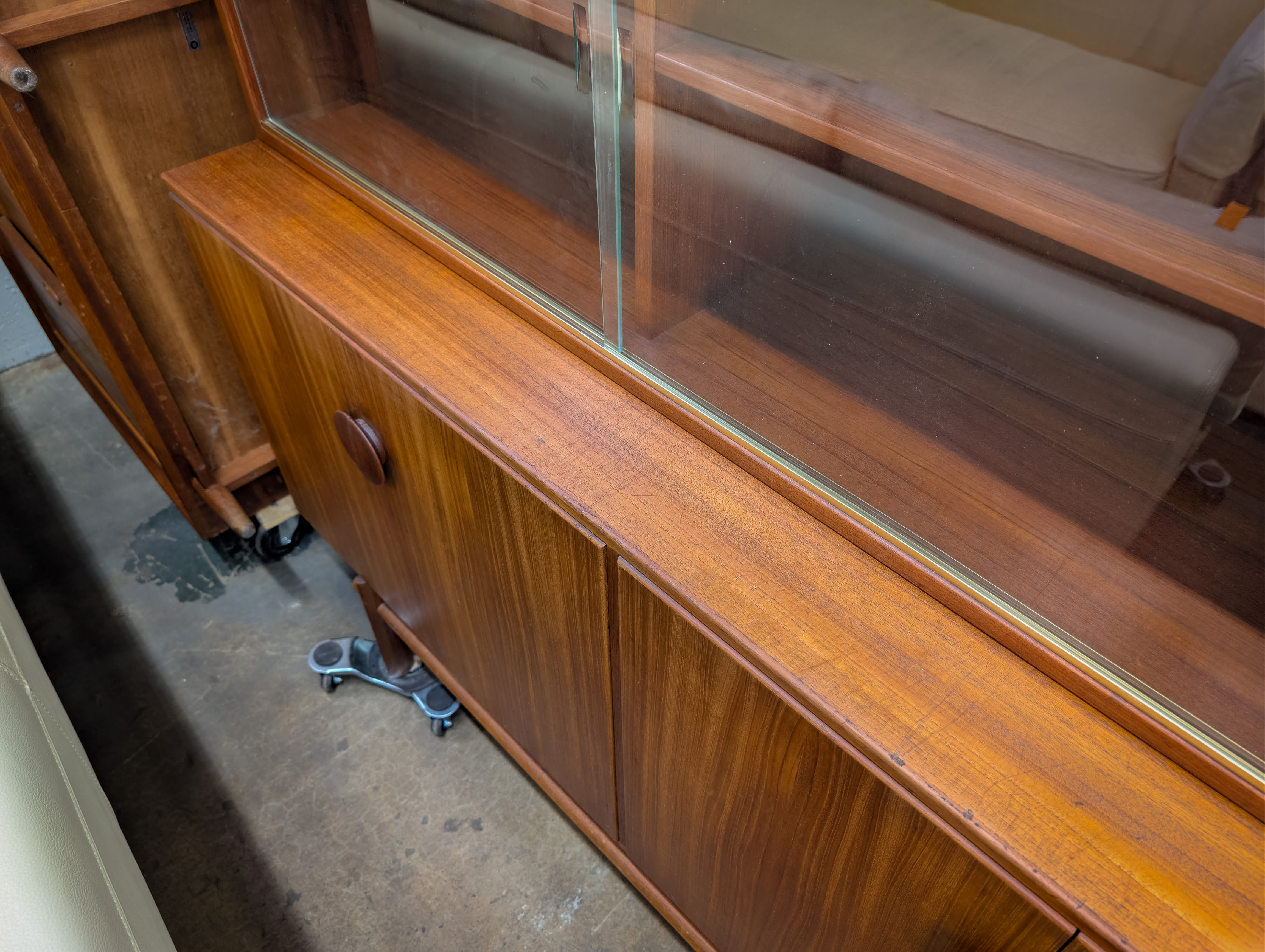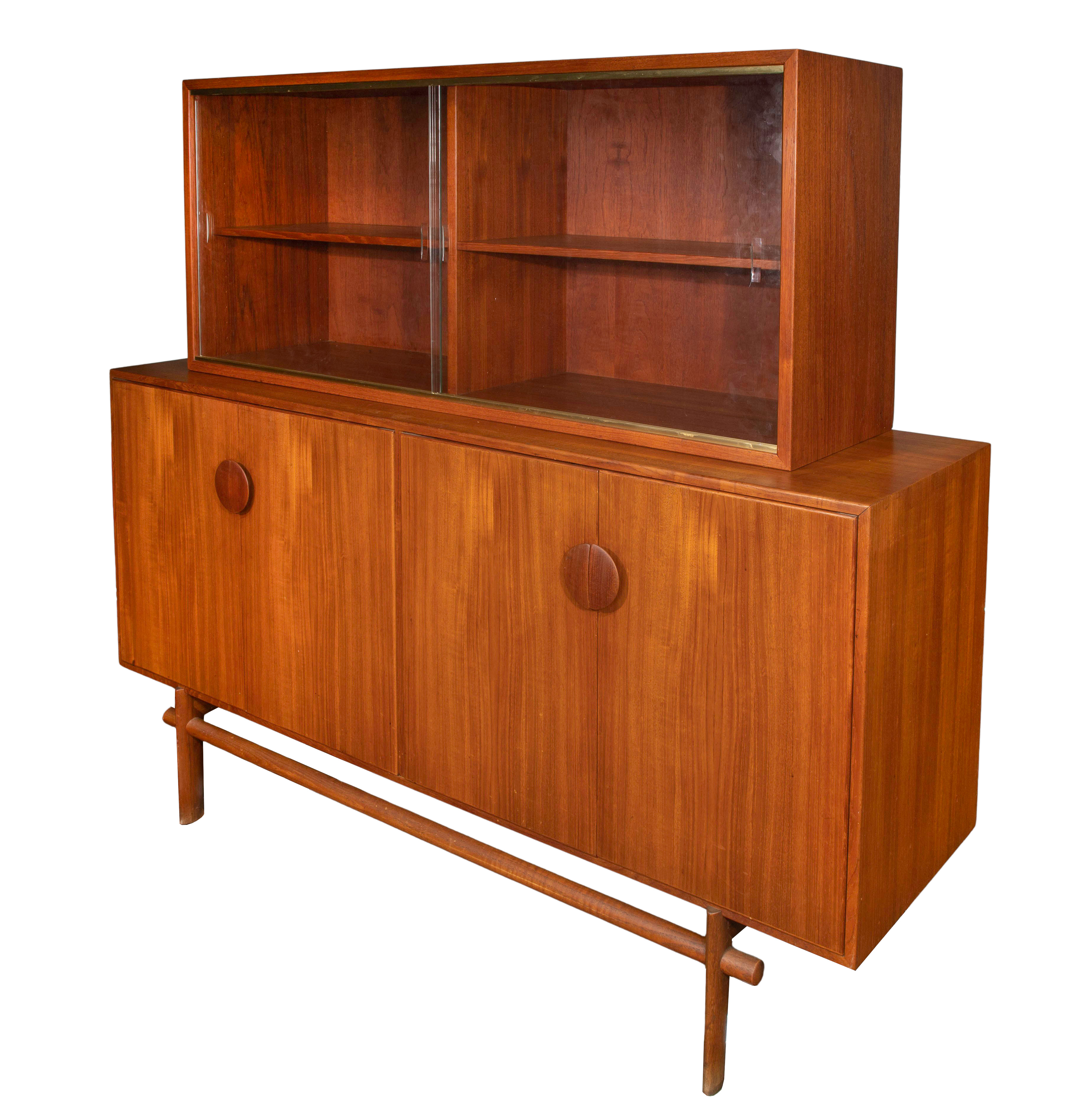 (2) c.1950 teak veneered items including a display case having sliding glass doors and a sideboard having pole style legs and distinctive wood pulls, doors opening up to top drawers and a shelf, manufacturer’s stamps on backsides