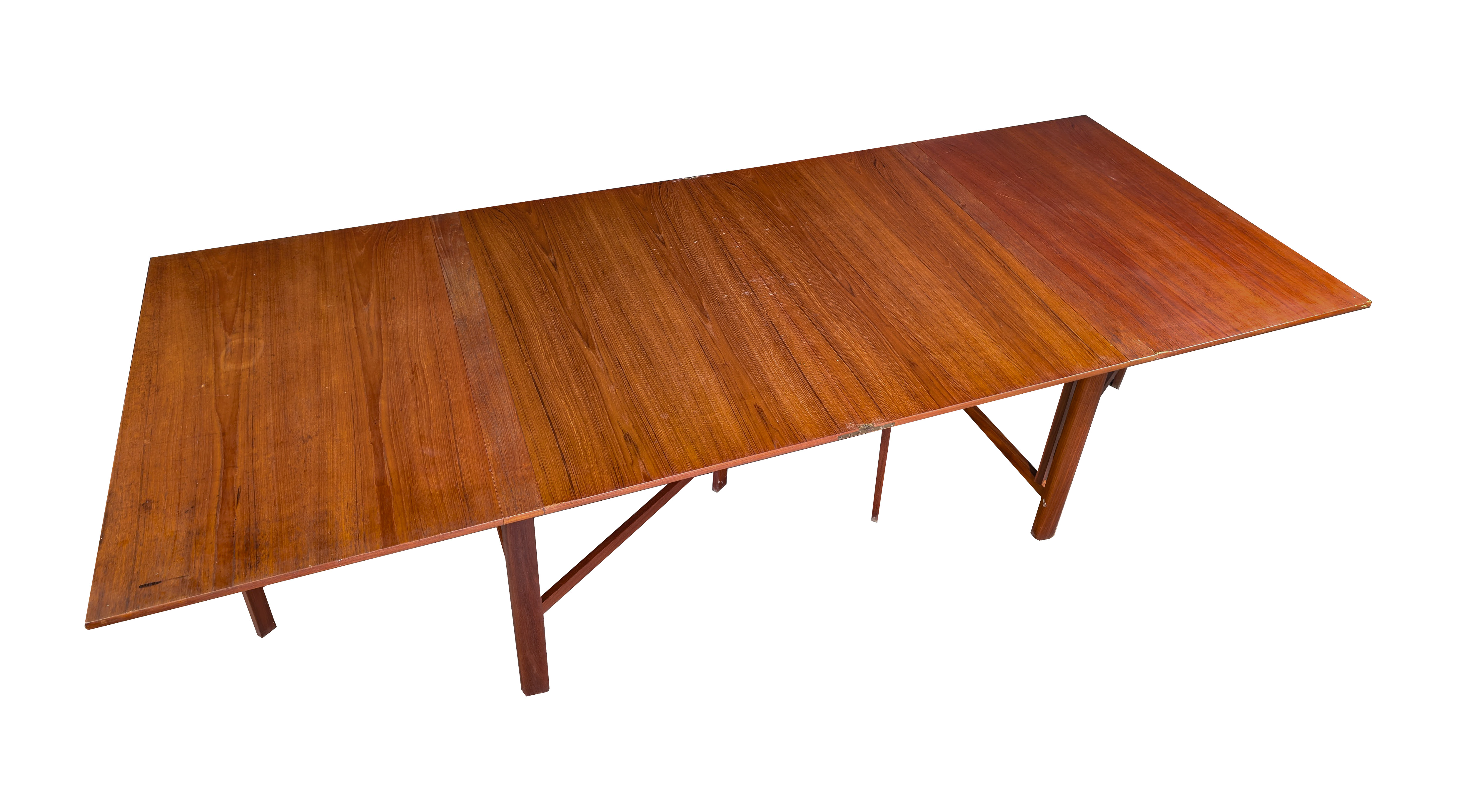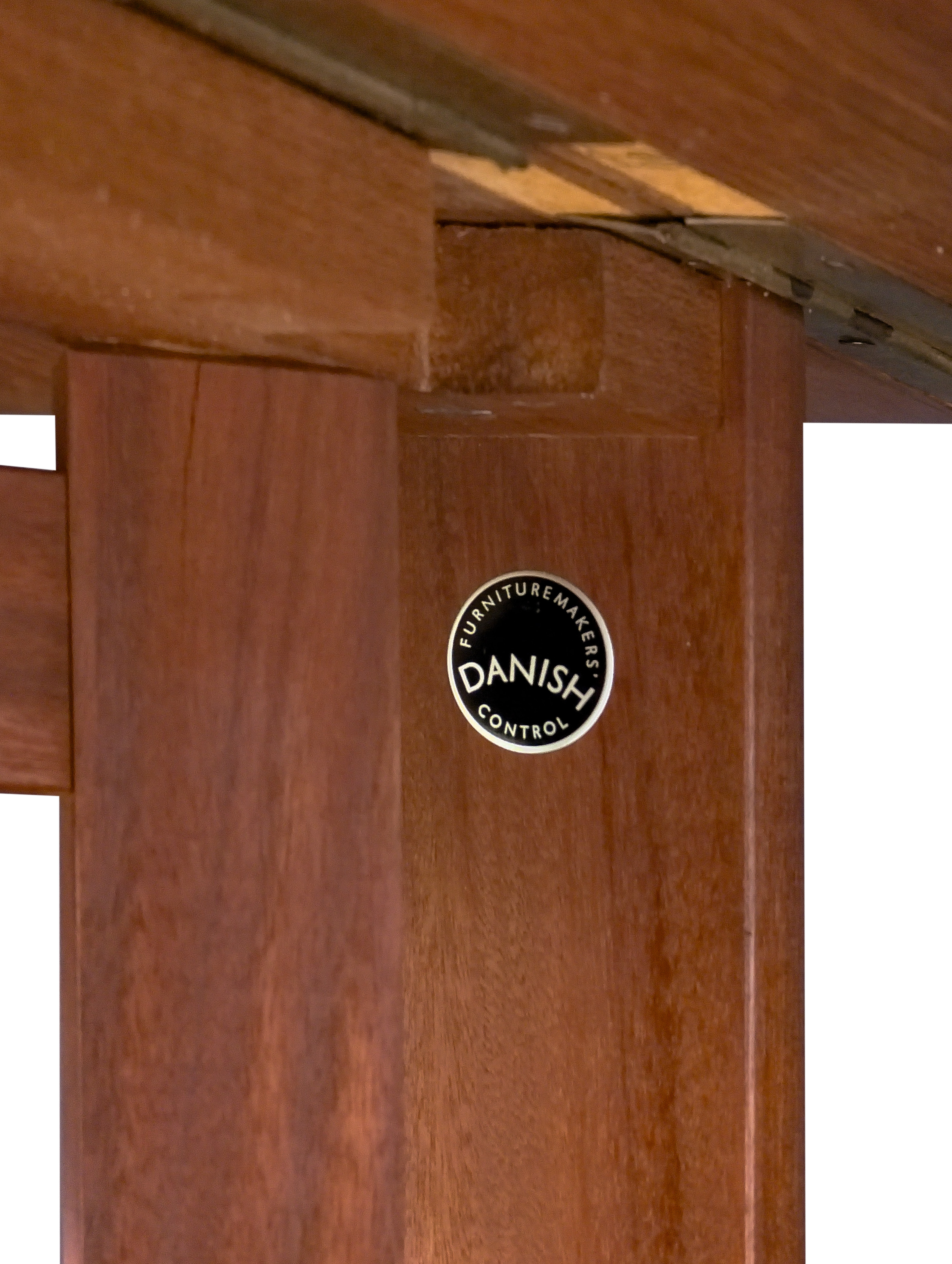 A c.1965 drop leaf and gate leg extension table in a teak veneer having ‘Danish Furniture Makers Control’ tags on legs
