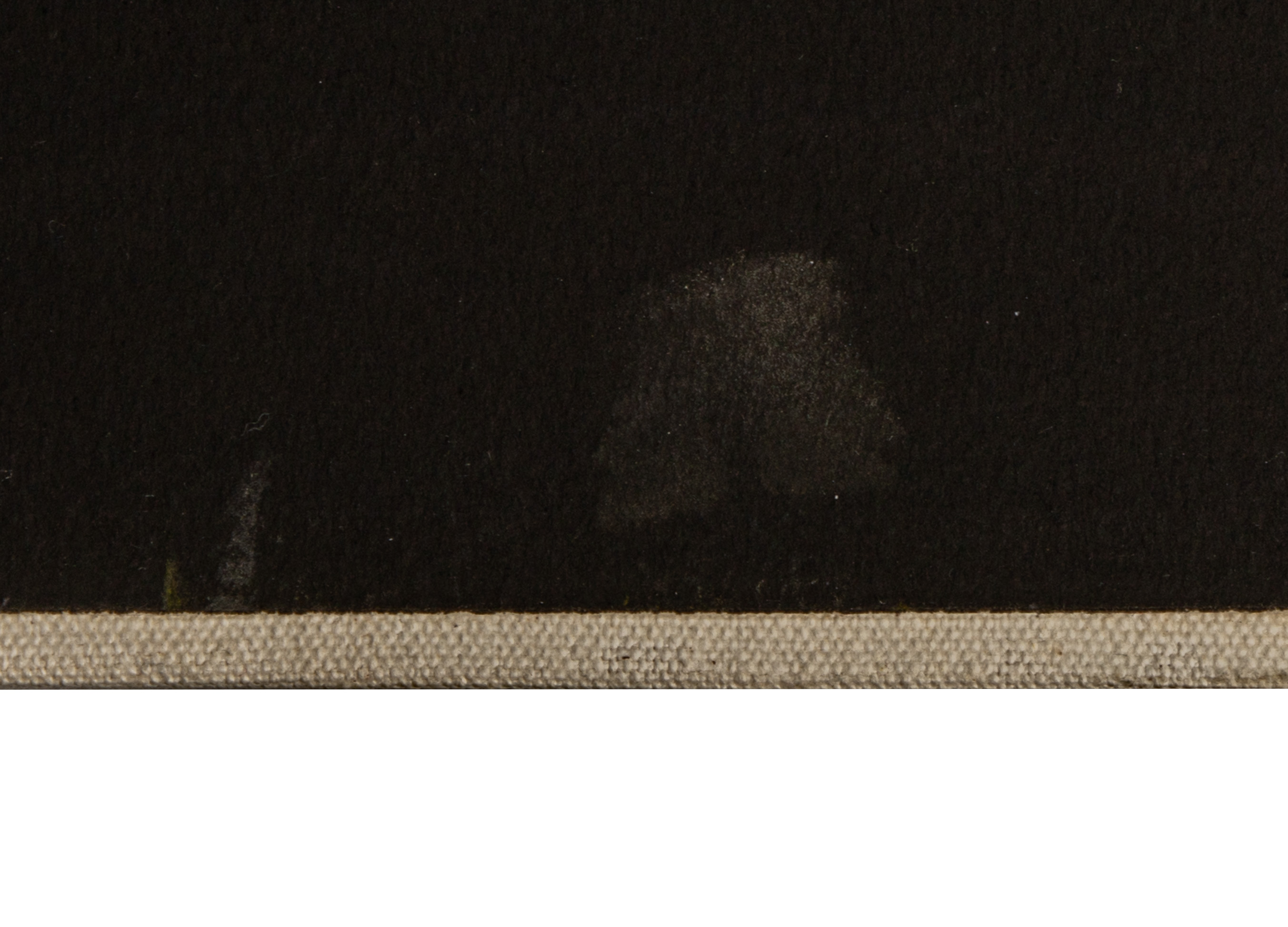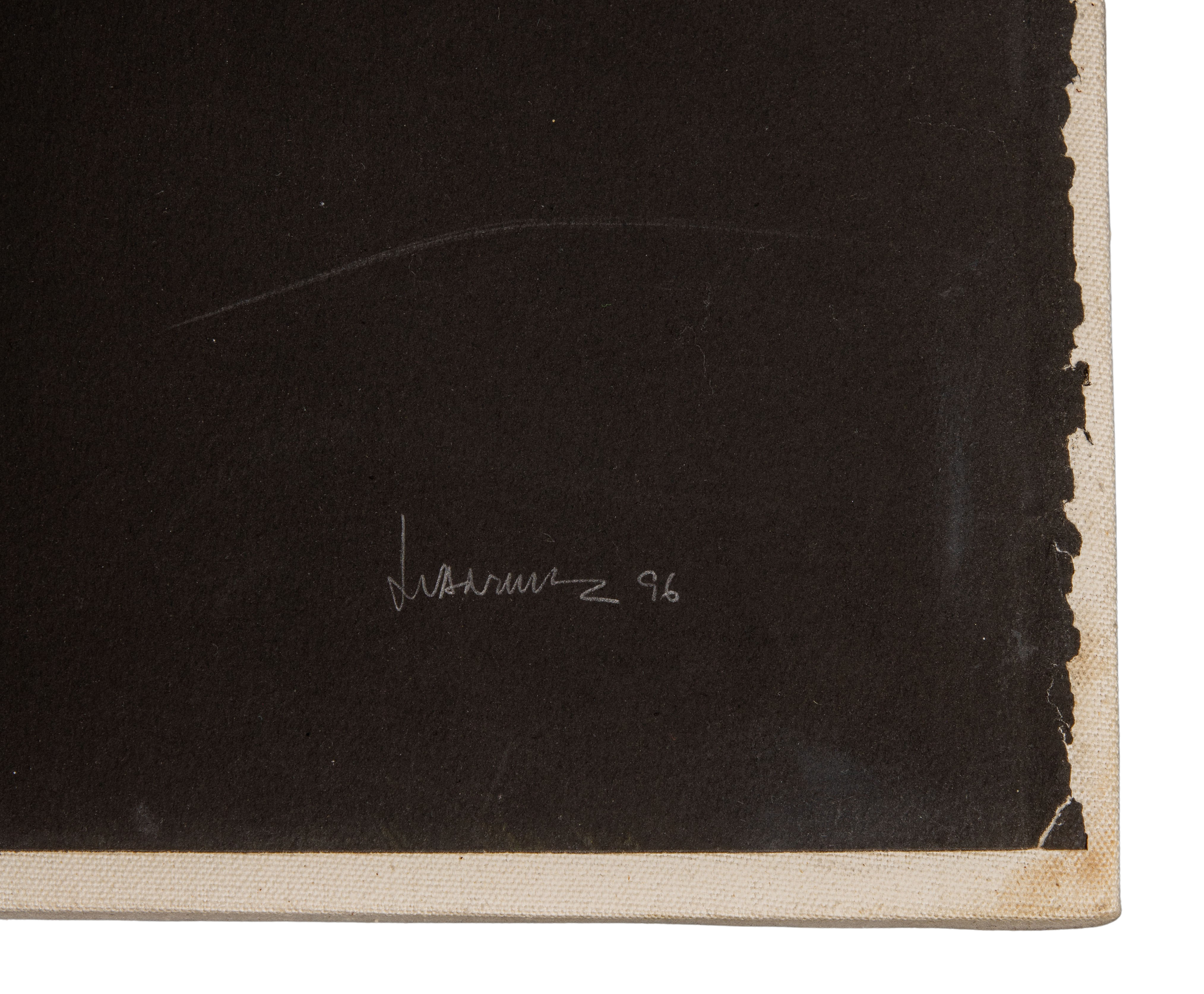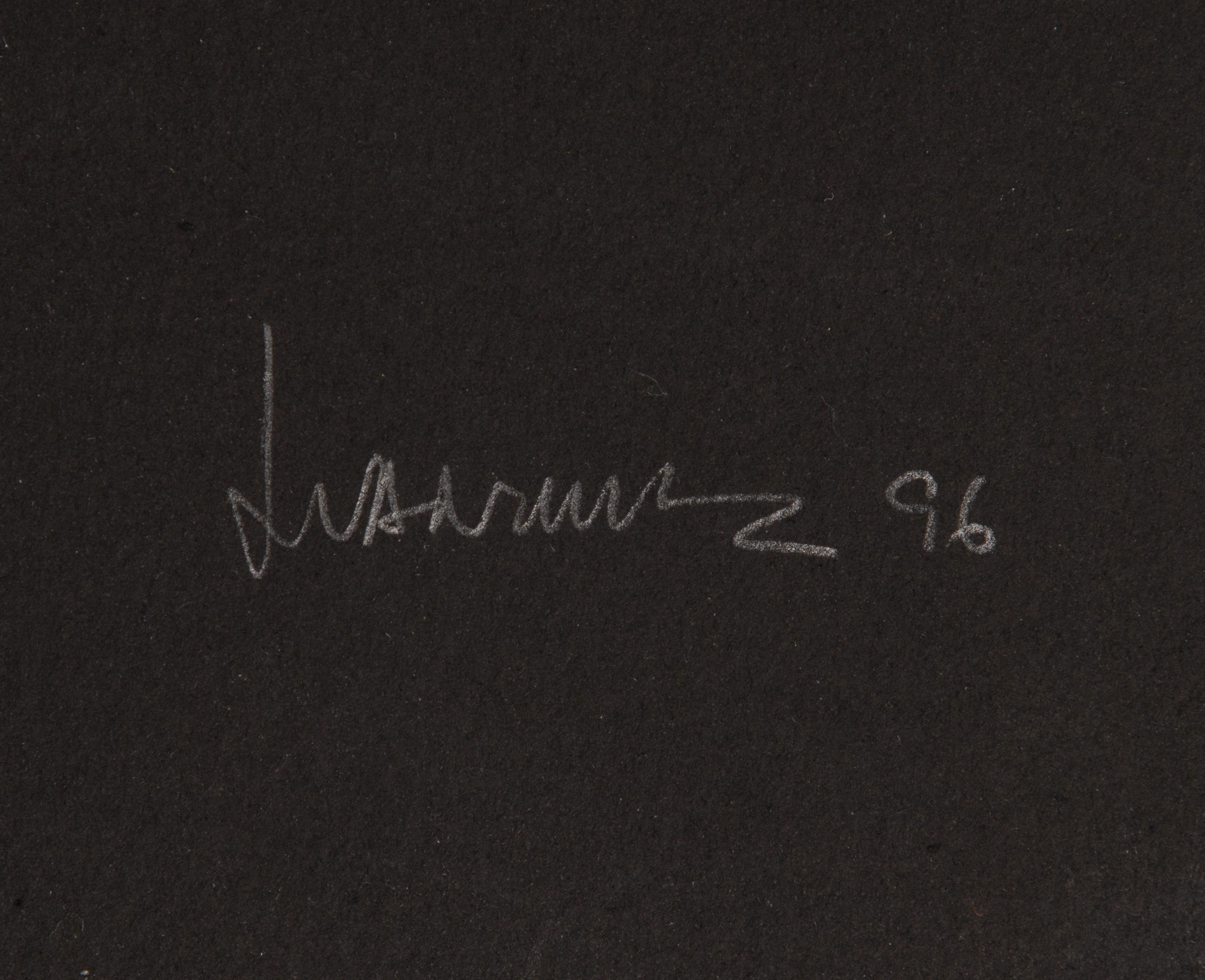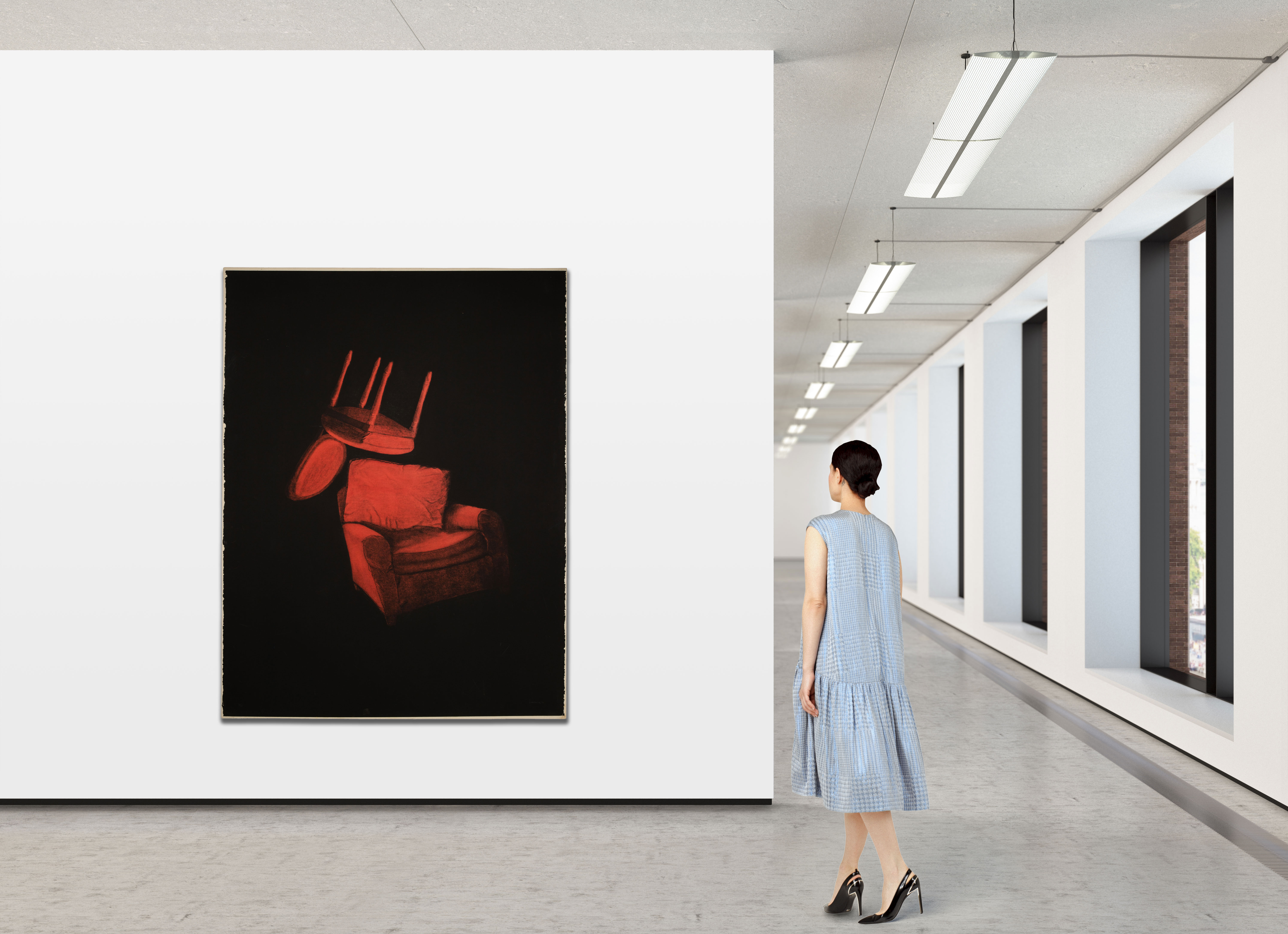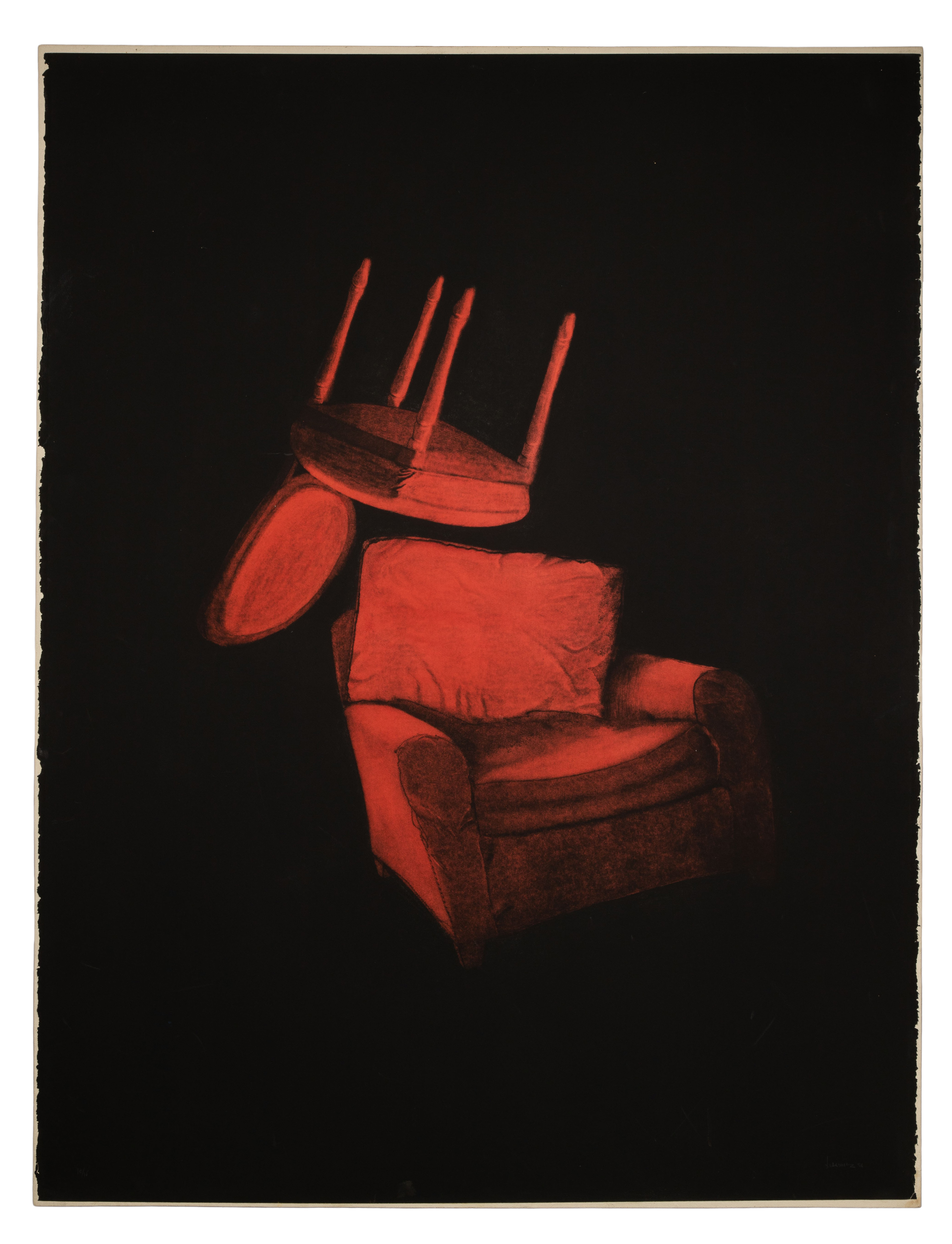 1996, signed, depicting red chairs free falling on a black background in drypoint and watercolor, laid down on canvas on stretcher, unframed, Galleria OMR, Mexico City, Mexico label to back of stretcher giving artist and media