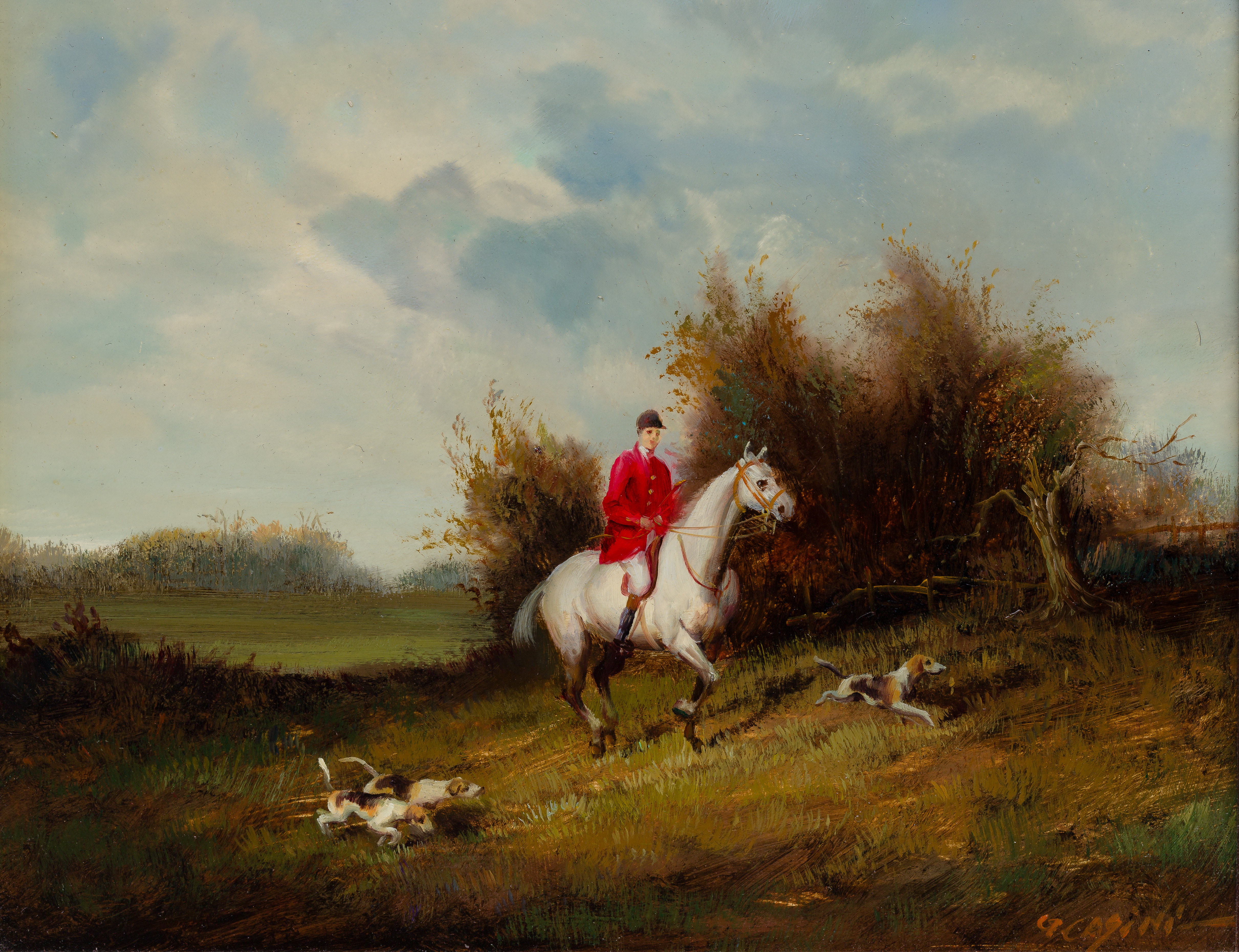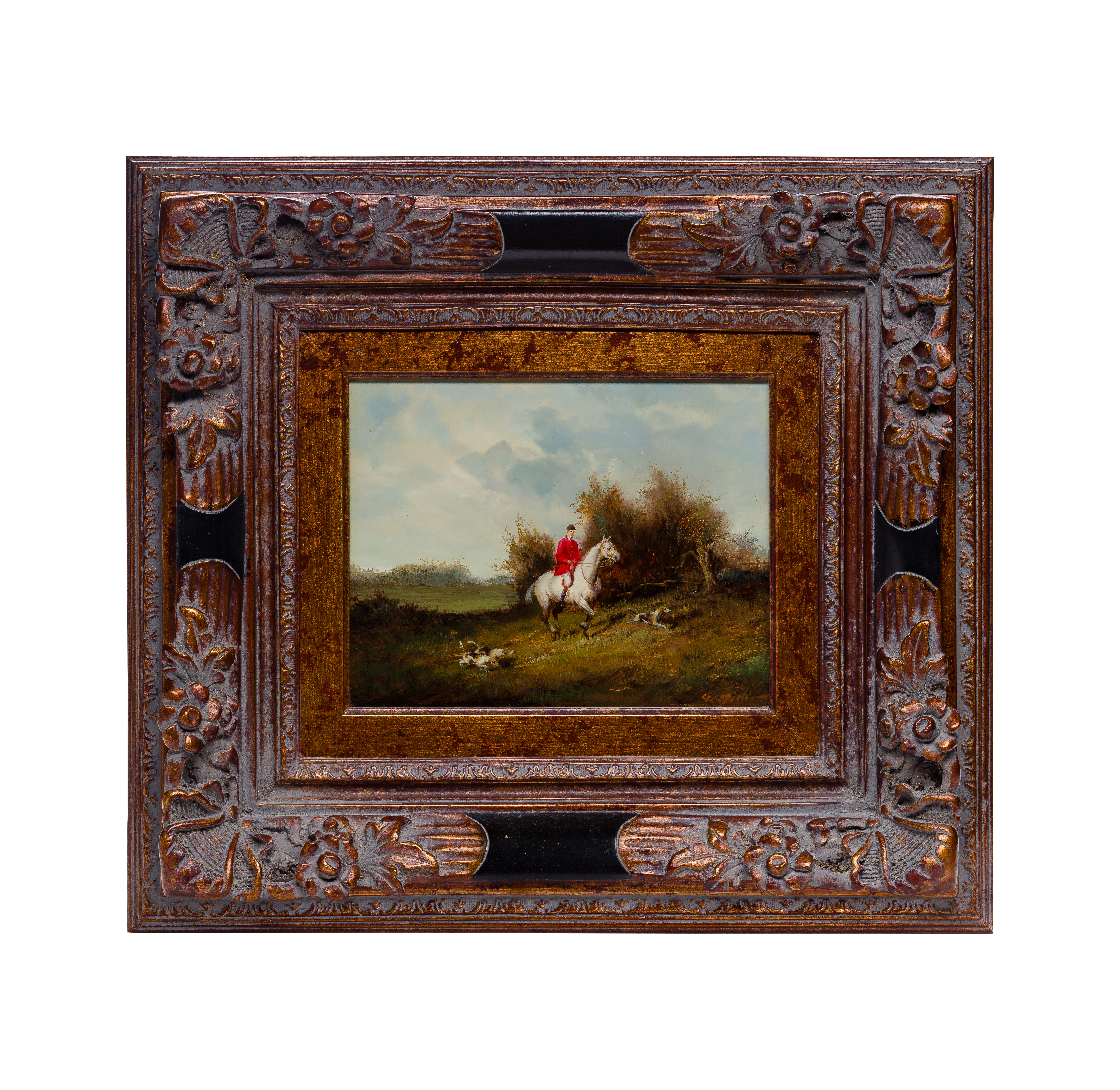 Undated, indistinctly signed (perhaps Cazini), depicting horse, rider and hounds hunting, in a bronze-tone carved wood frame
