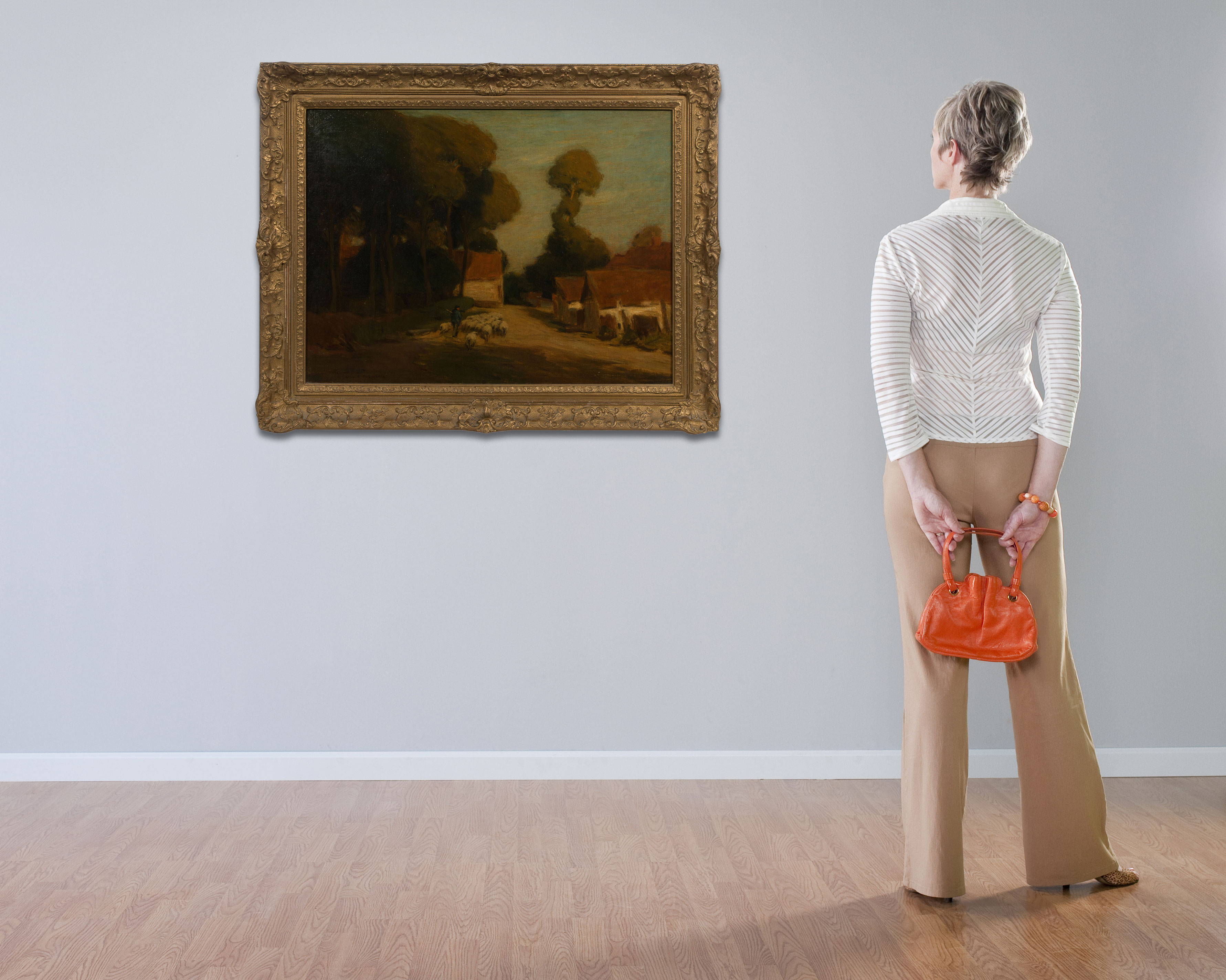 Undated, signed, depicting a sheep herder and their flock, in a gold-tone gesso on wood frame