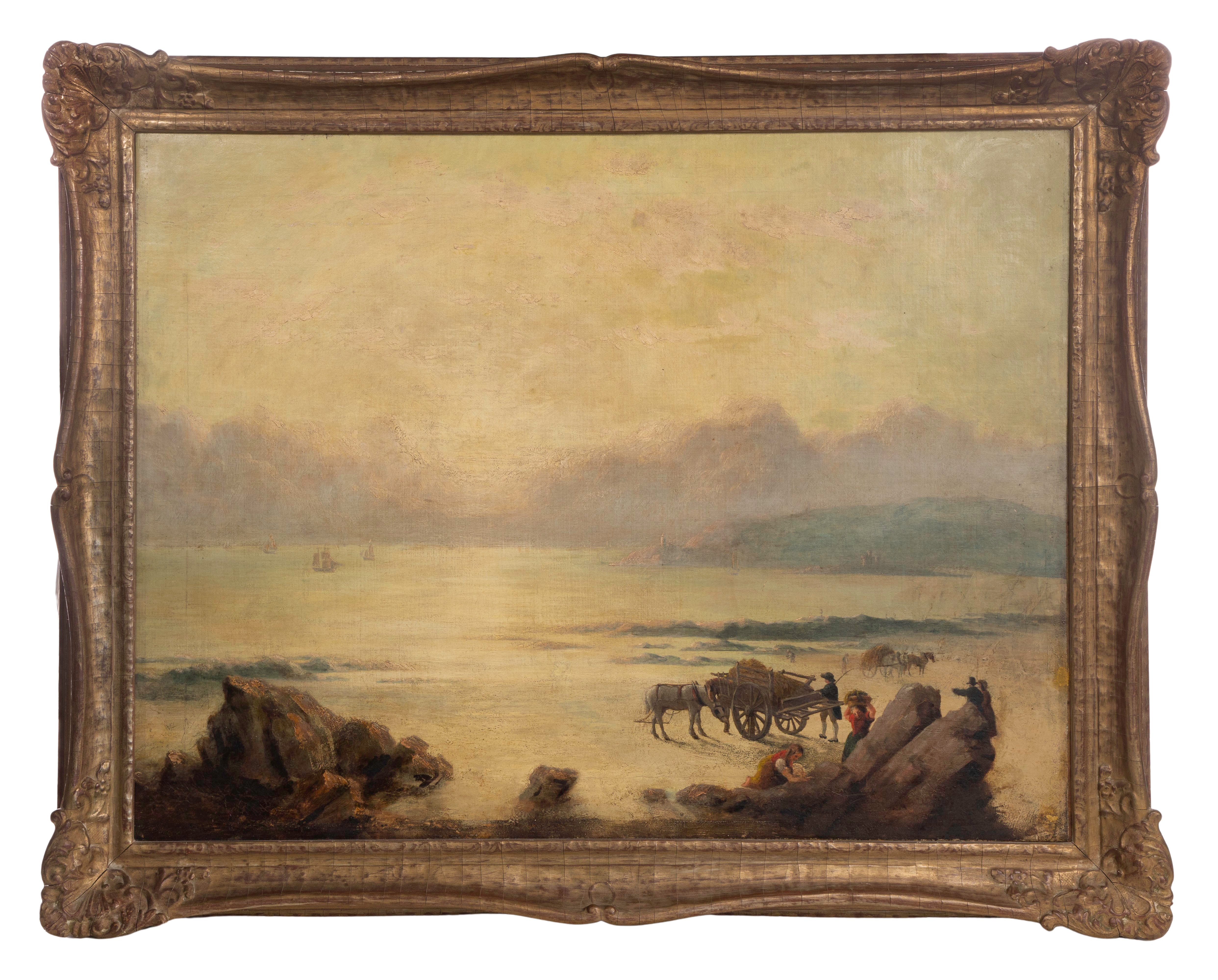 Undated, unsigned, depiction of activities on a beach on a foggy morning, sailboats in the distance, in a gold-tone gesso on carved wood frame
