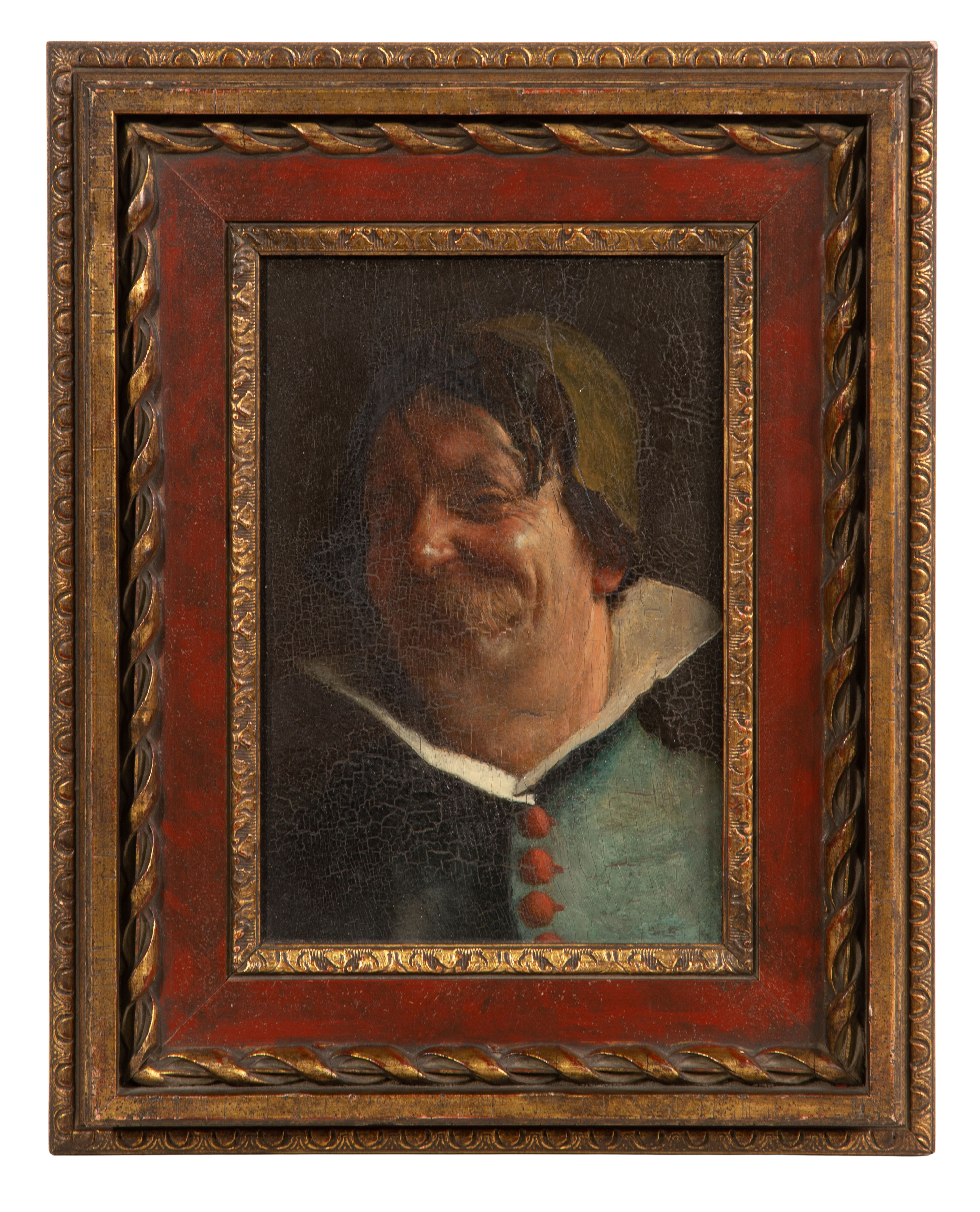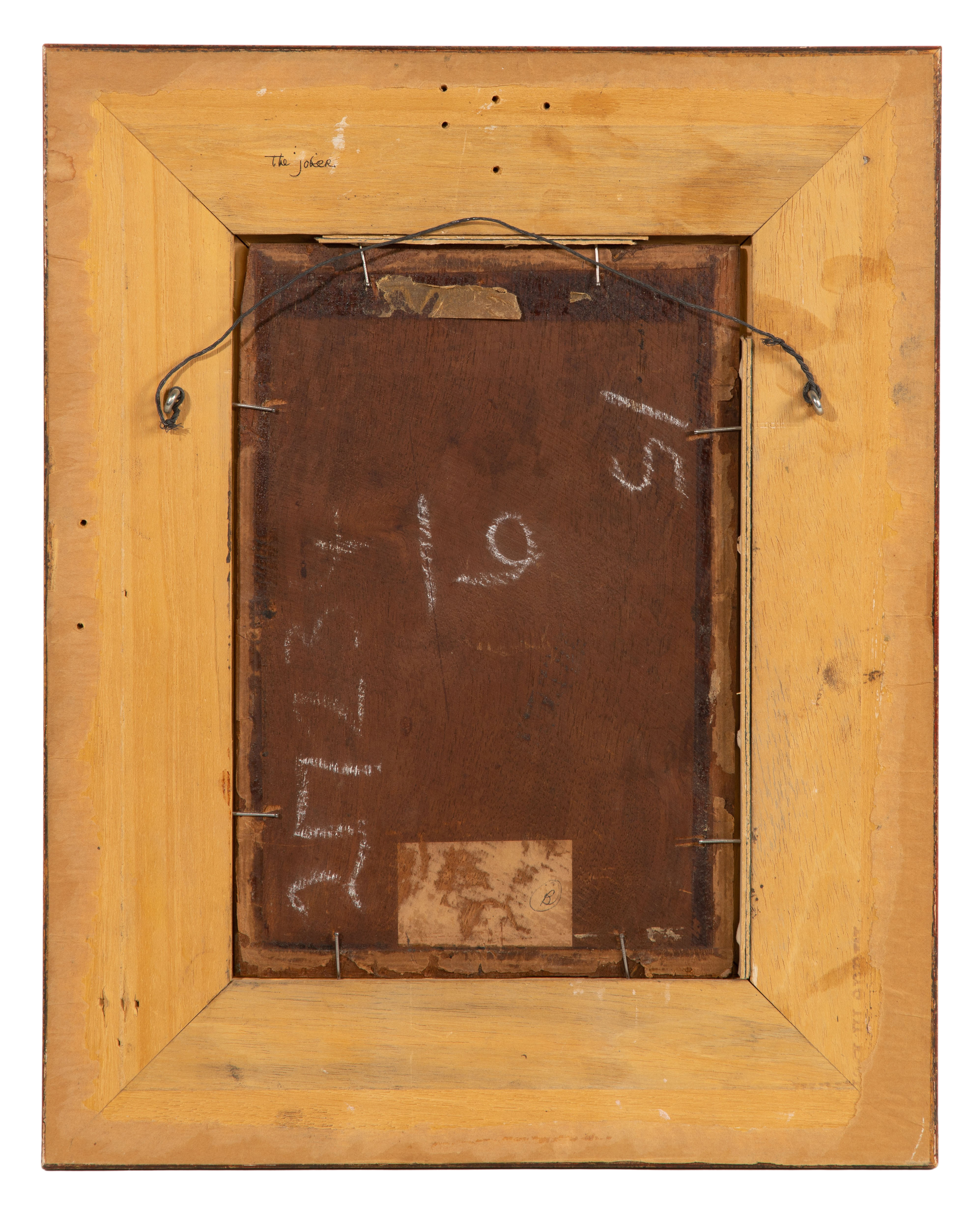 Undated, unsigned, depicting a mustached man in a jester’s costume, in a painted wood frame