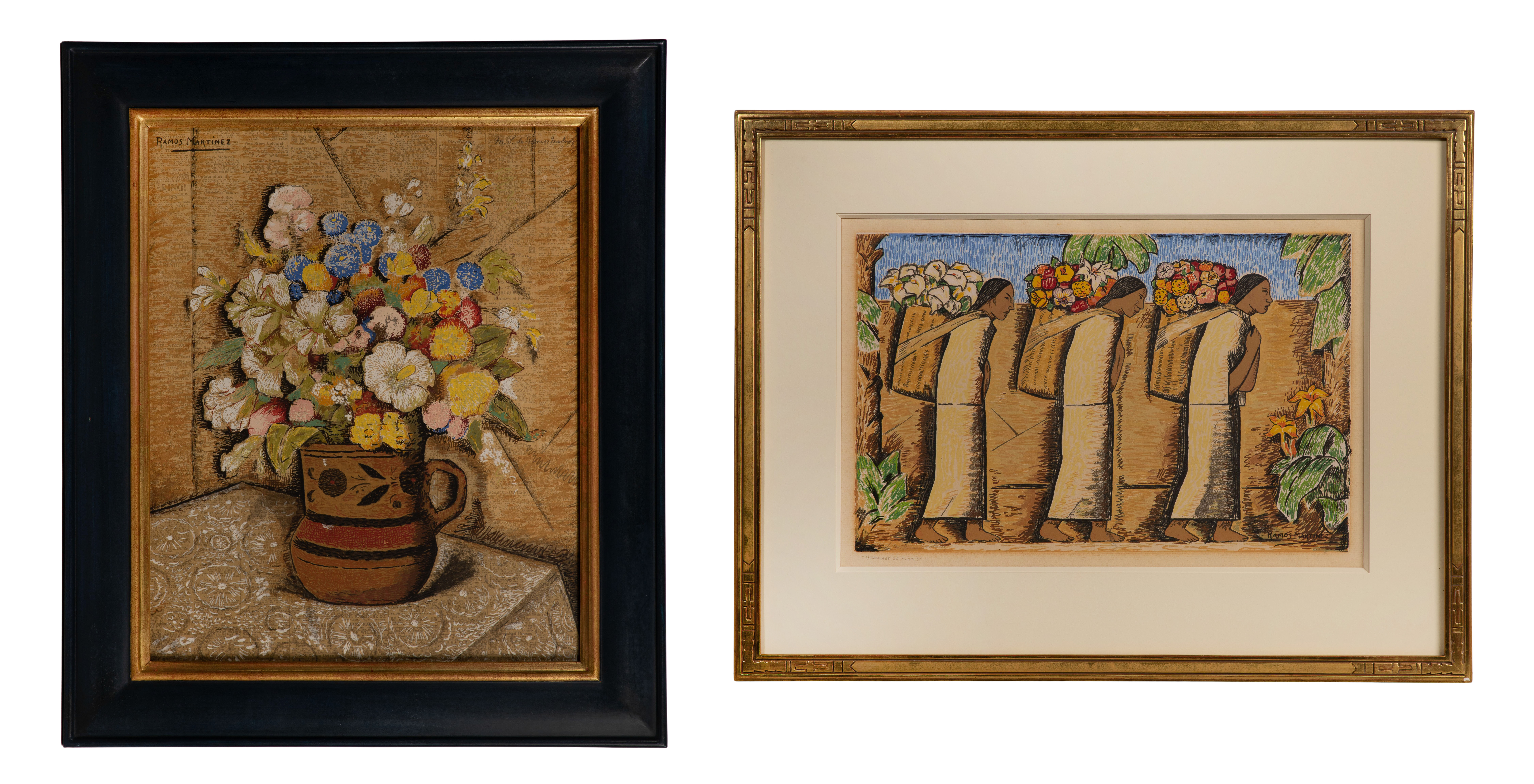 (2) undated items, signed, including ‘Vendedores de Flores’ depicting women carrying sacks filled with flowers and ‘Flores’ a floral still life, both framed under acrylic in painted wood frames, retaining William Talbot Fine Art, Santa Fe gallery label verso