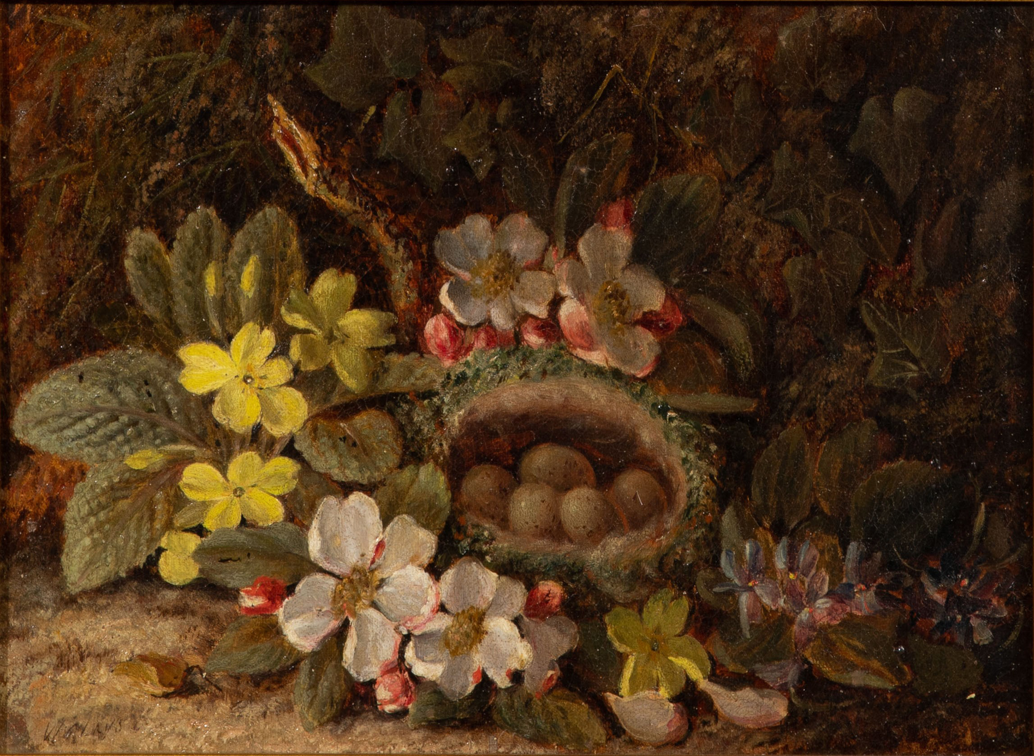 Undated, signature appears to read ‘W.C. Lays’, depicting flowers and a bird’s nest having eggs on a mossy bank, in a gilt frame