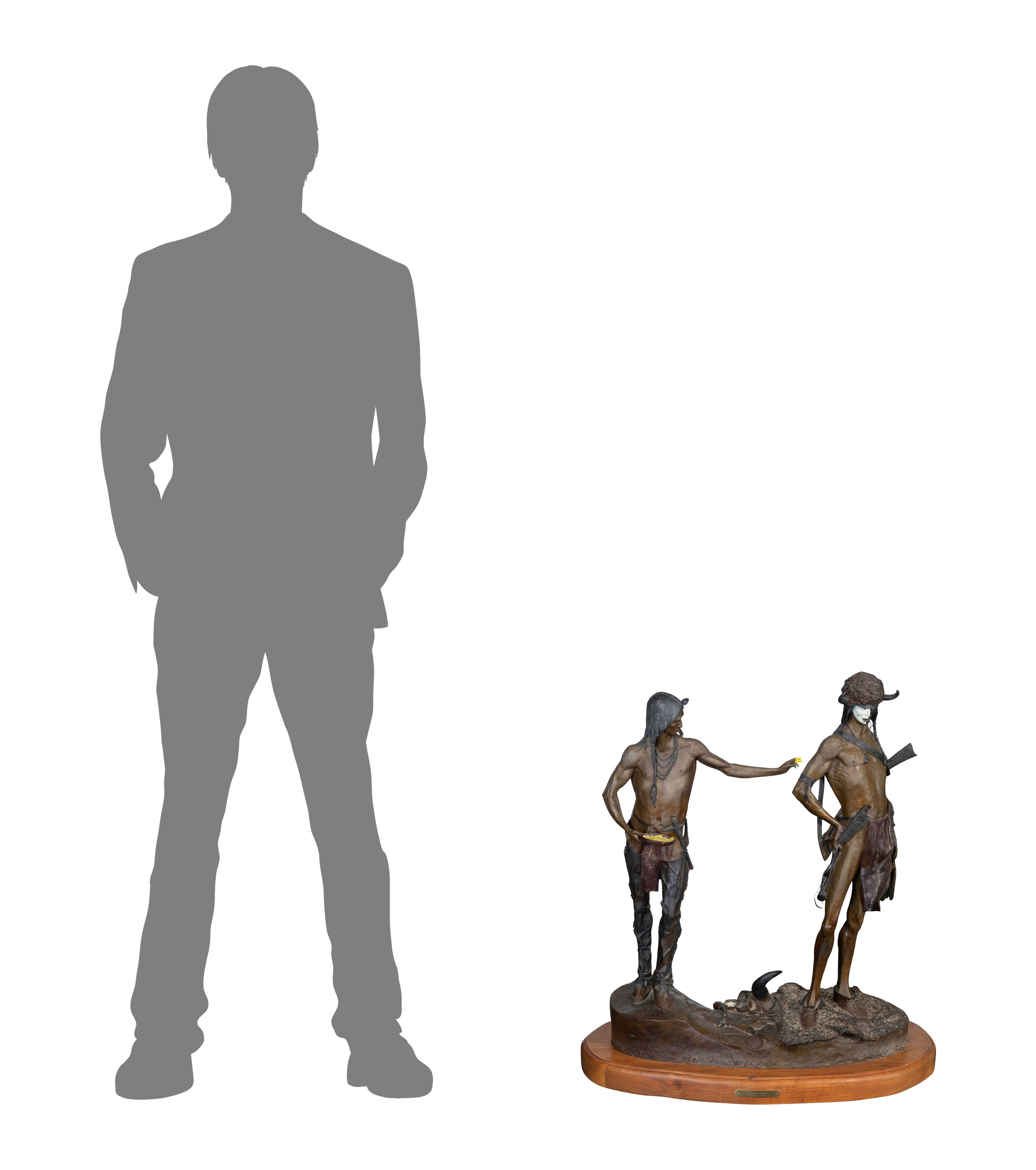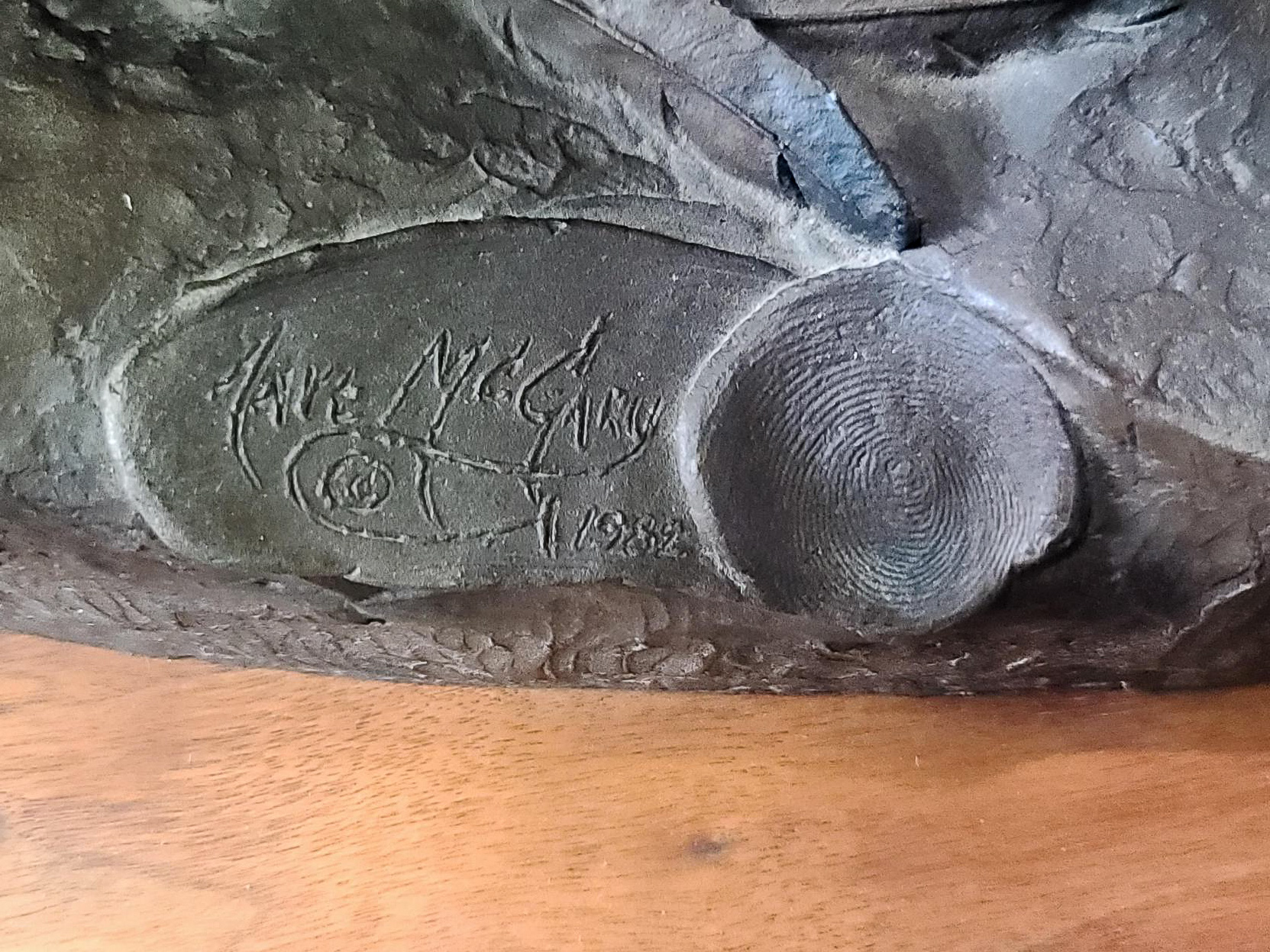 1982, signed in casting, thumbprint avatar, depicting two figures, on a wood base