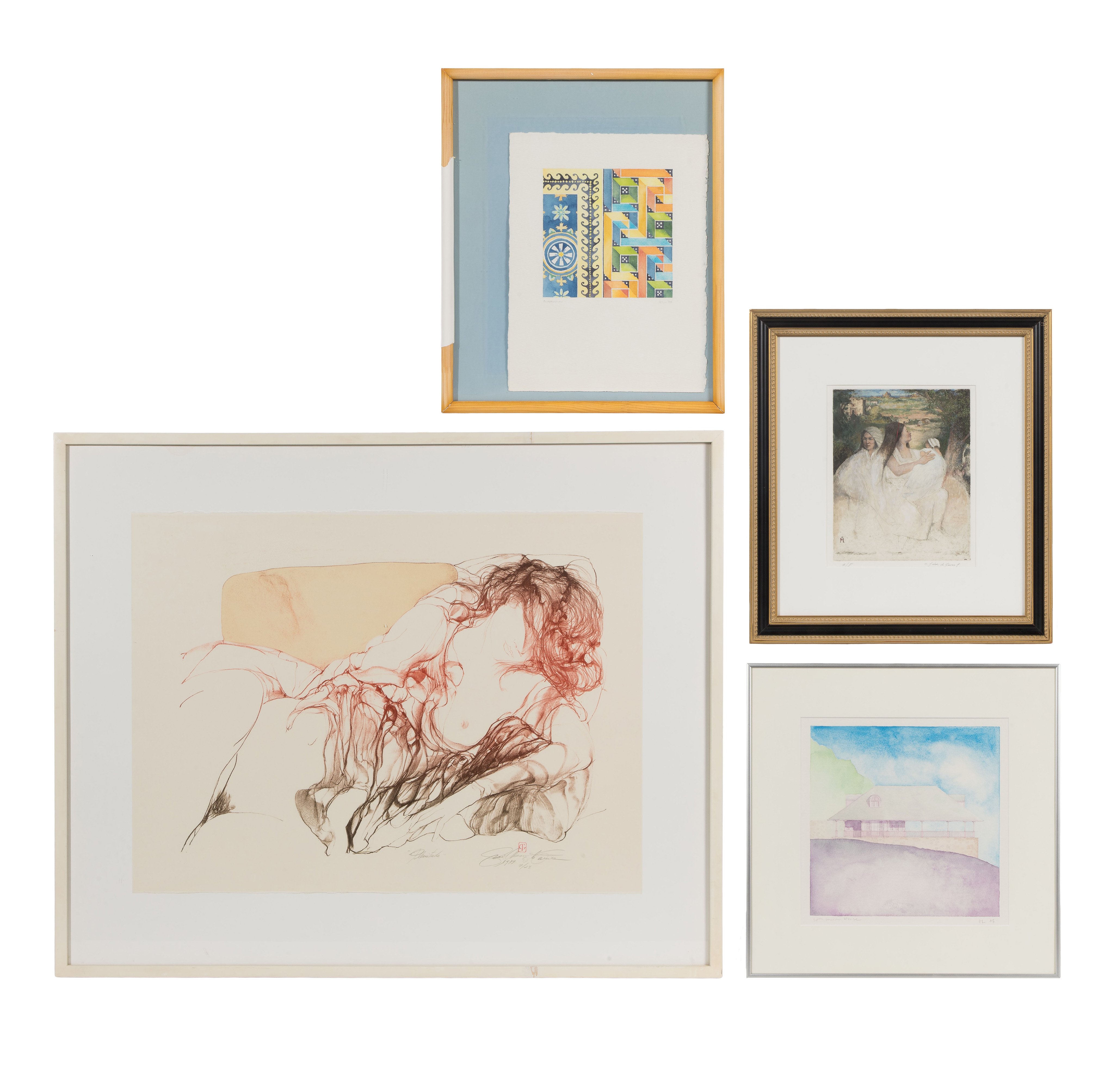 (4) items including a Guilherme Faria (Brazil, b.1942) lithograph depicting a recumbent nude, pencil signed and dated 1979, #7/28, float mounted behind acrylic in a white wood frame, a Sergio Ladron de Guevara (Mexican / American, 20th century) etching depicting a young family, pencil signed and ‘a/p’, matted behind glass in a gold-tone and black wood frame and (2) watercolors initialed ‘TL’ (one attributed to Tannys Langdon on label verso) behind glass in wood and metal frames