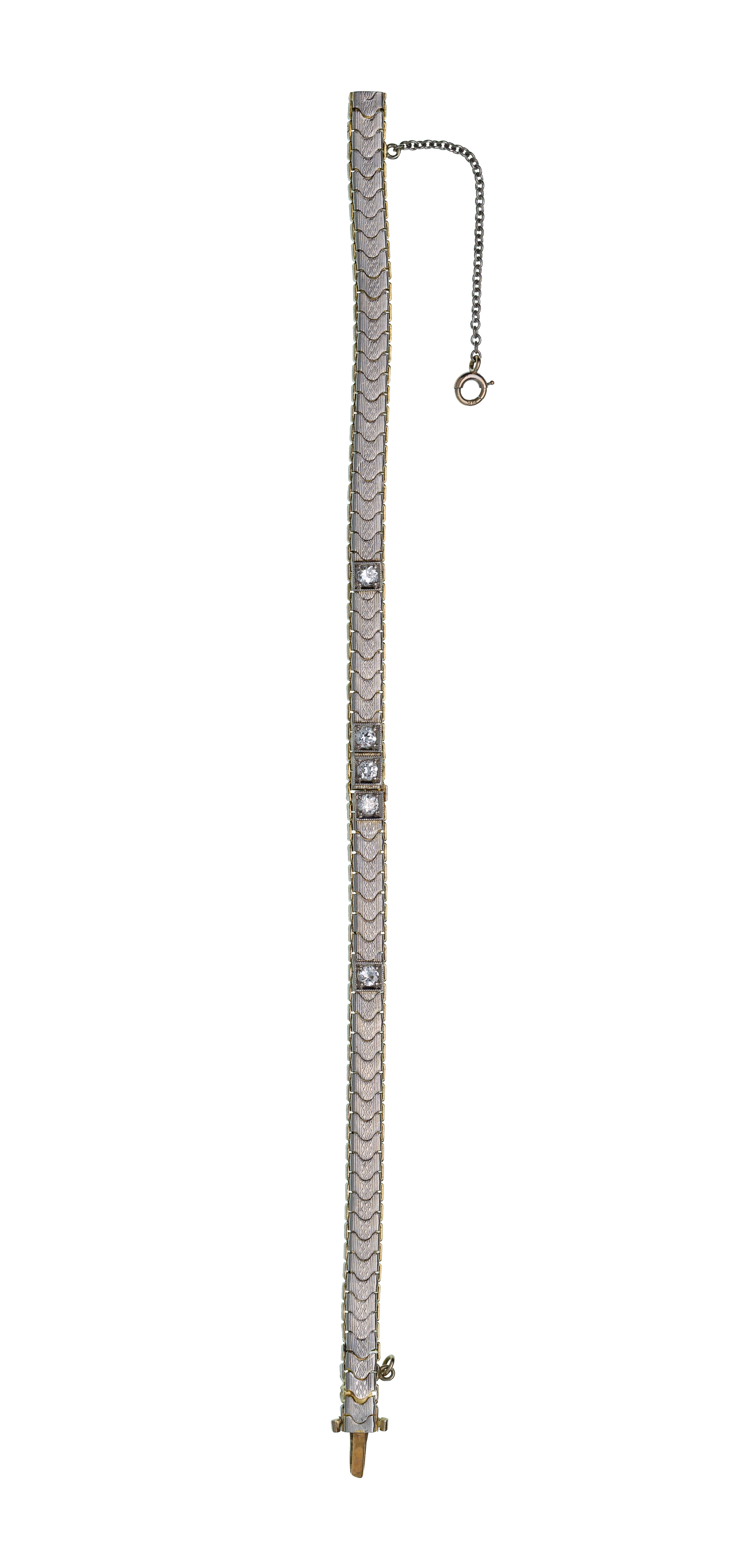 Two-tone link bracelet embellished by five round cut diamonds (unmarked platinum and gold, safety clasp marked ’14k’)