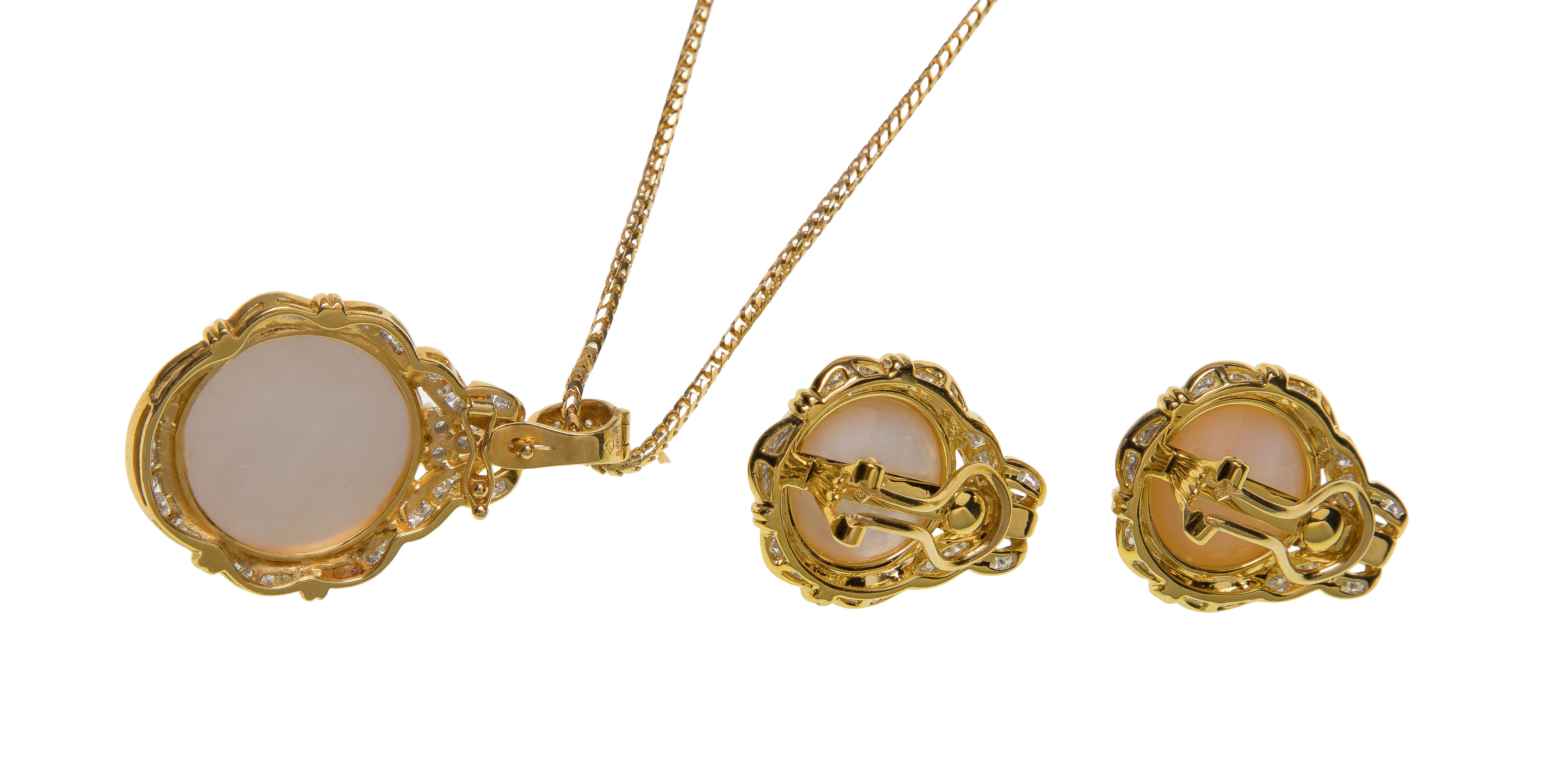 (2) items including an approximately 12mm mabe pearl surrounded by a circle of accent diamonds pendant on a necklace and a pair of matching approximately 15mm mabe pearl clip style earrings (marked ’18k’ / ‘750’)
