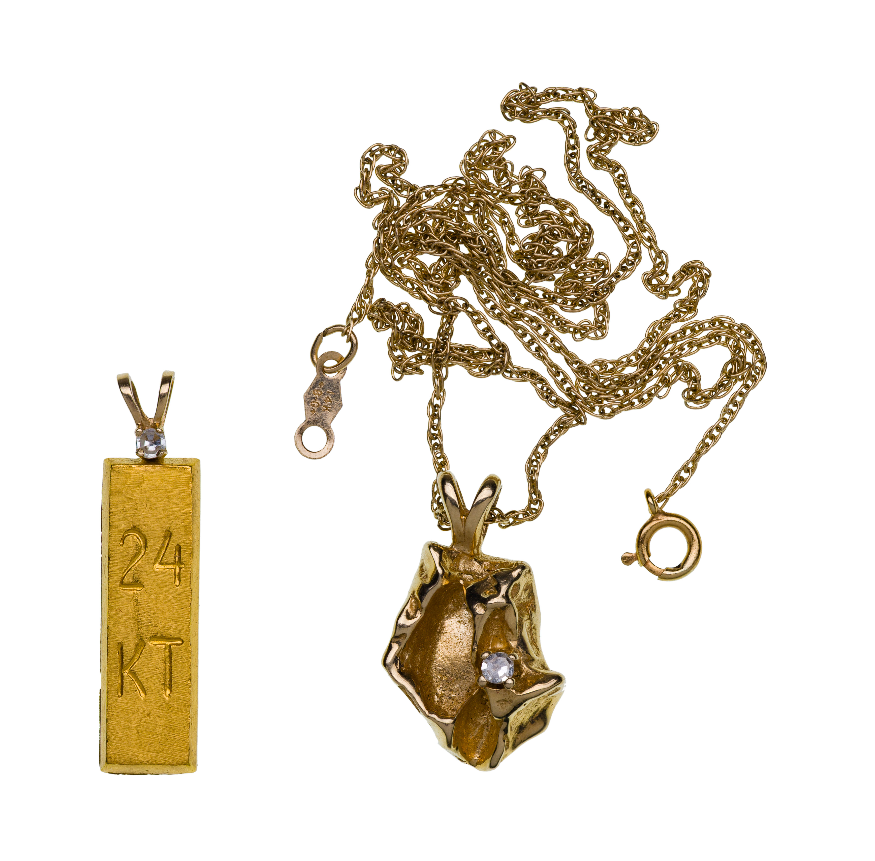 (2) items including a bar pendant engraved ’24k’ topped by a diamond accent and a free form nugget pendant having a diamond accent on a necklace (unmarked)