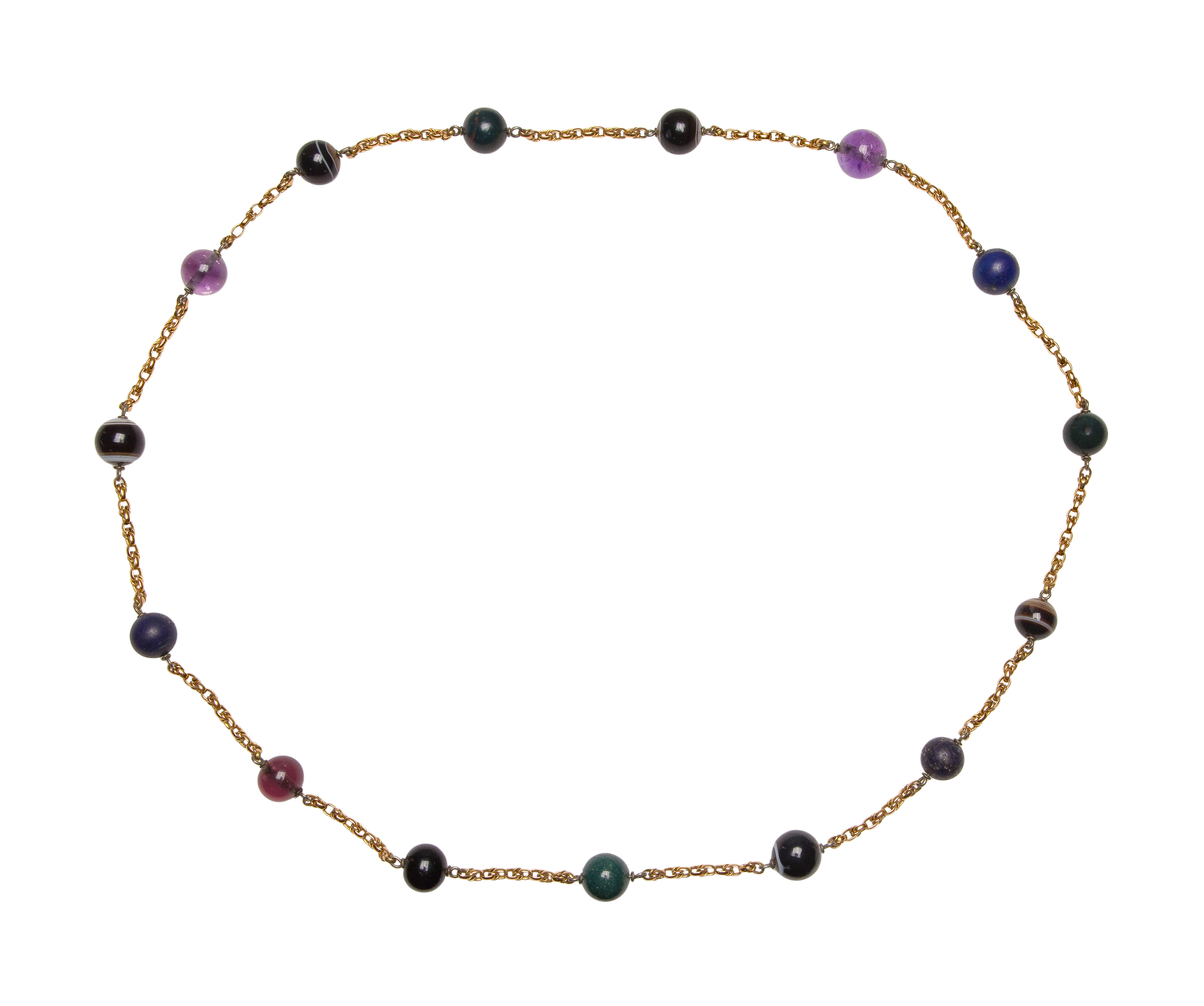 A chain link style having beads of various colors and stones (unmarked 18k)