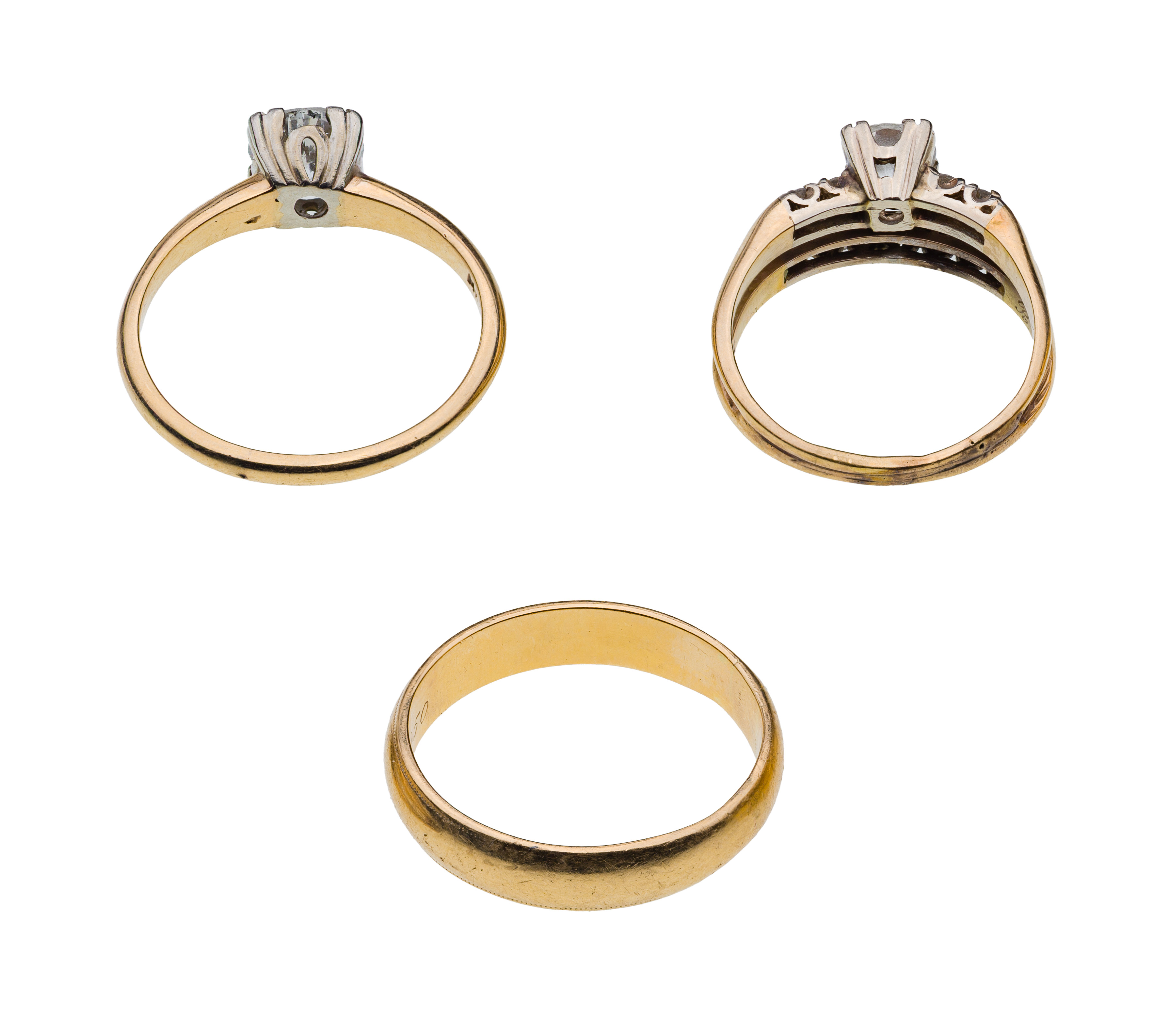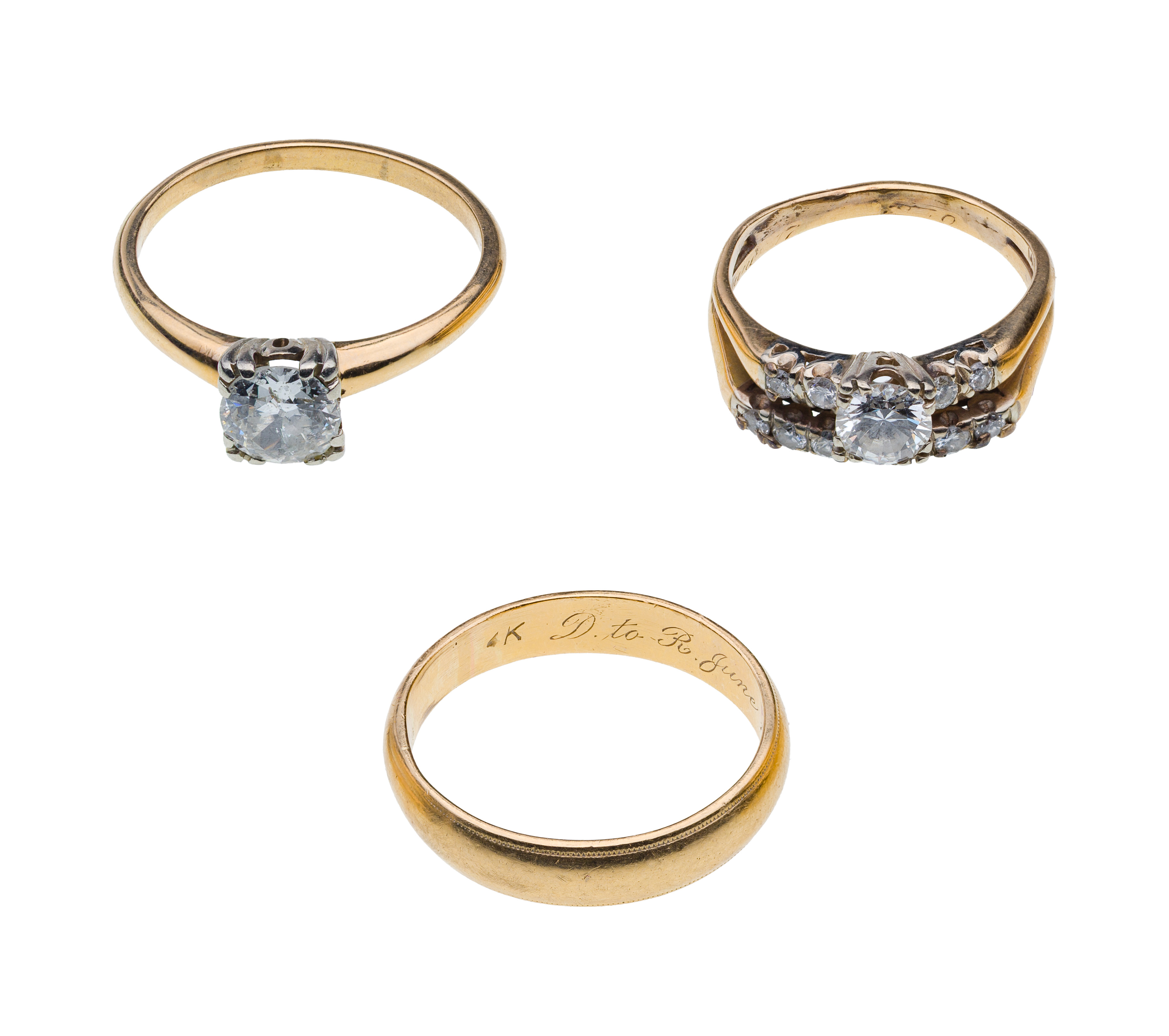 (3) items including a solitaire round cut diamond in a square setting, a round cut diamond wedding set including a solitaire engagement ring connected to a diamond band as well as a plain gold band (all marked ’14k’)