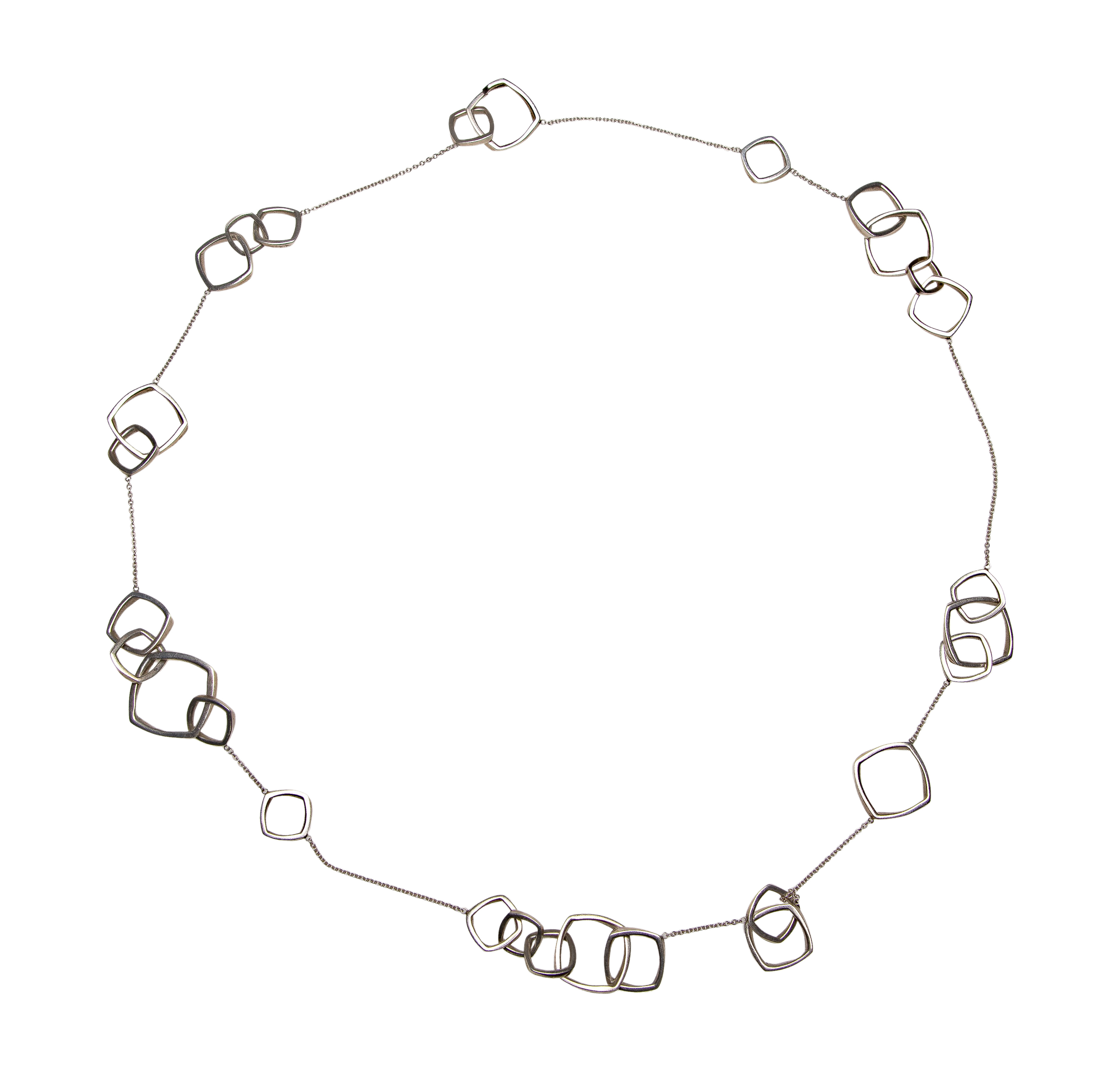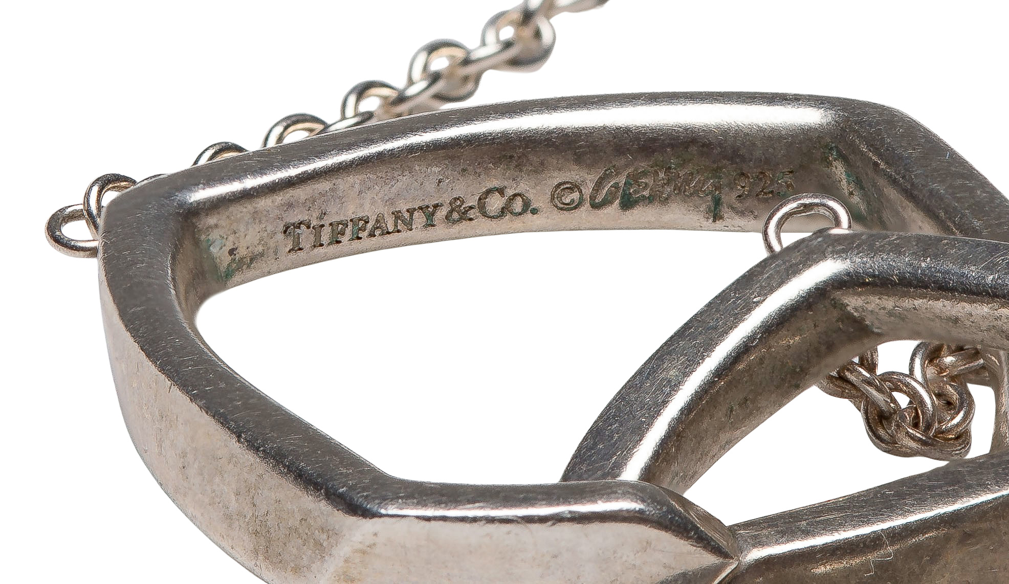 A geometric design having interconnected squares and twisted loops (marked ‘Tiffany & Co. Gehry 925’)