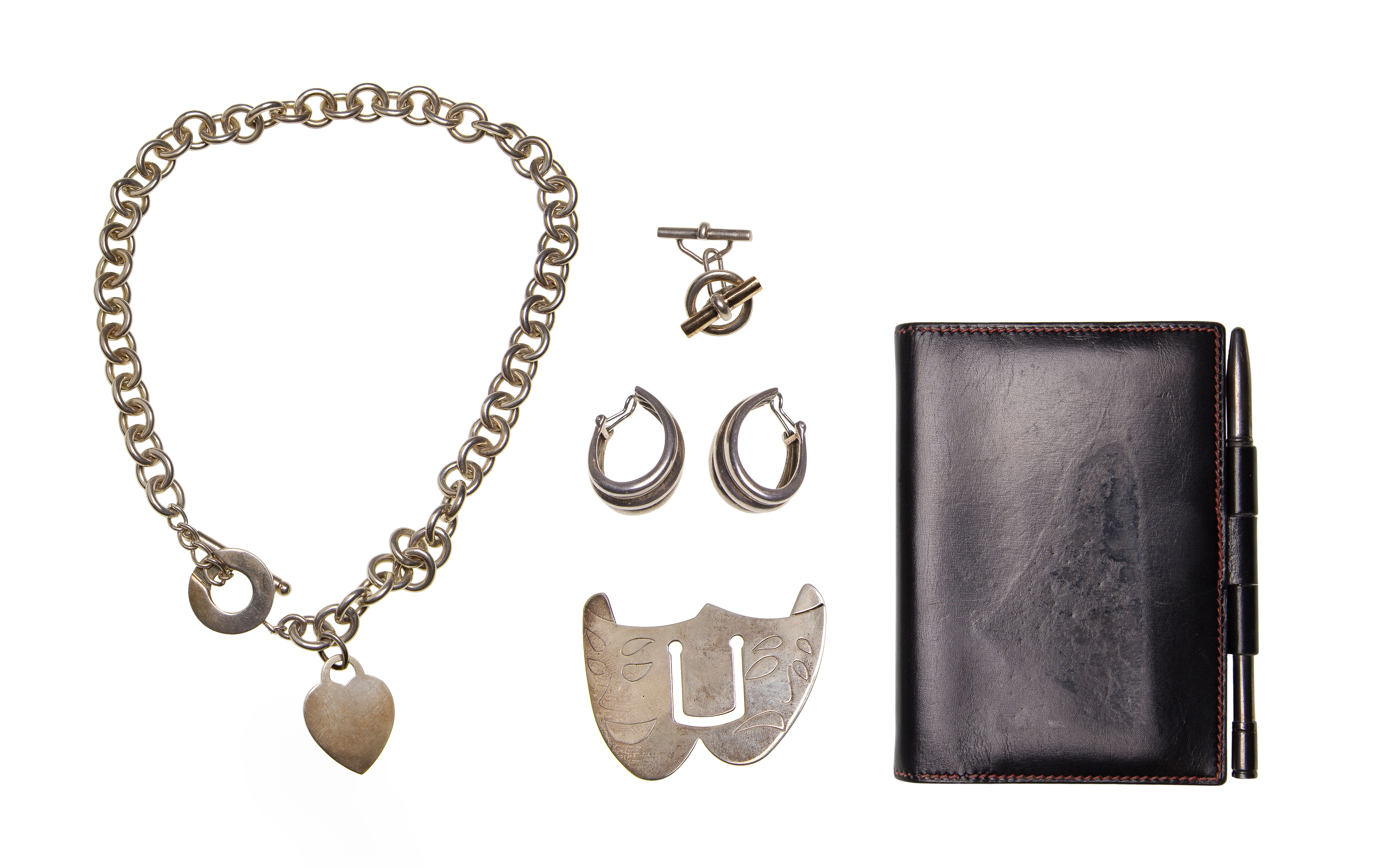 (5) items including a pair of clip earrings, a notebook card holder having silver pen and a singular cufflink (marked ‘Hermes’) as well as a marked ‘Tiffany’ toggle heart necklace and a bookmark (marked ‘925’)