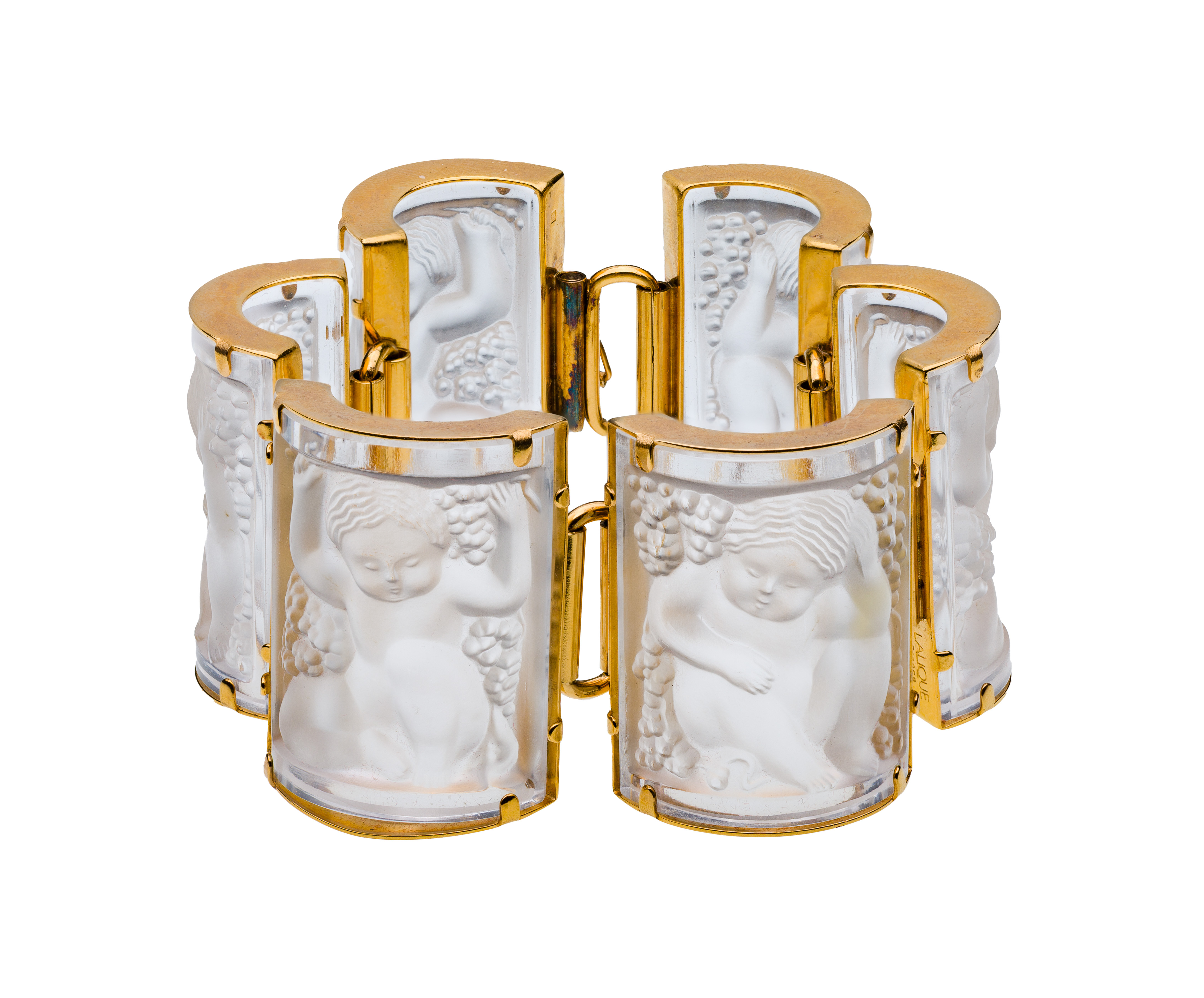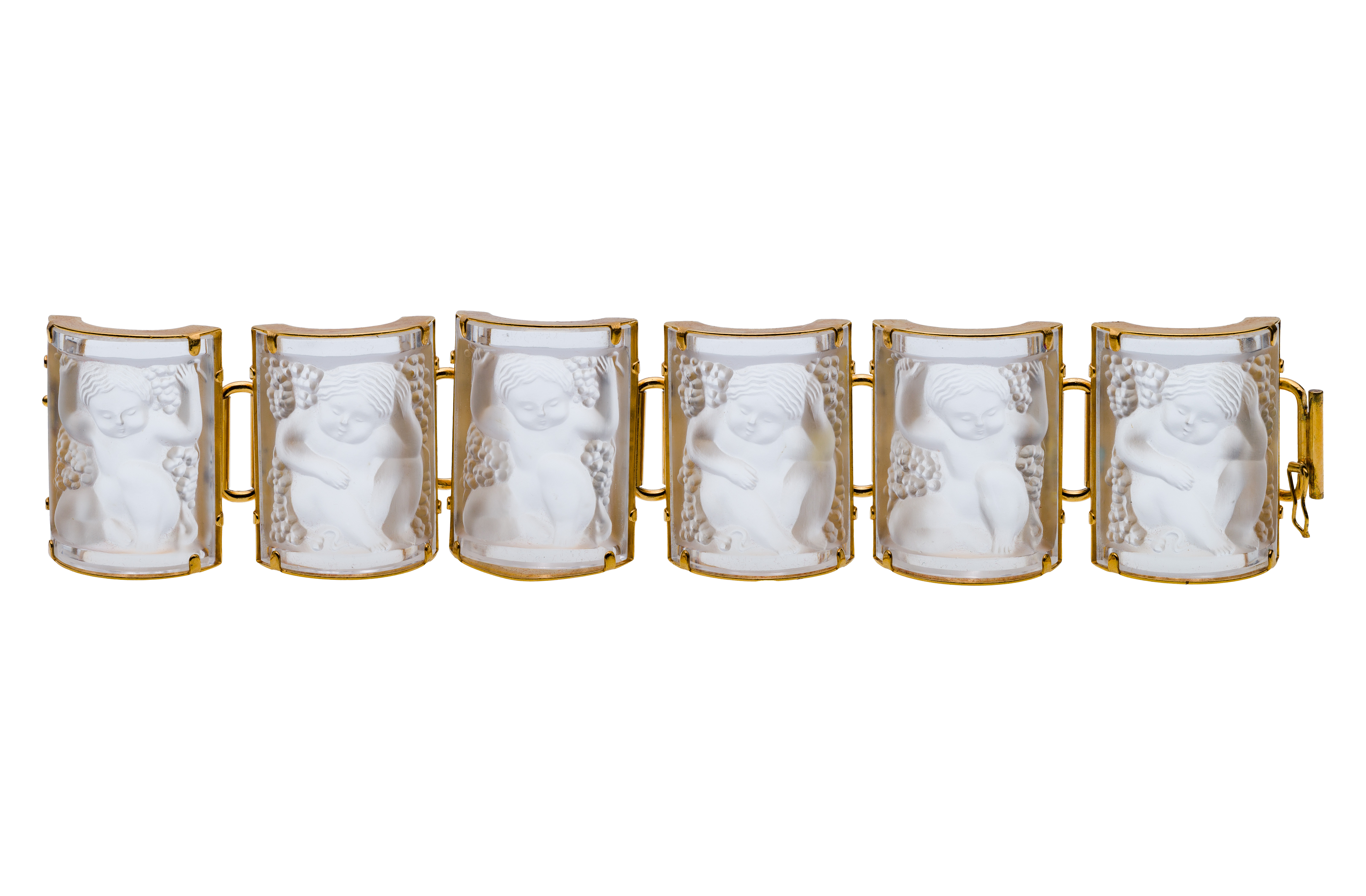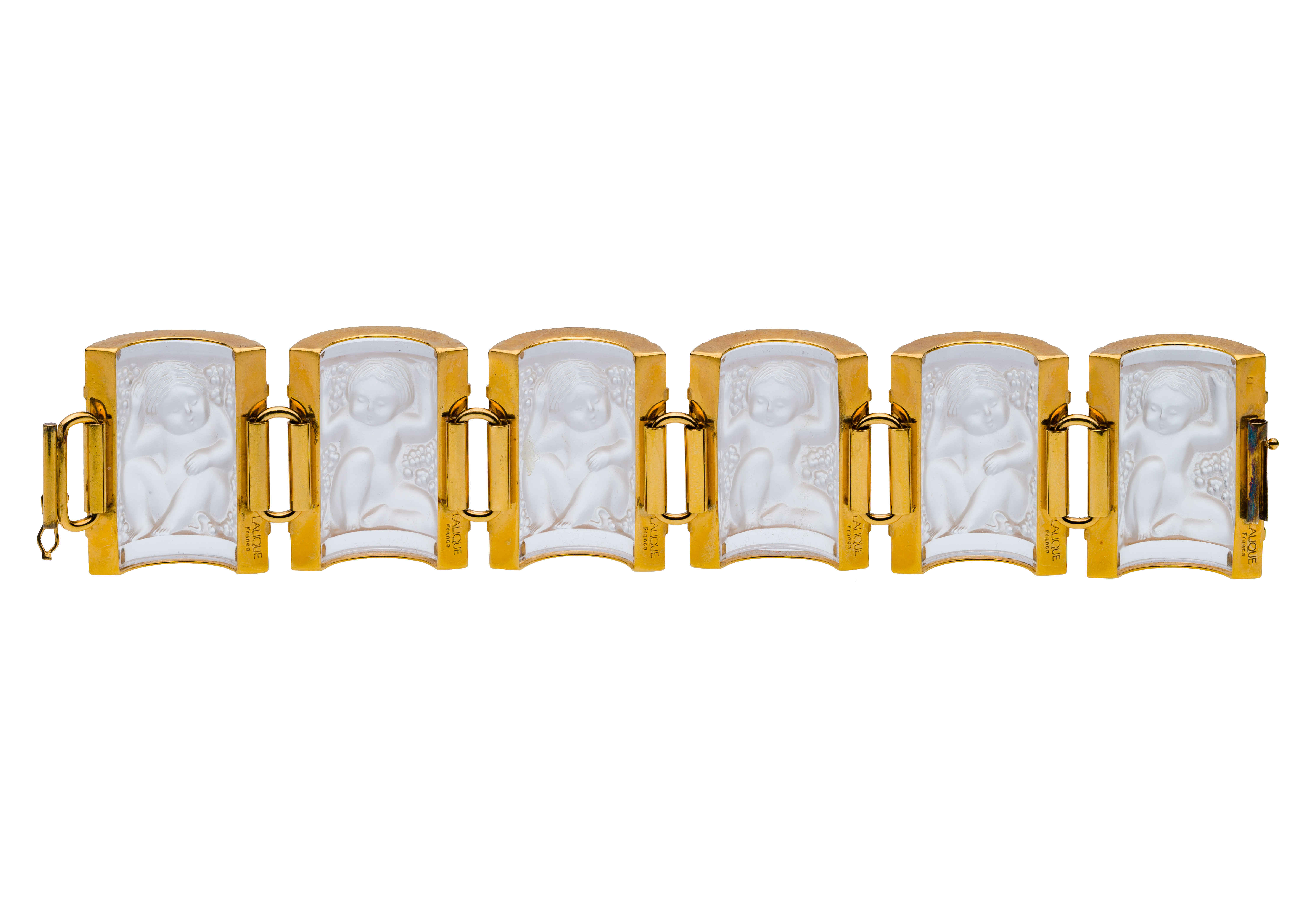 Six rectangular and curved crystal 1.5 inch wide panels, each depicting a nymph, set in a gold-tone articulated mounting completed by a sliding clasp with figure-eight safety marked ‘Lalique, France’, including storage pouch