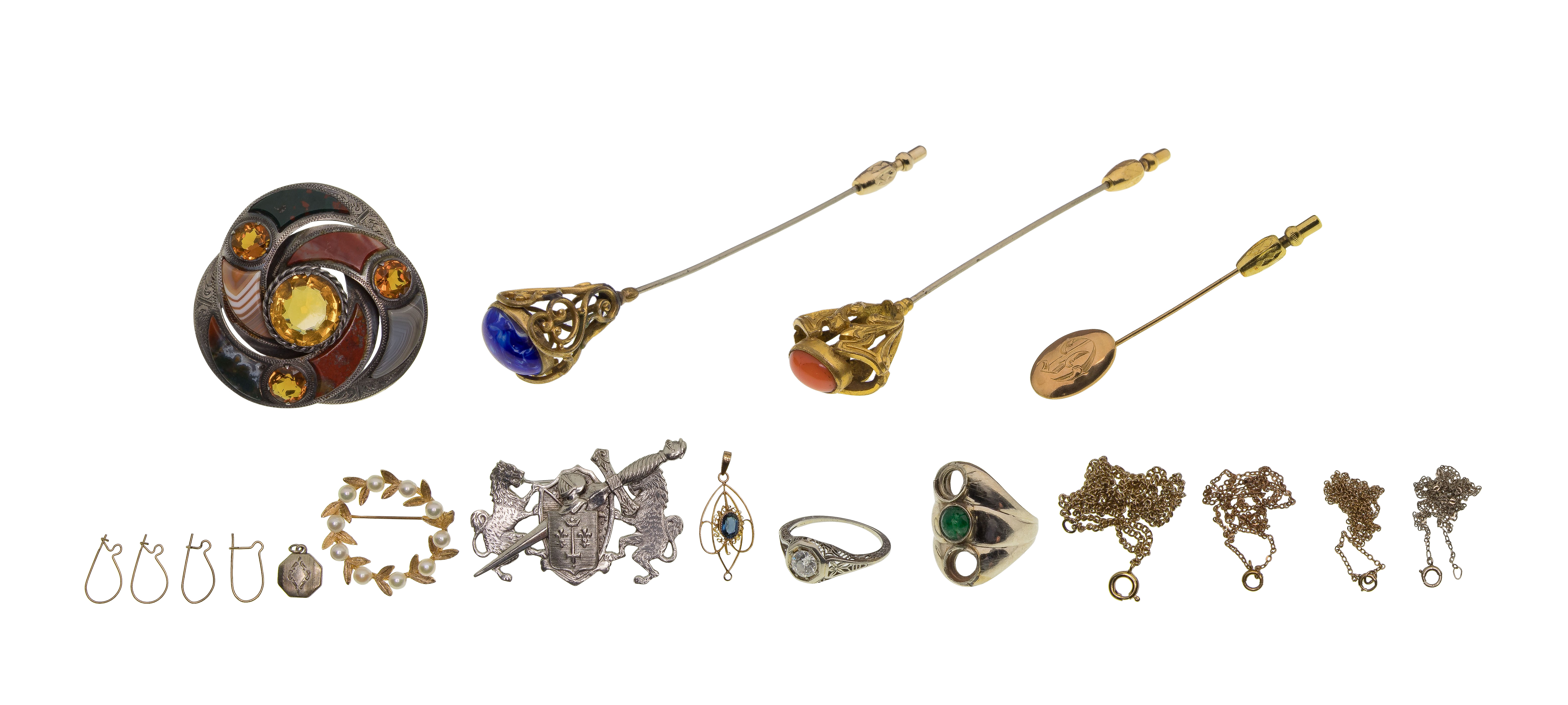 (8) items including a ring having a round cut diamond (marked ’18k’), a chain style necklace and (2) pairs of earring wires (marked ’14k’), a necklace and a chain style necklace (marked ’10k’), a ring setting (unmarked 14k and 10k), a pin (unmarked 0.900 silver) and a few pieces of costume jewelry