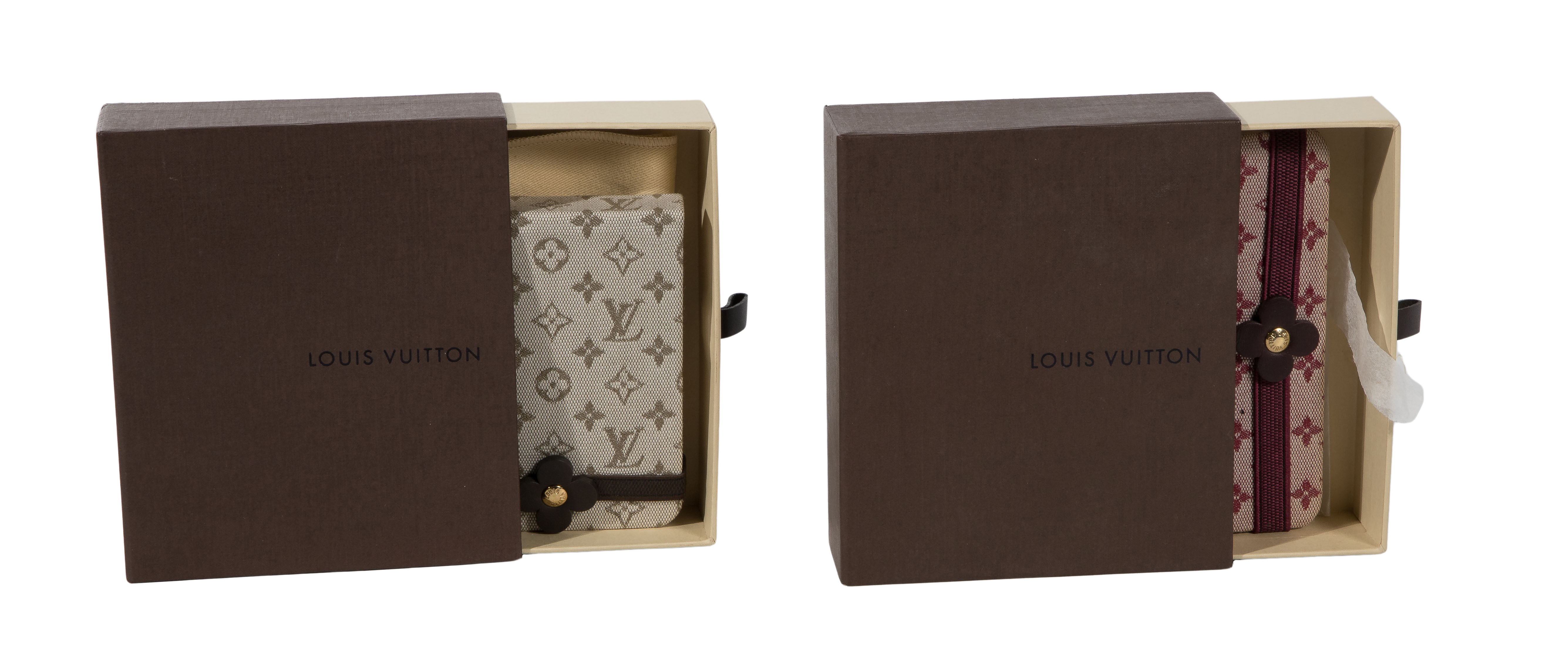 (4) items including a monogrammed canvas Musette Tango short strap and canvas toiletry pouch and (2) notepads in monogrammed covers, having boxes