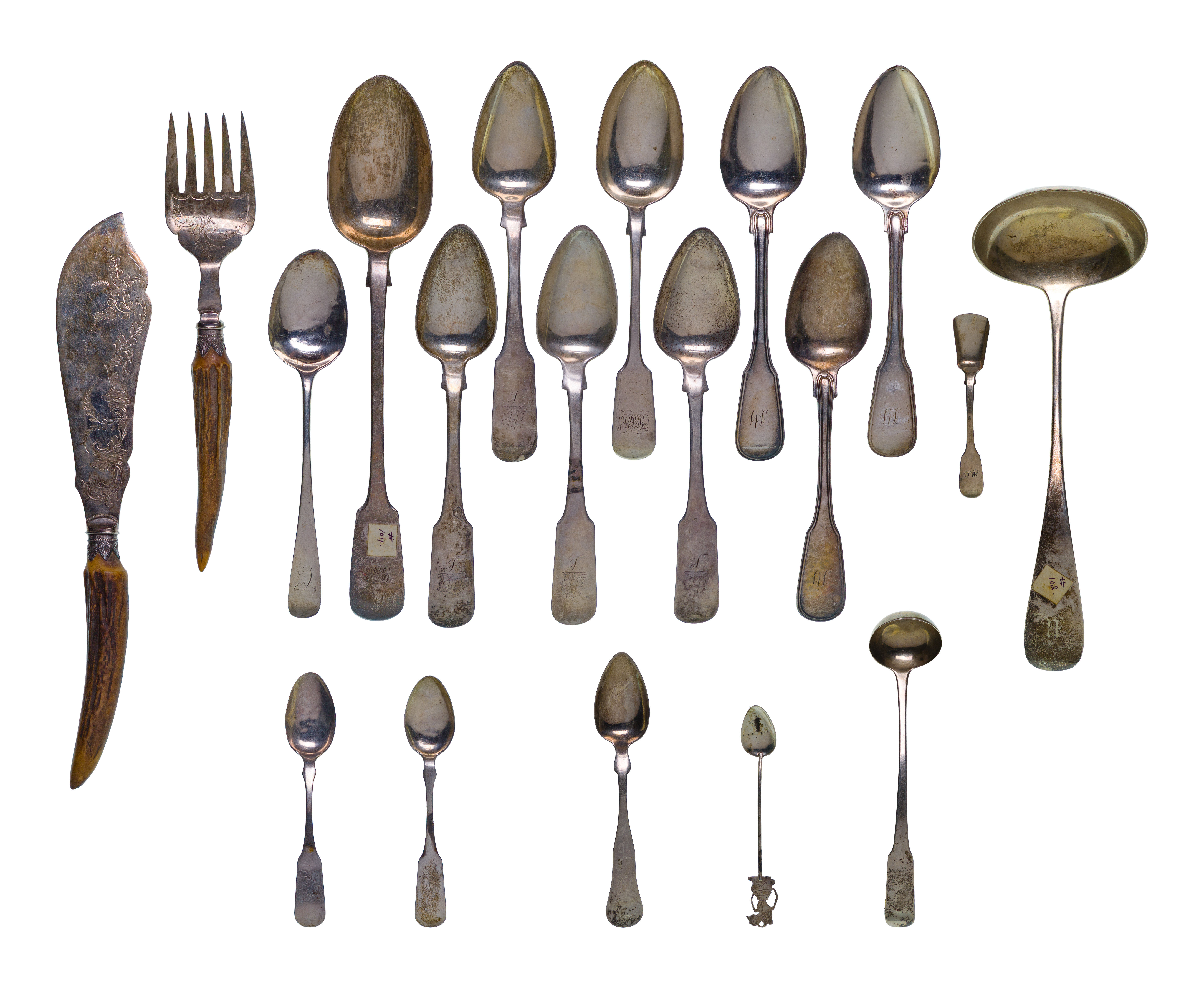 Including mismatched serving utensils such as spoons, ladles, meat fork and knife (most marked ‘sterling’ / ‘925’ / lion passant)