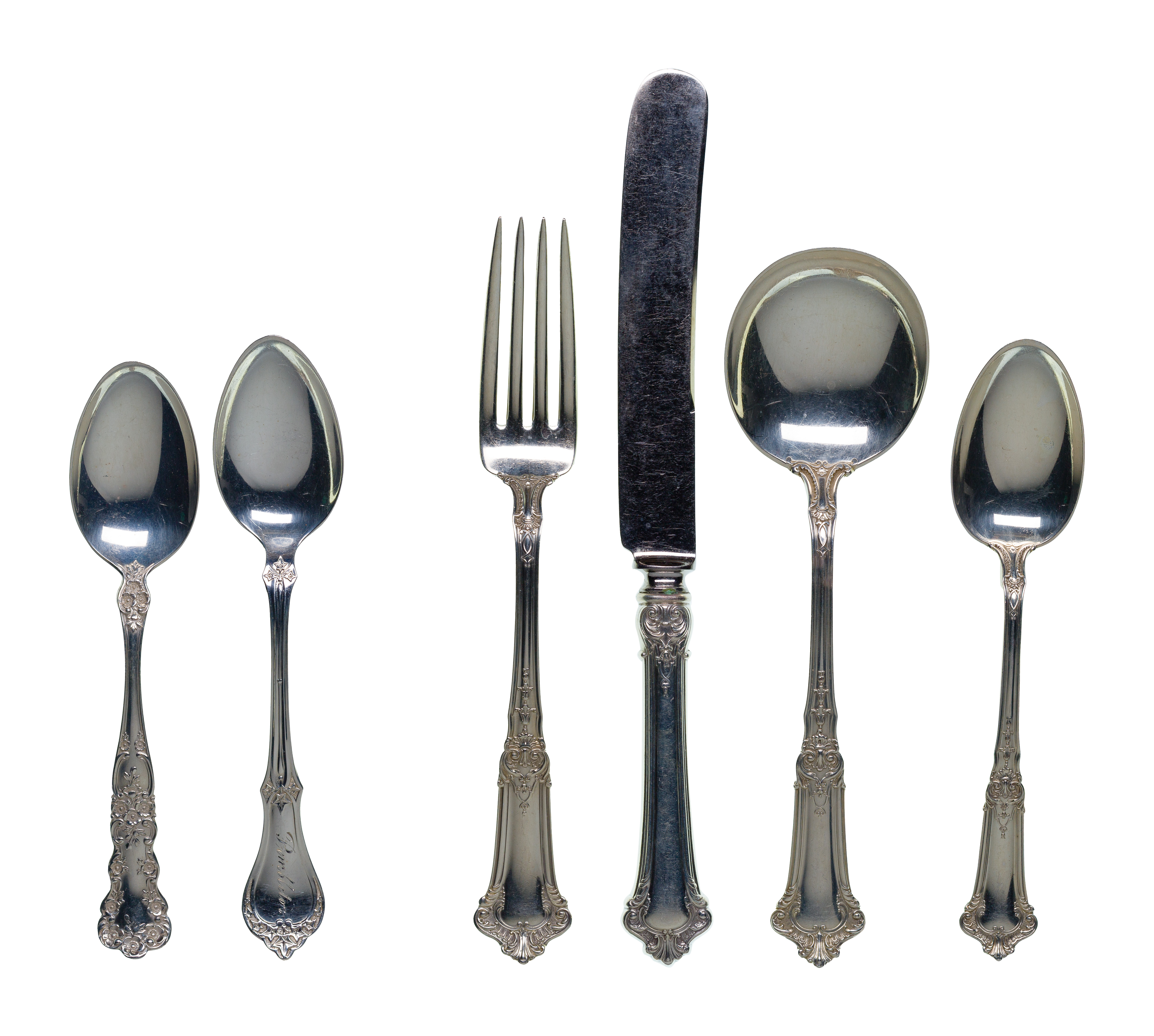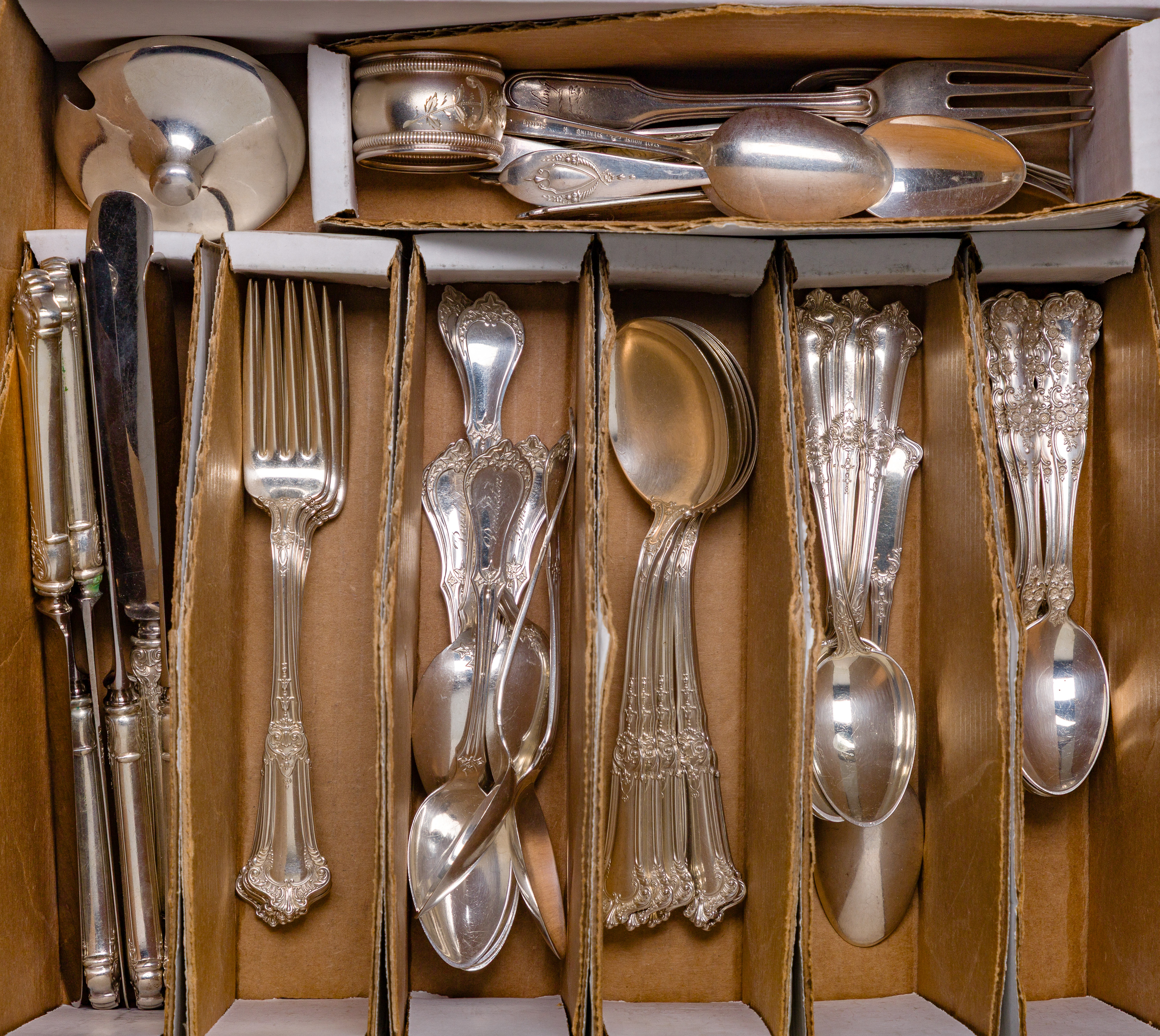 (53) total items including mismatched and incomplete sets consisting of (6) 8 1/2-inch old French knives, (6) 7 1/4-inch dinner forks, (22) 6-inch teaspoons, (6) 6 3/4-inch round soup spoons; together with various other singular silver items (most marked)