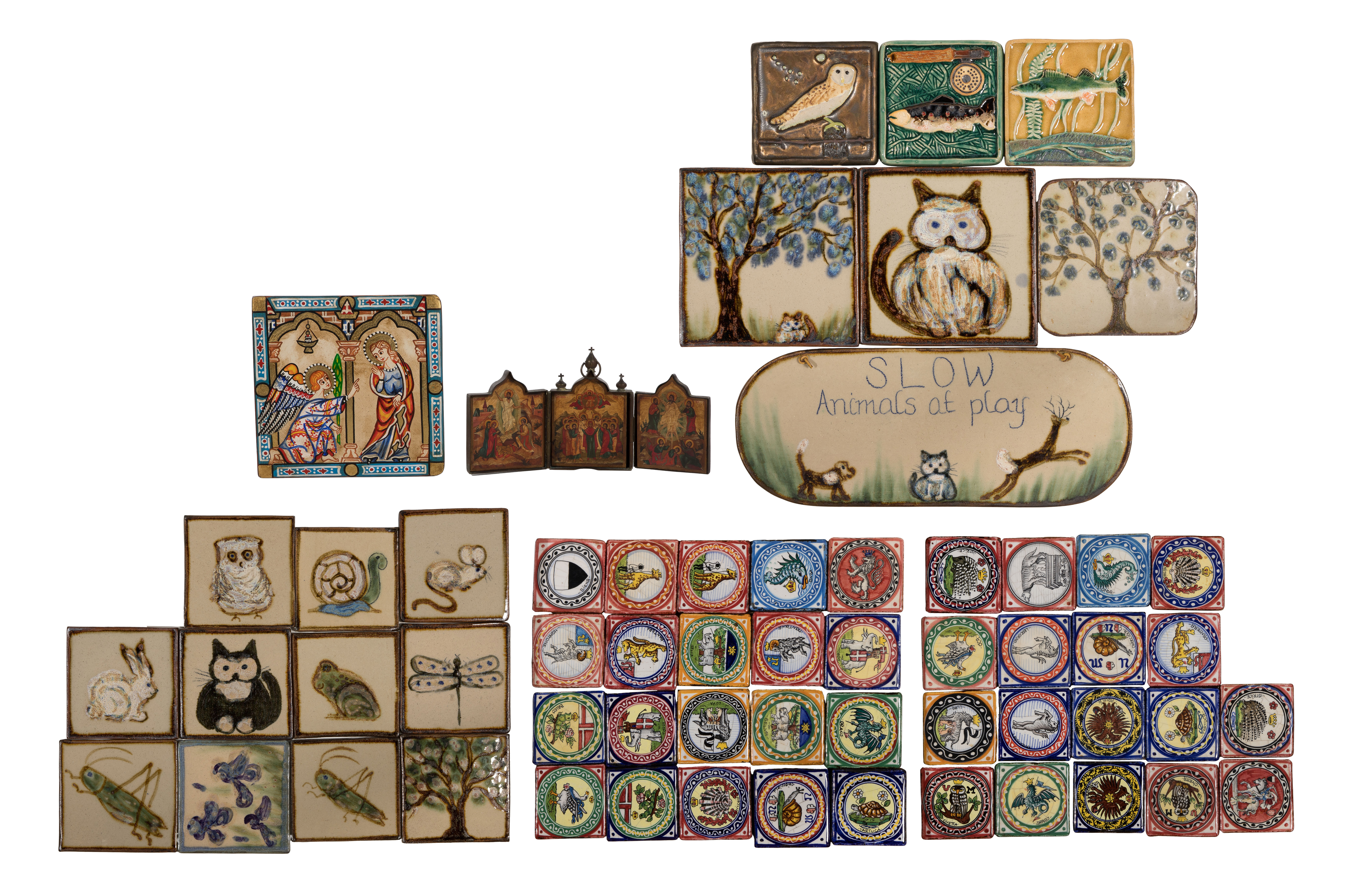 (48) total items including tiles of various shapes, sizes, designs and glazes including handmade and hand painted designs by Janet Resnick, Spork and Italian tiles (2.75 x 2.75-inches); together with a religious triptych and wood plaque