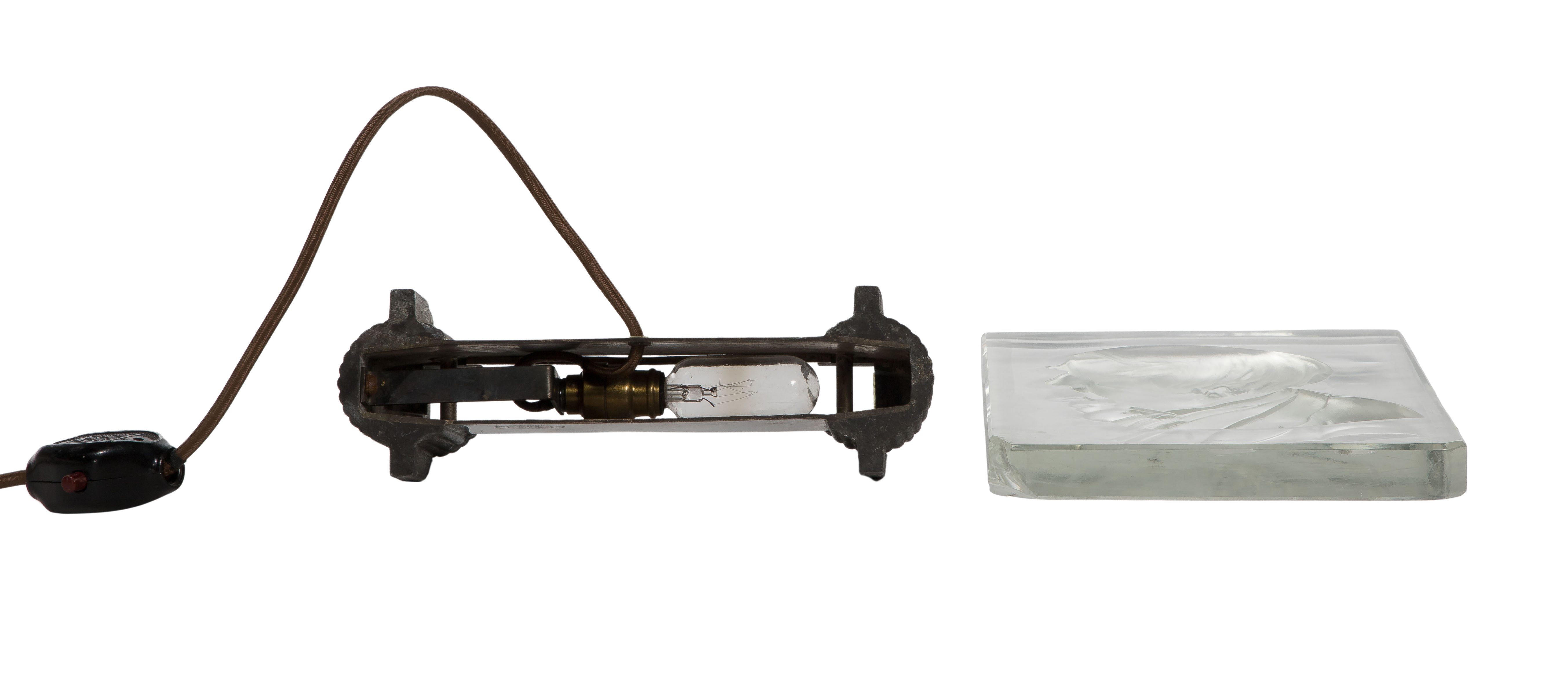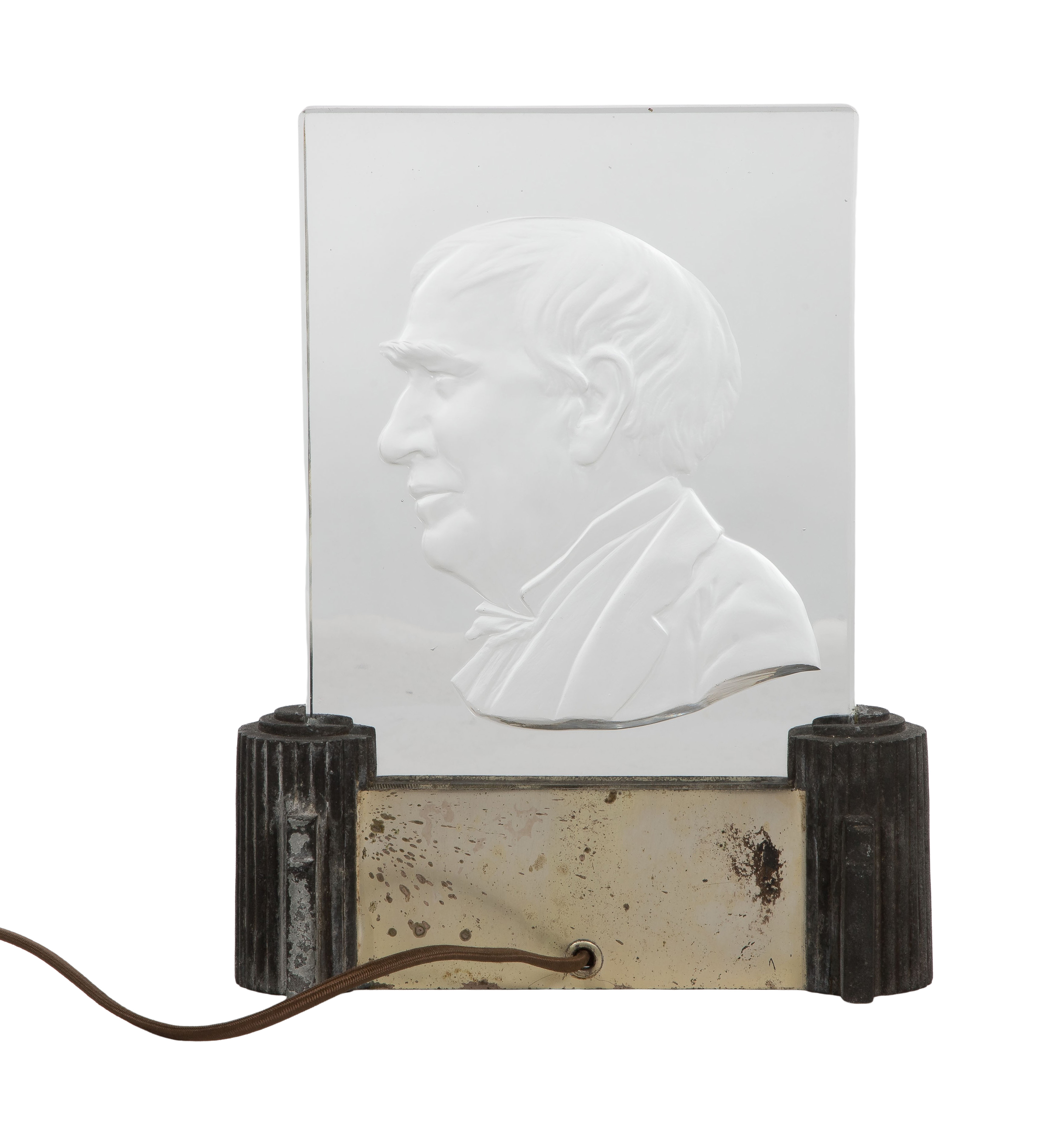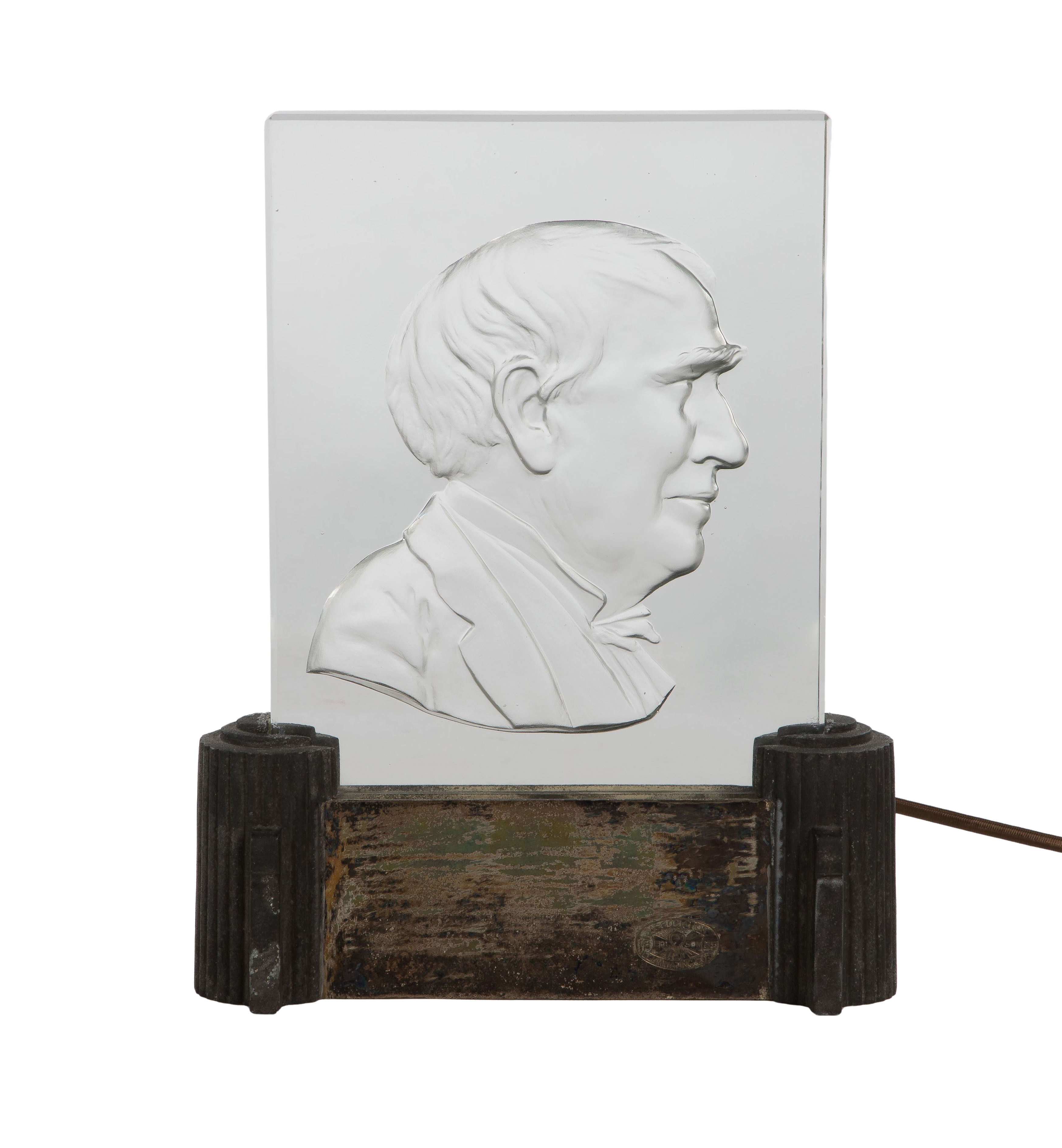 An intaglio panel portrait of Thomas Edison having a metal base, produced in 1929, never for sale, special order from Henry Ford, used as favors at the Golden Jubilee Banquet given for Thomas Edison at the opening of Henry Ford Museum, marked ‘Steuben’ on bottom side of glass , 1929′ on front of chrome light box ‘Association / 18 EDISON 85 / ILLUMINATING CO’S’
