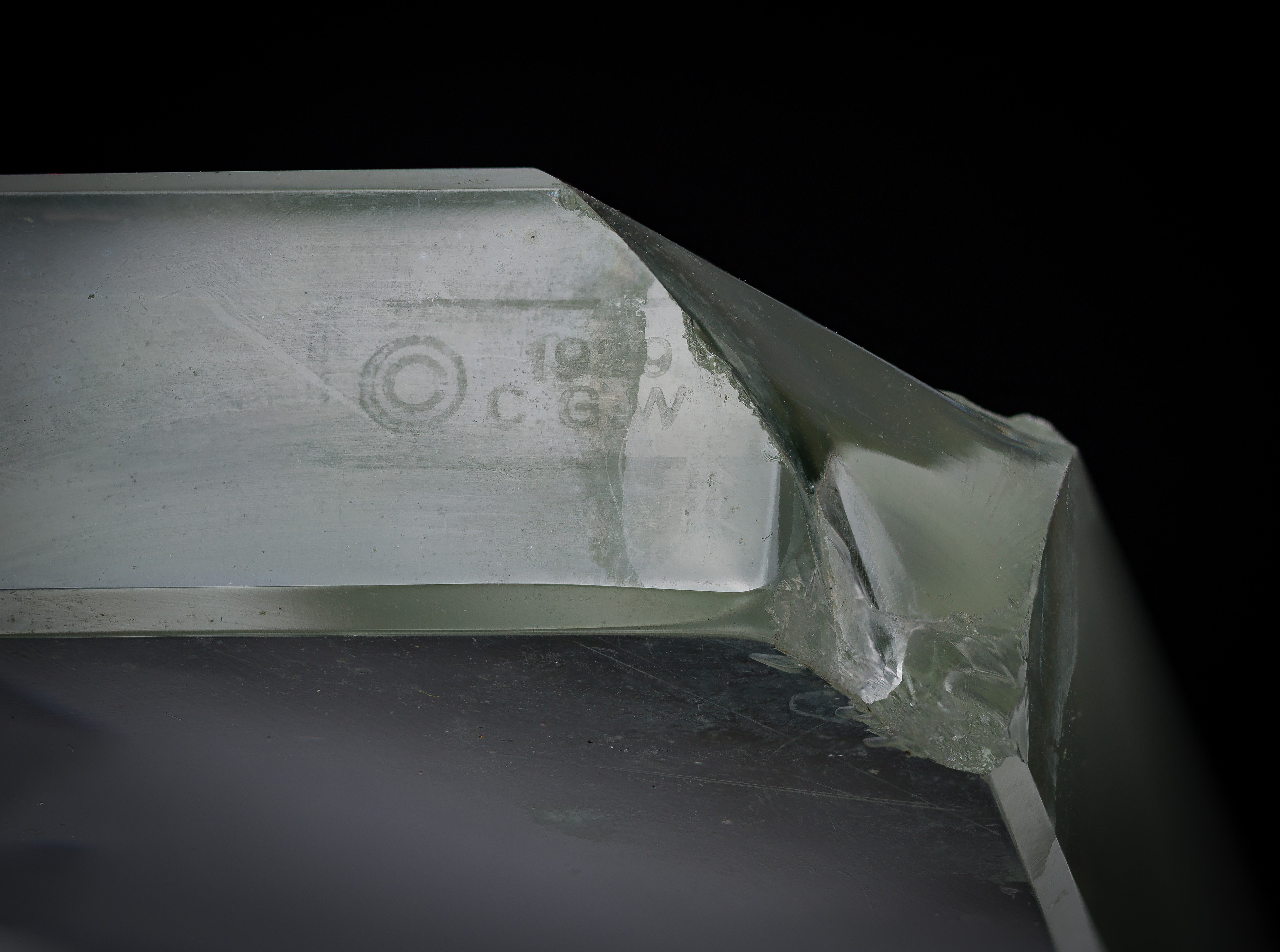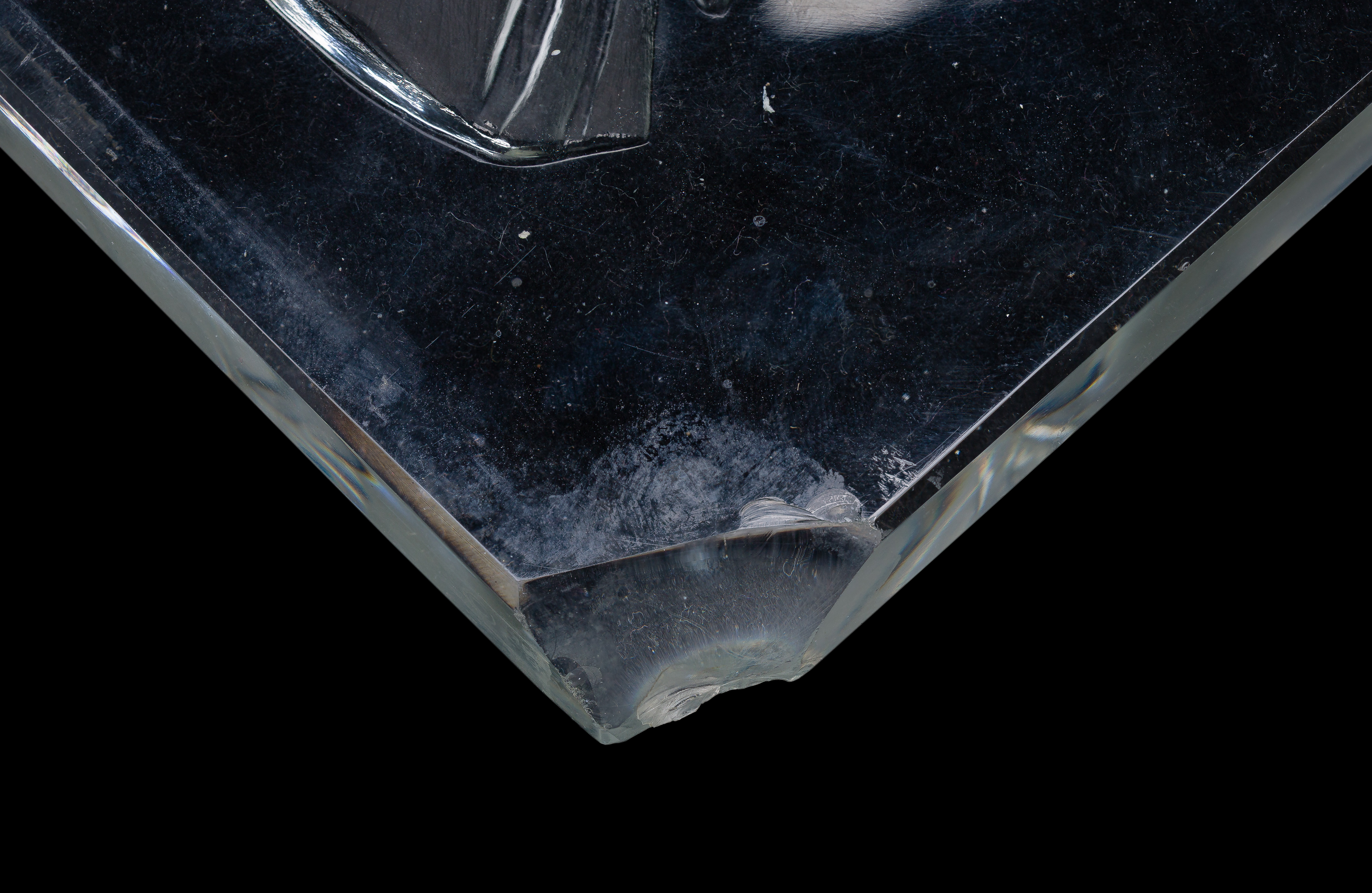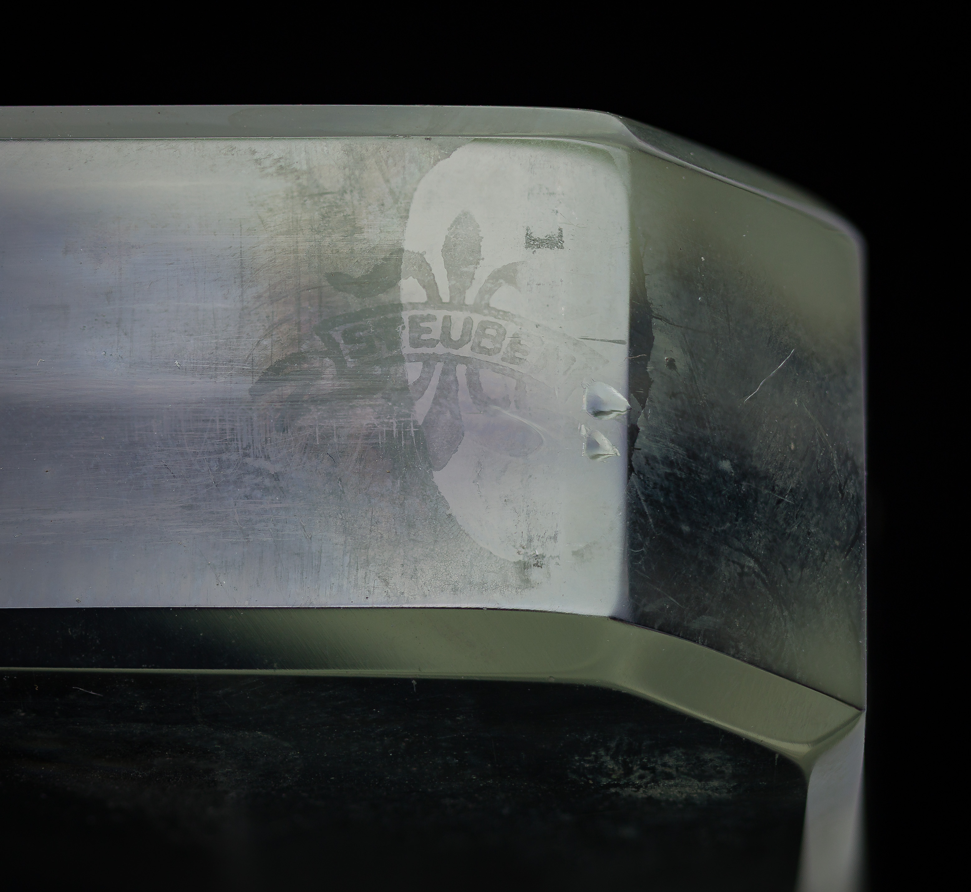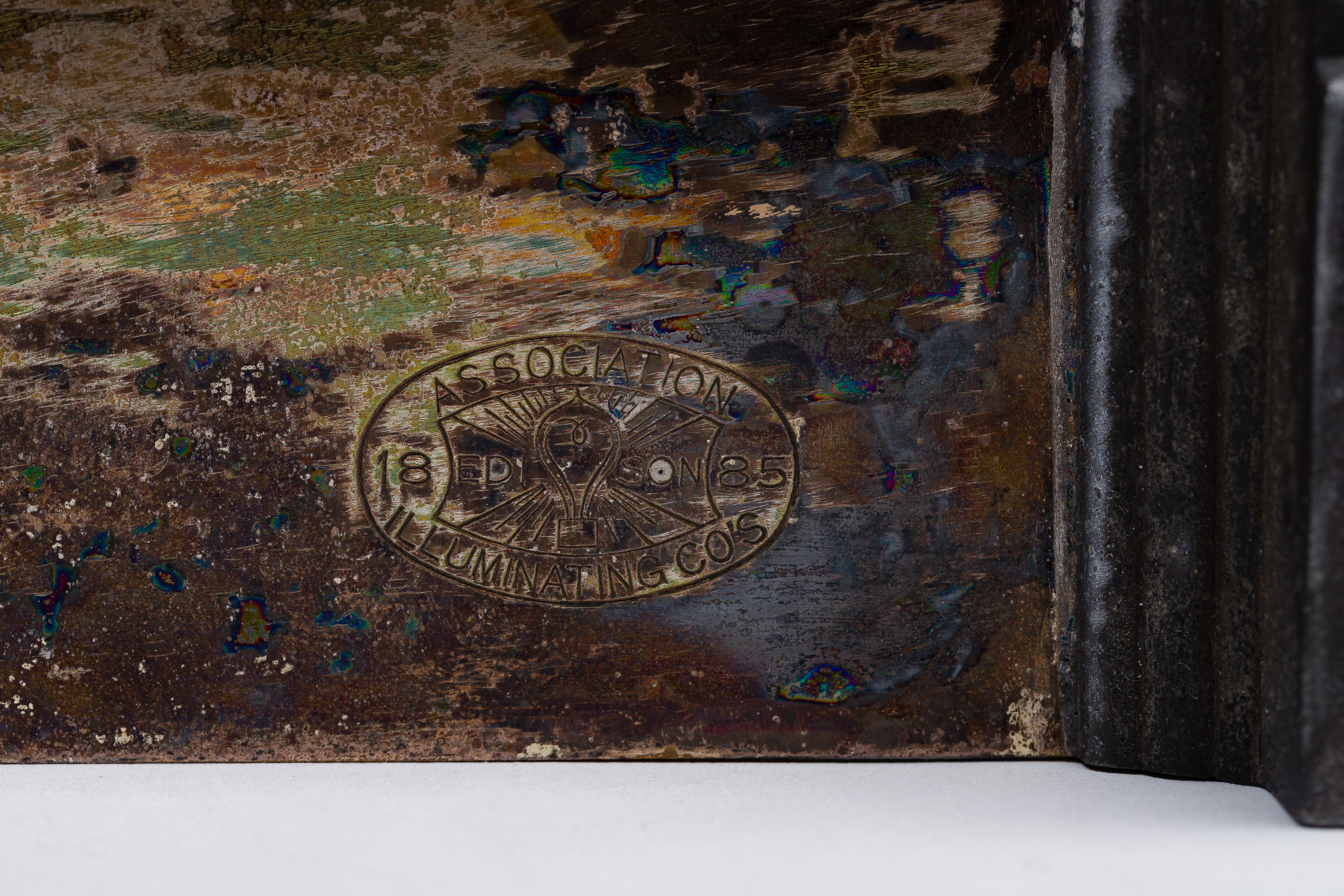 An intaglio panel portrait of Thomas Edison having a metal base, produced in 1929, never for sale, special order from Henry Ford, used as favors at the Golden Jubilee Banquet given for Thomas Edison at the opening of Henry Ford Museum, marked ‘Steuben’ on bottom side of glass , 1929′ on front of chrome light box ‘Association / 18 EDISON 85 / ILLUMINATING CO’S’