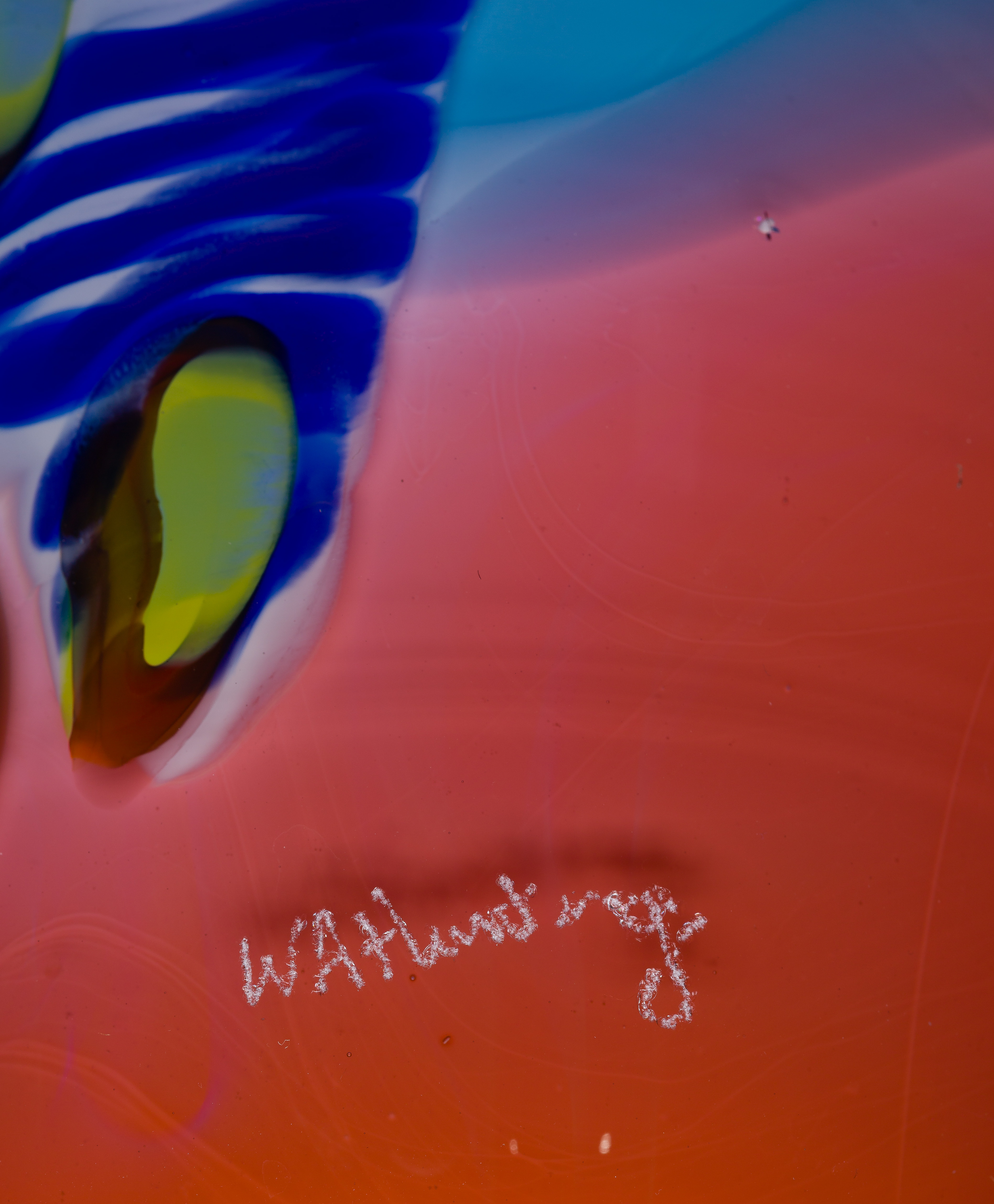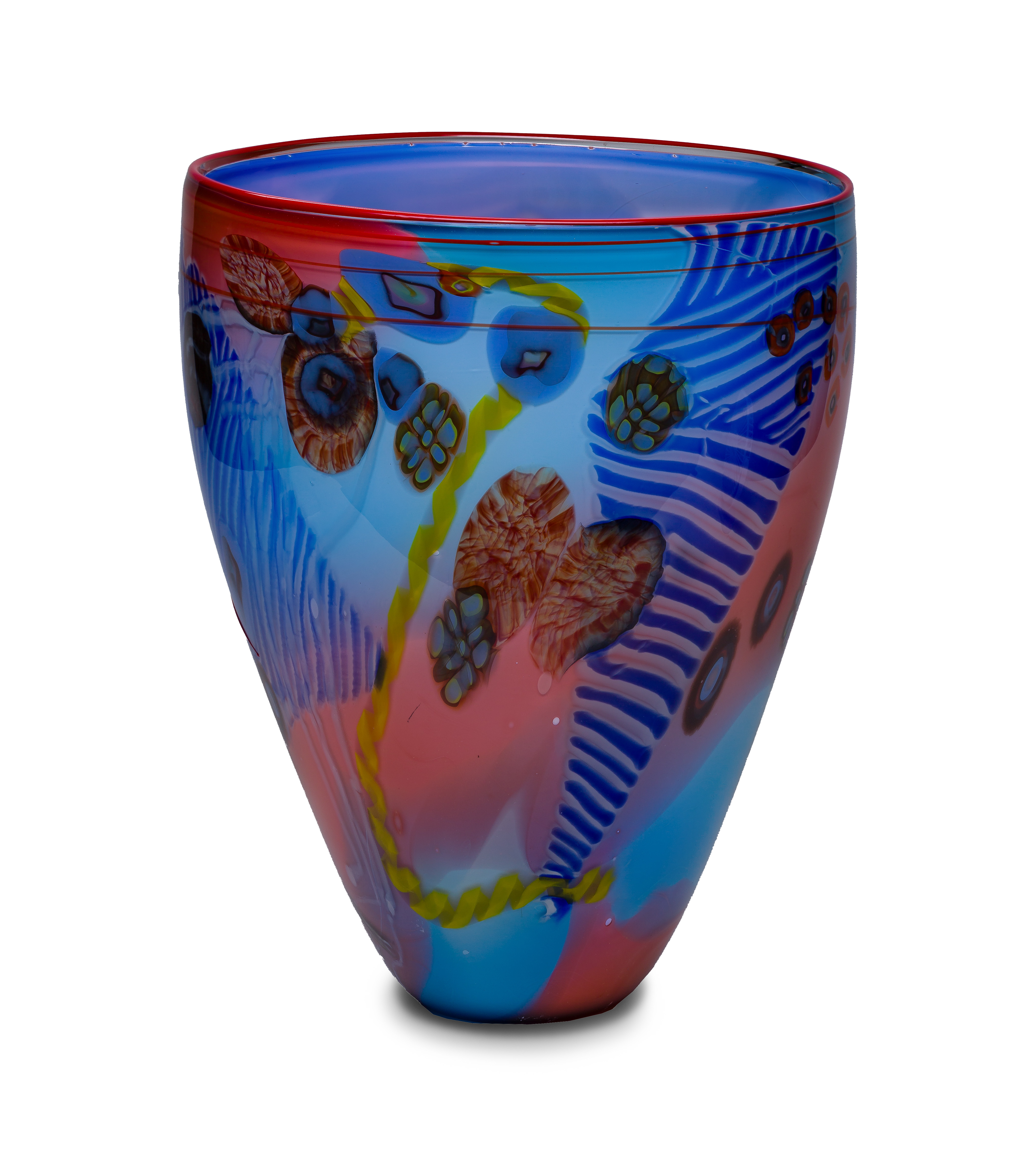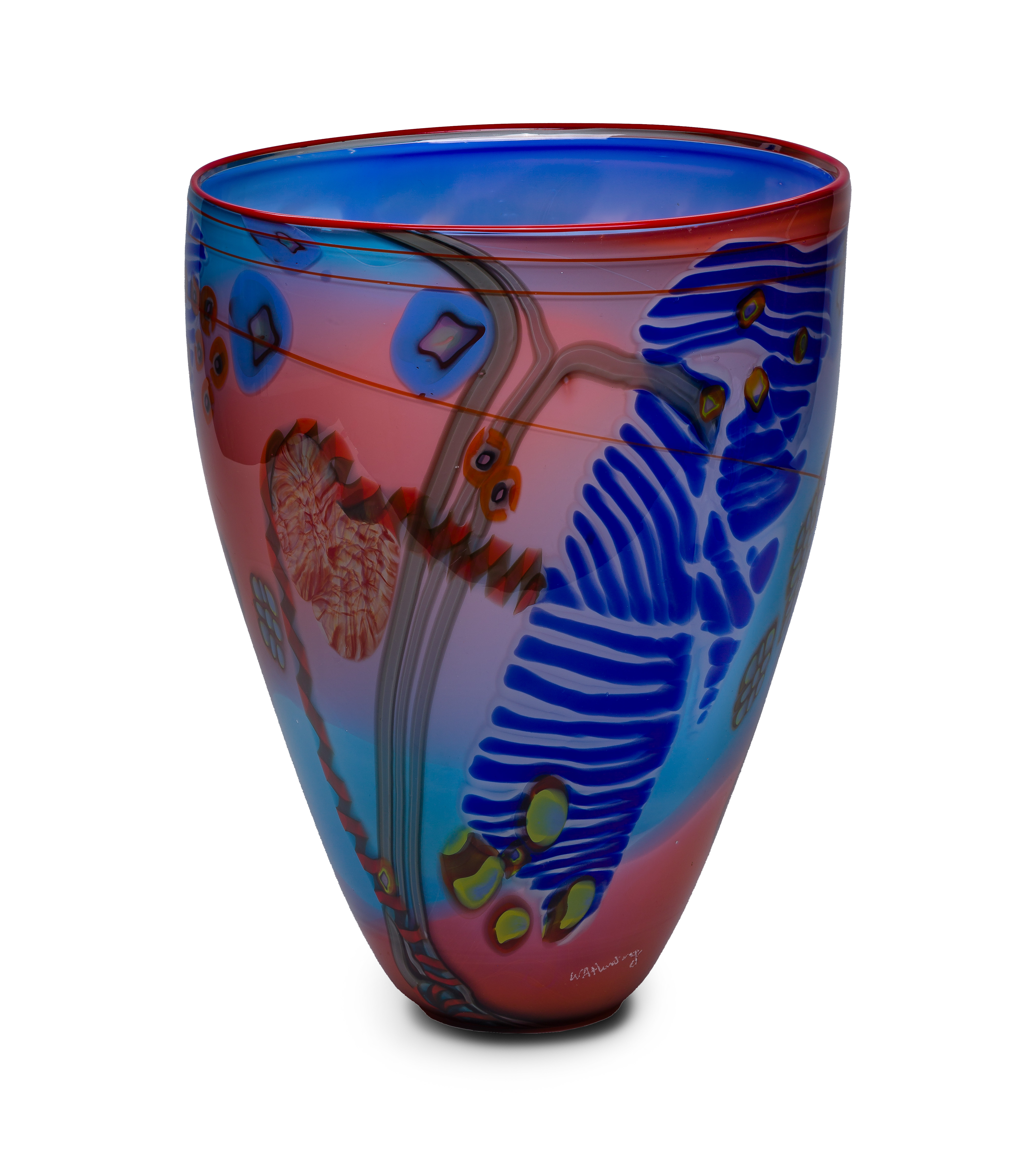 From the Colorfield series, having engraved signature, drawn and marvered multi-color cane and red rim