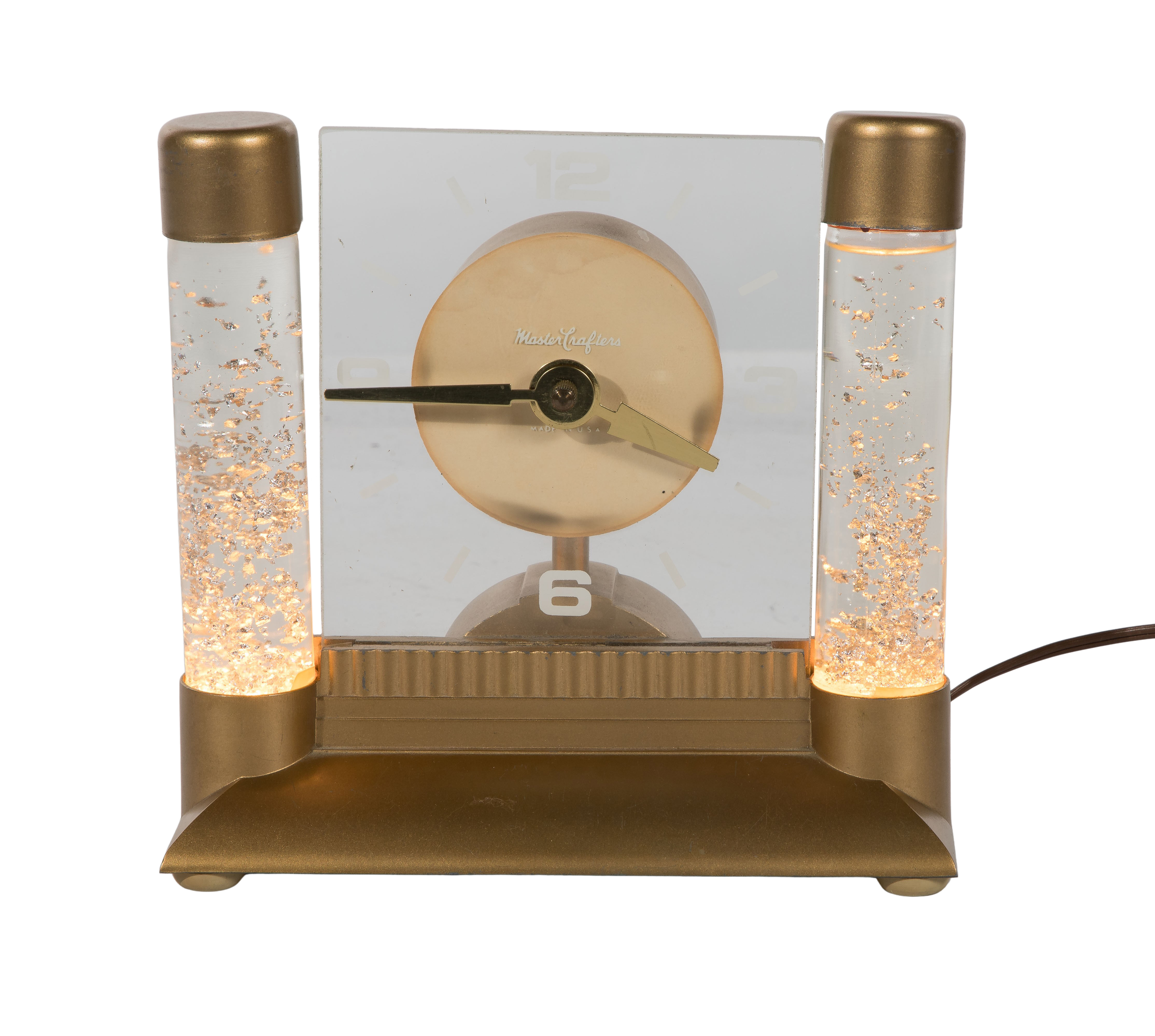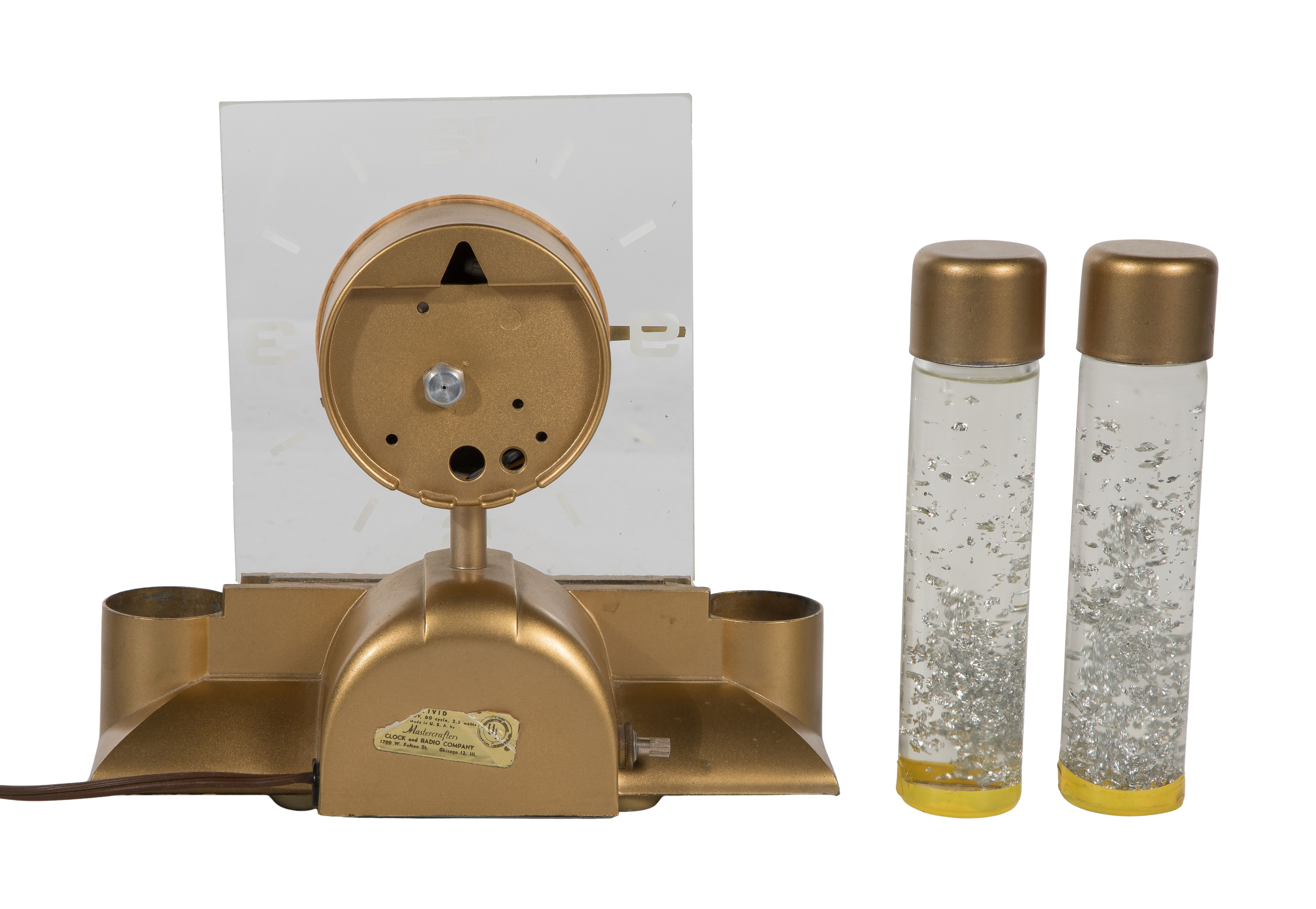 Having a light under each glass cylinder that heats up the liquid to circulate small pieces of silver-tone foil, numerals 3, 6, 9 and 12 o’clock, motor located behind the center, cast gold tone base