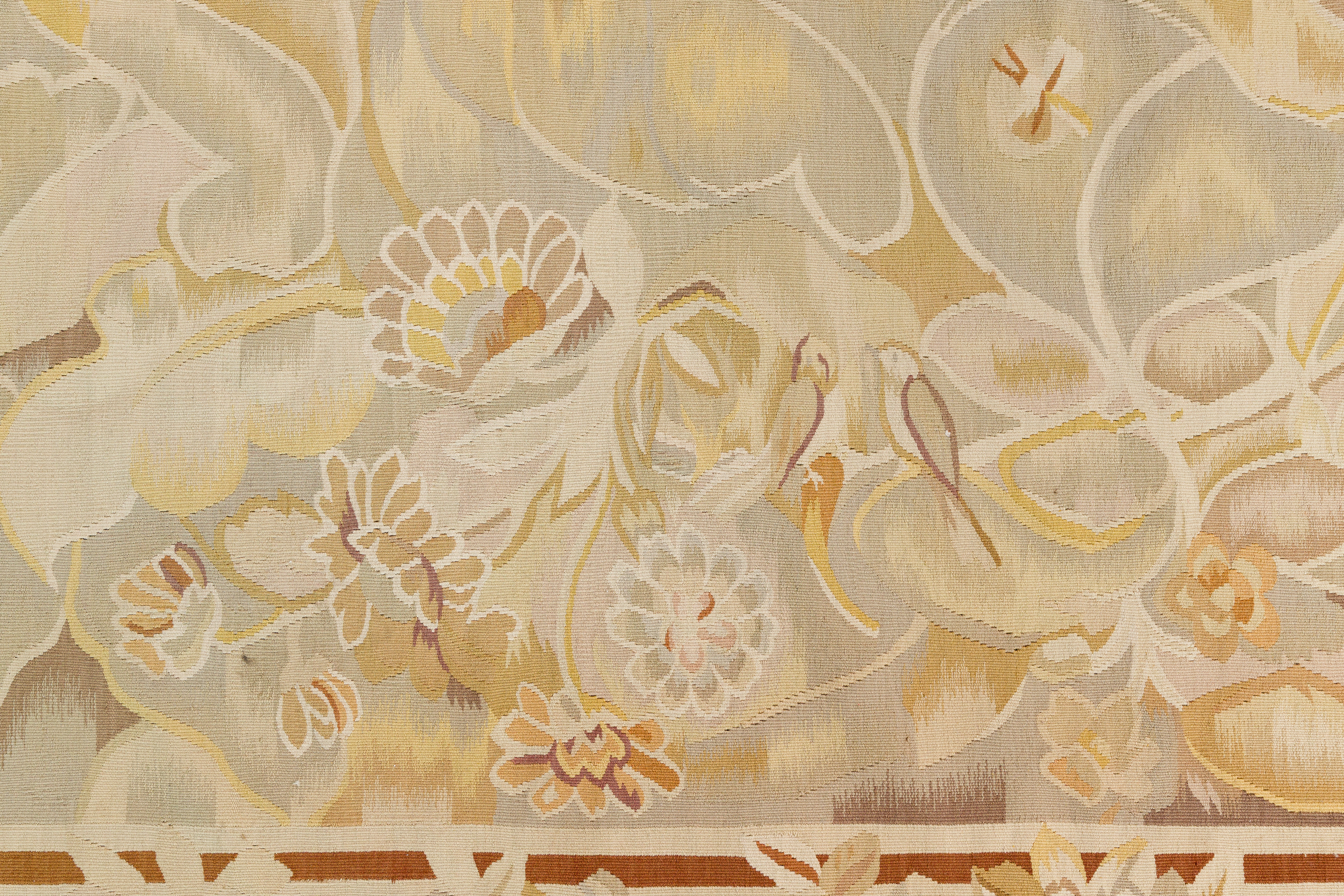 A flat weave style in a floral design having hues of gold, pink, blue, gray, green and brown on a cream field