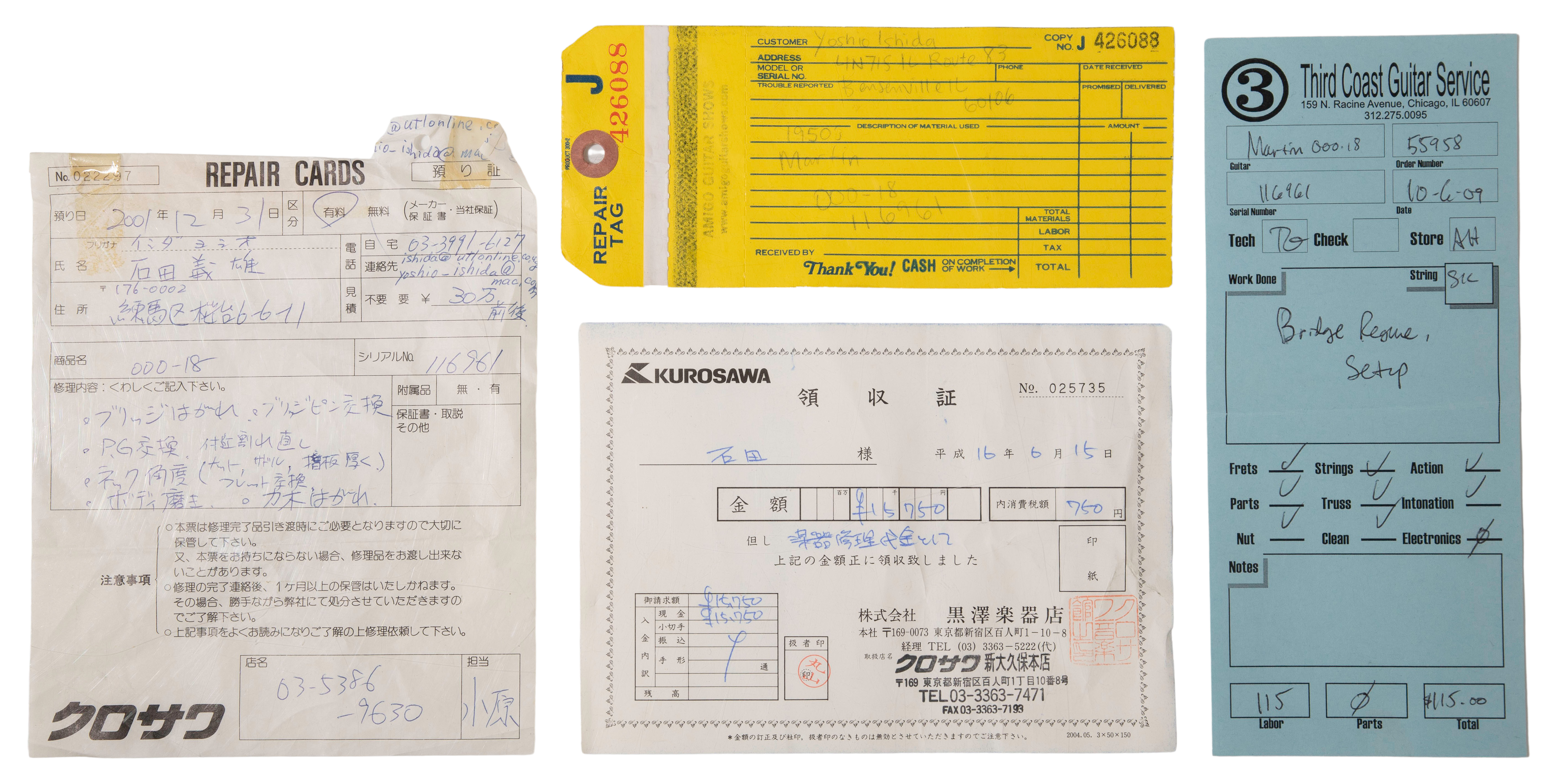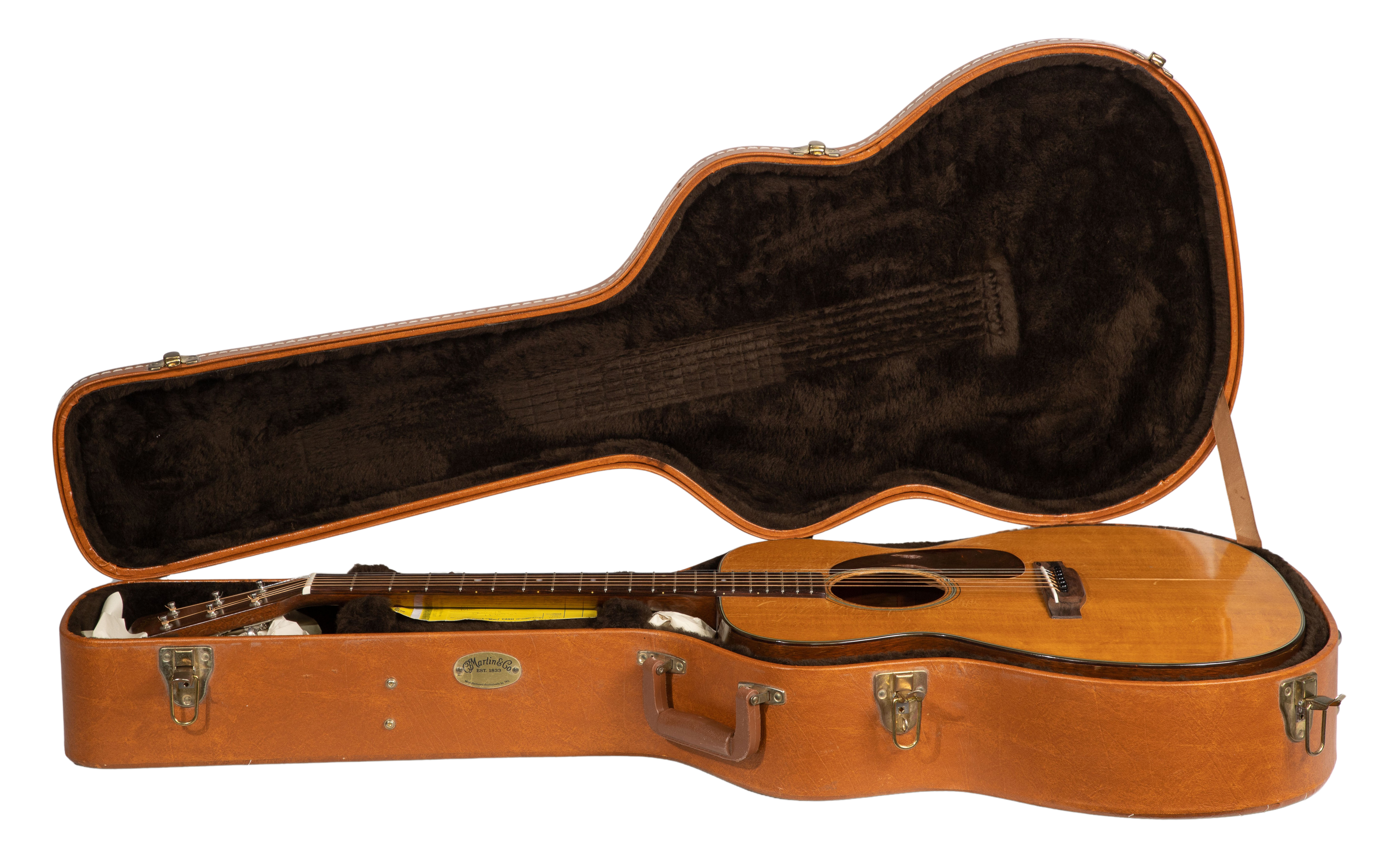 c.1950, serial #116961, having a solid spruce top with mahogany back and sides as well as a C. F. Martin & Company hard case containing Third Coast Guitar Service, Chicago and Japanese language Kurosawa repair tags