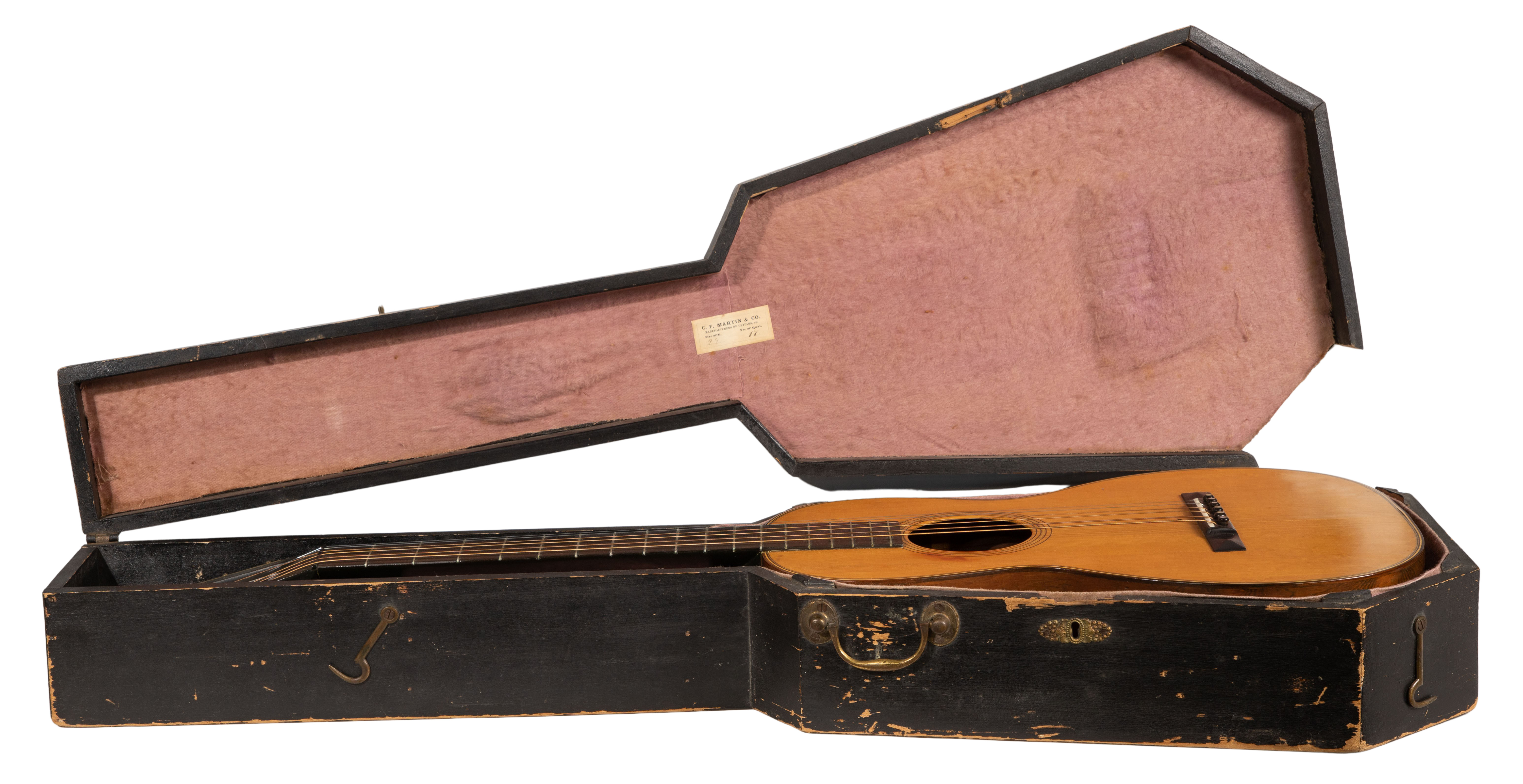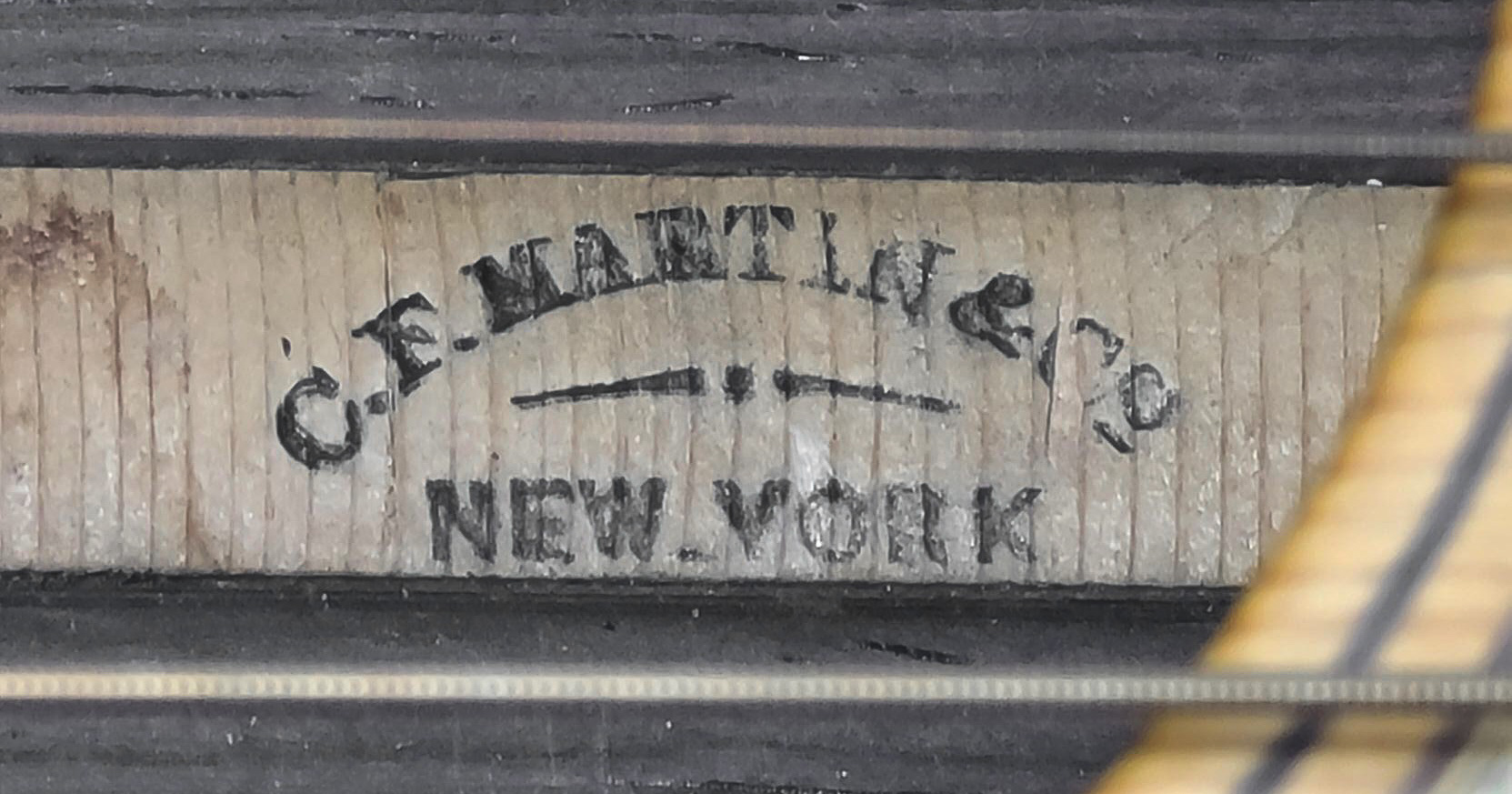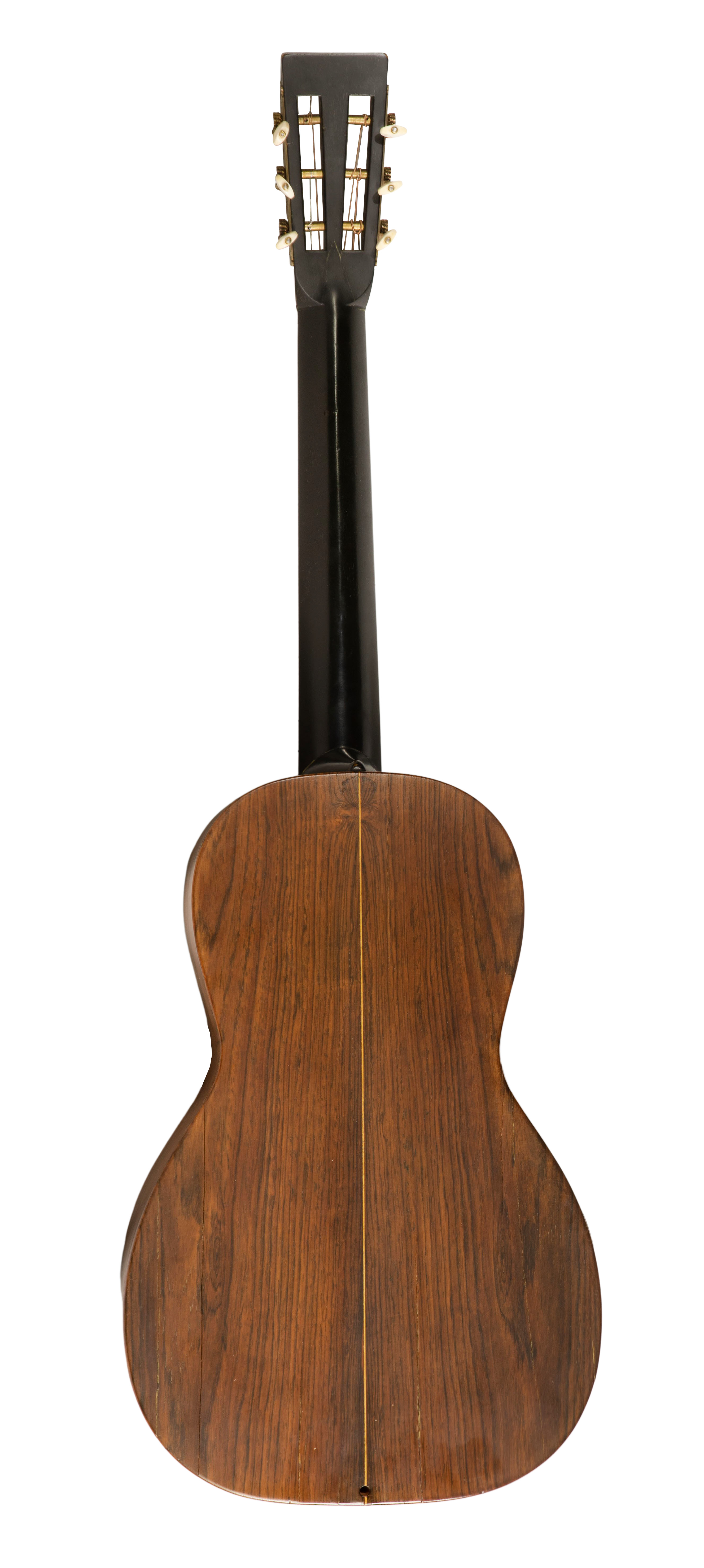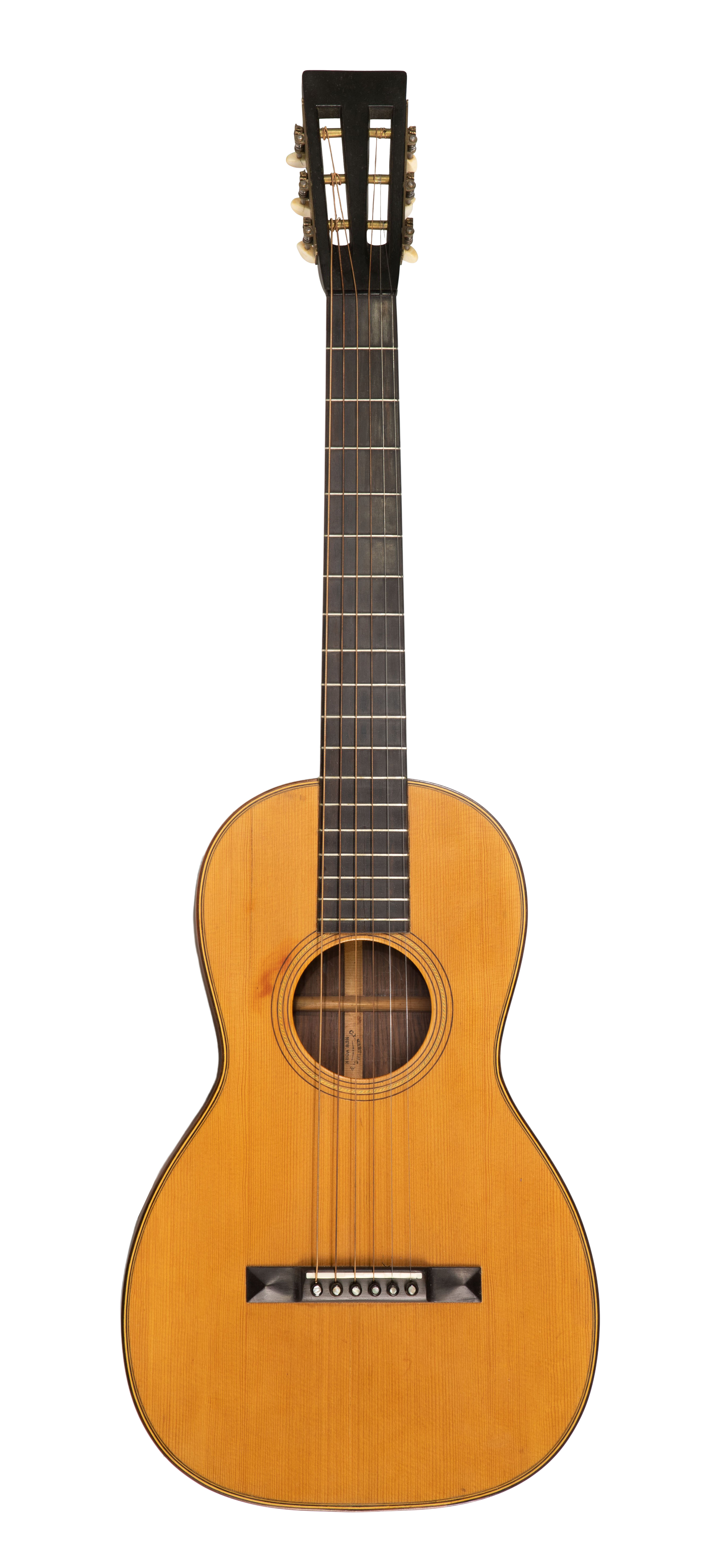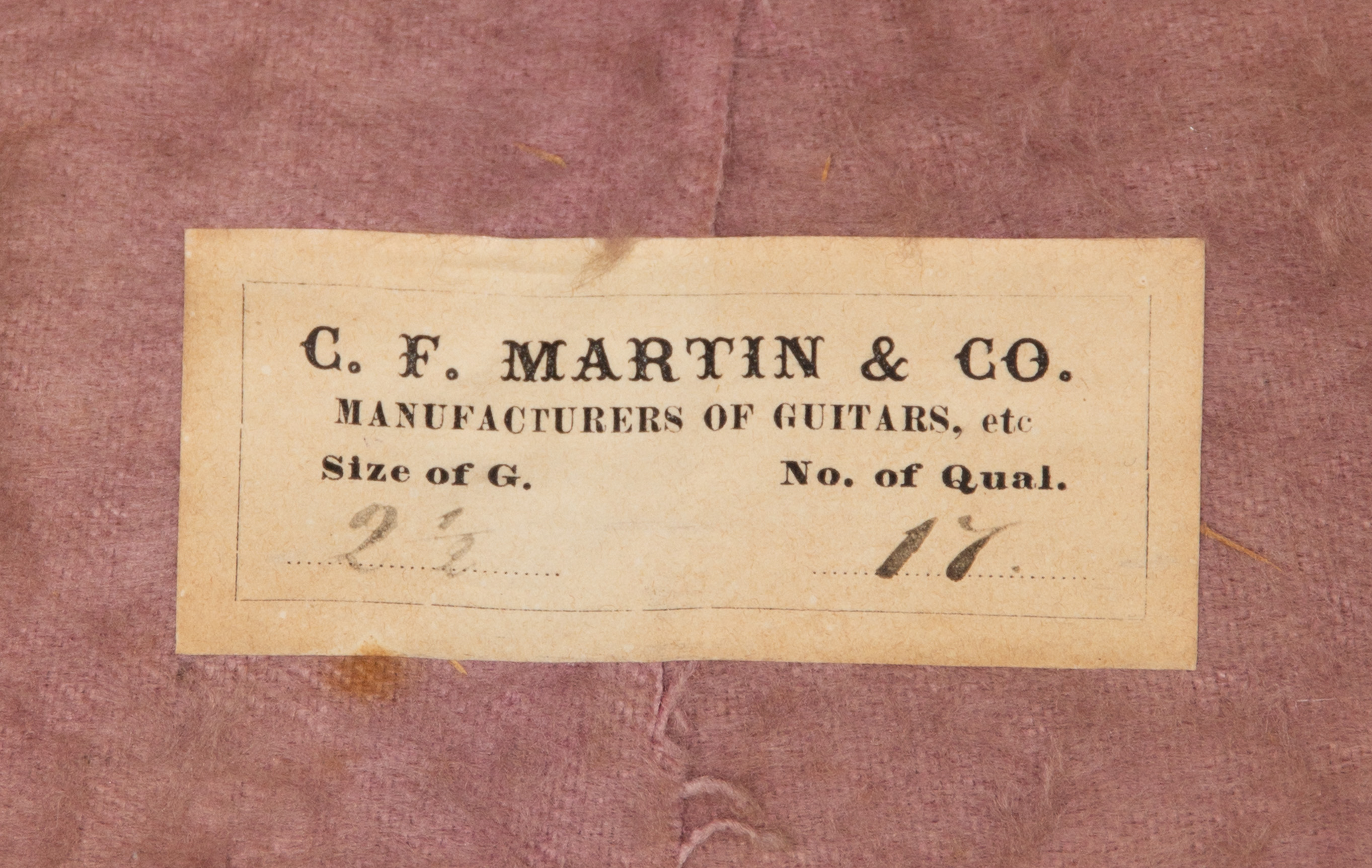 c.1870, 2 1/2-17 having a spruce top, rosewood back and sides, fan braced and solid bent lining on the interior, ebony fret-board, mahogany neck, slotted peg-head and ebony pyramid bridge, stamped C. F. Martin on interior, original wood case with C. F. Martin label