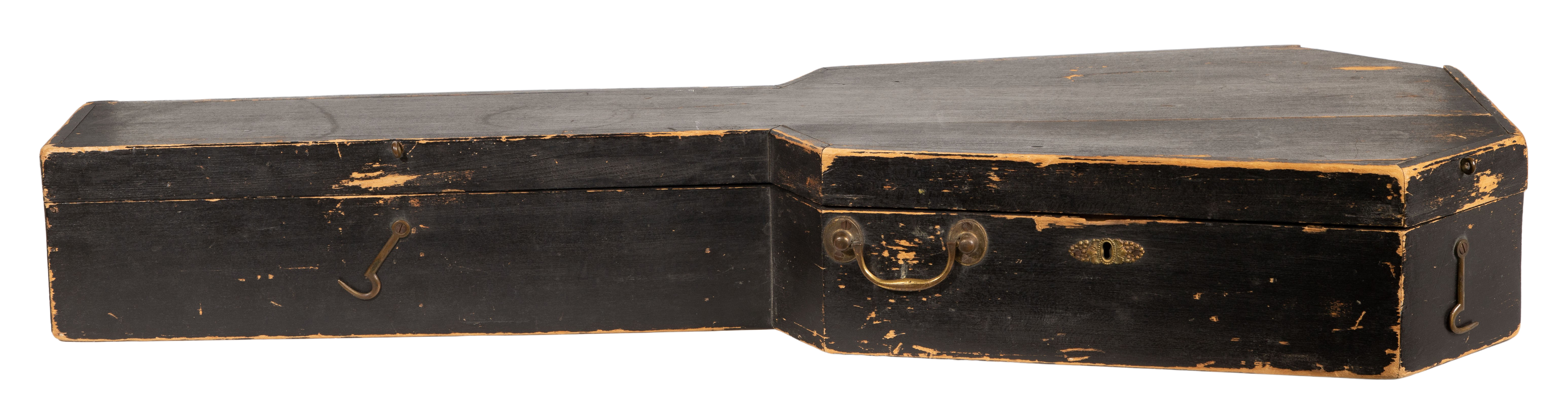 overall light wear consistent with age and normal use, bridge appearing replaced, cracks on front and back, hole on lower back, scratches, discoloring from playing, case having wear including nicks scuffs, missing paint, missing piece
