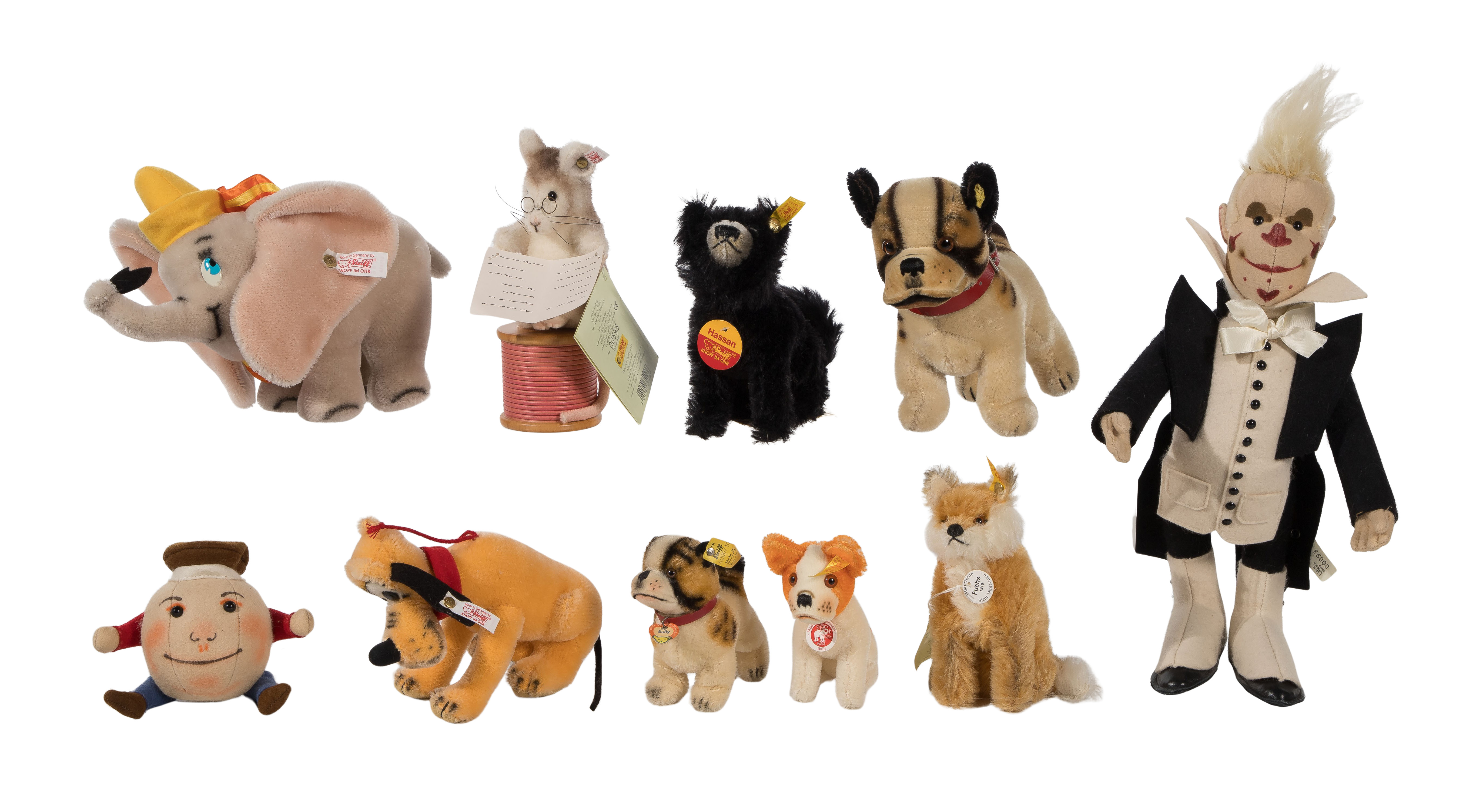 (34) total items including a ‘Gusto’ replica of the 1911 original clown doll, a 1995 Festival of Steiff ‘Golliwog’, a 1996 ‘Golli Girl’ as well as small size animals having various poses, colors and styles, all Steiff items having button, most retaining ear tag, some retaining paper identification tag at collars, some having hang tag certificates; together with (3) unmarked mohair animals
