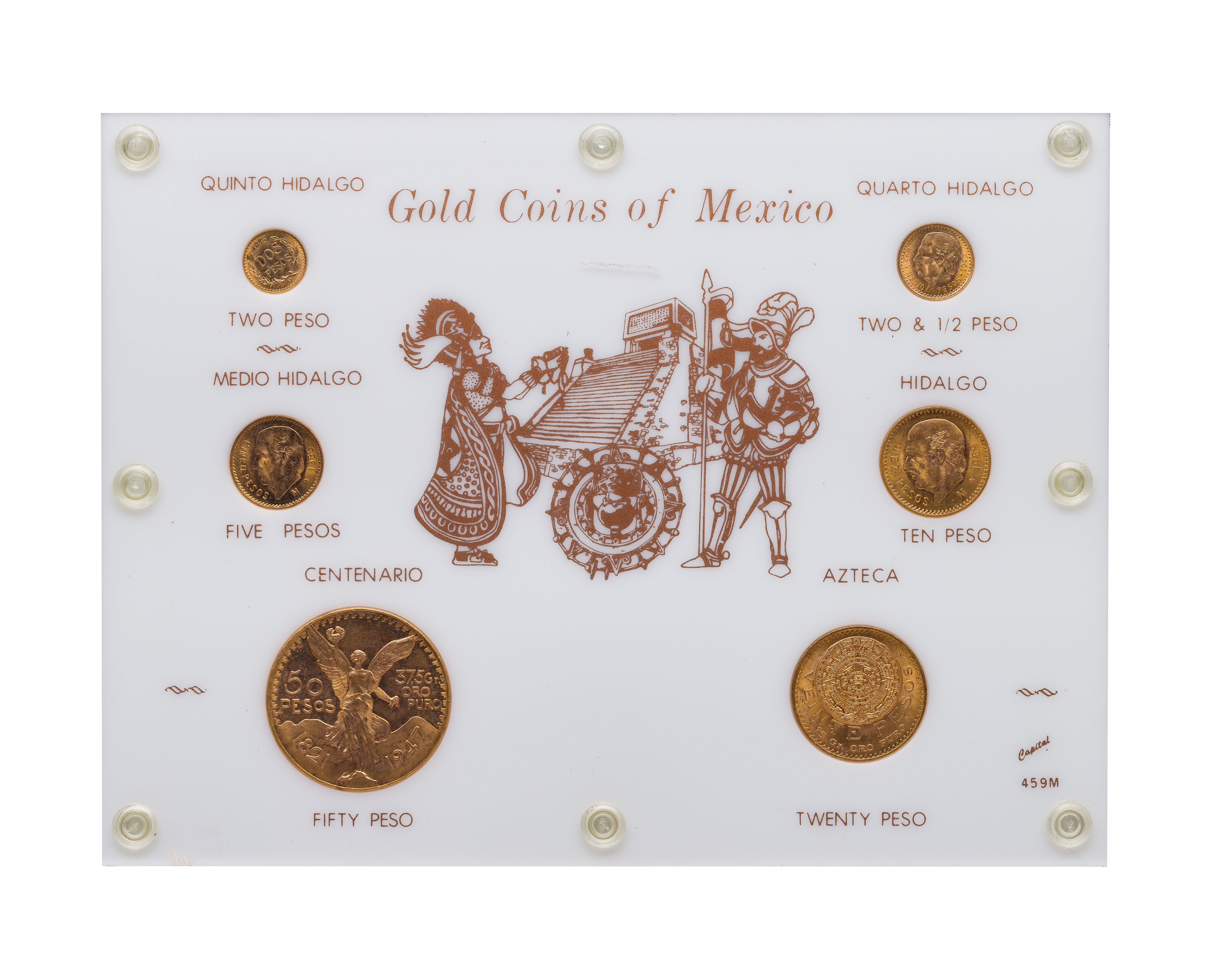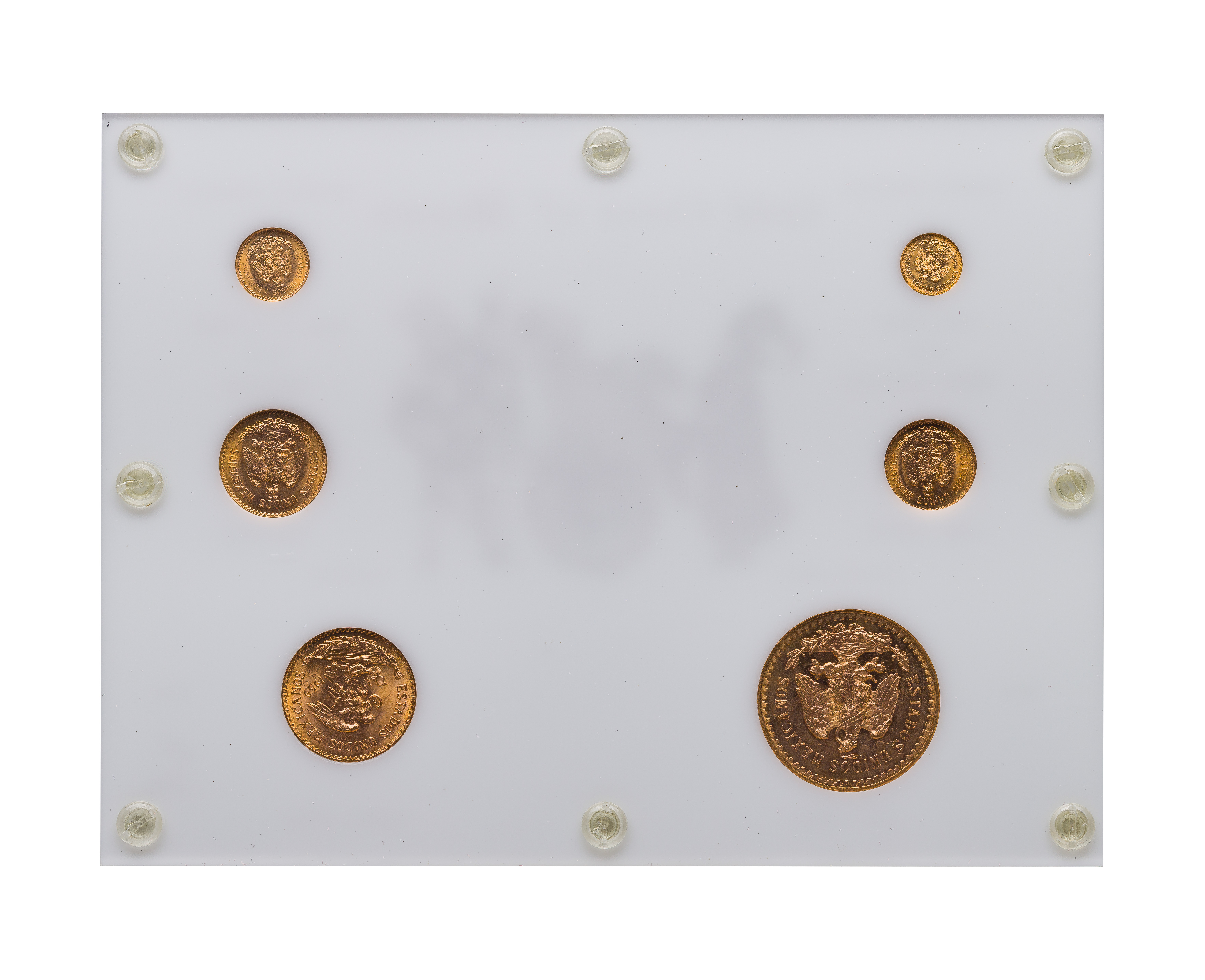(6) coins including a 50 peso, a 20 peso, a 10 peso, a 5 peso, a 2 1/2 peso and 2 peso, in a plastic holder and box