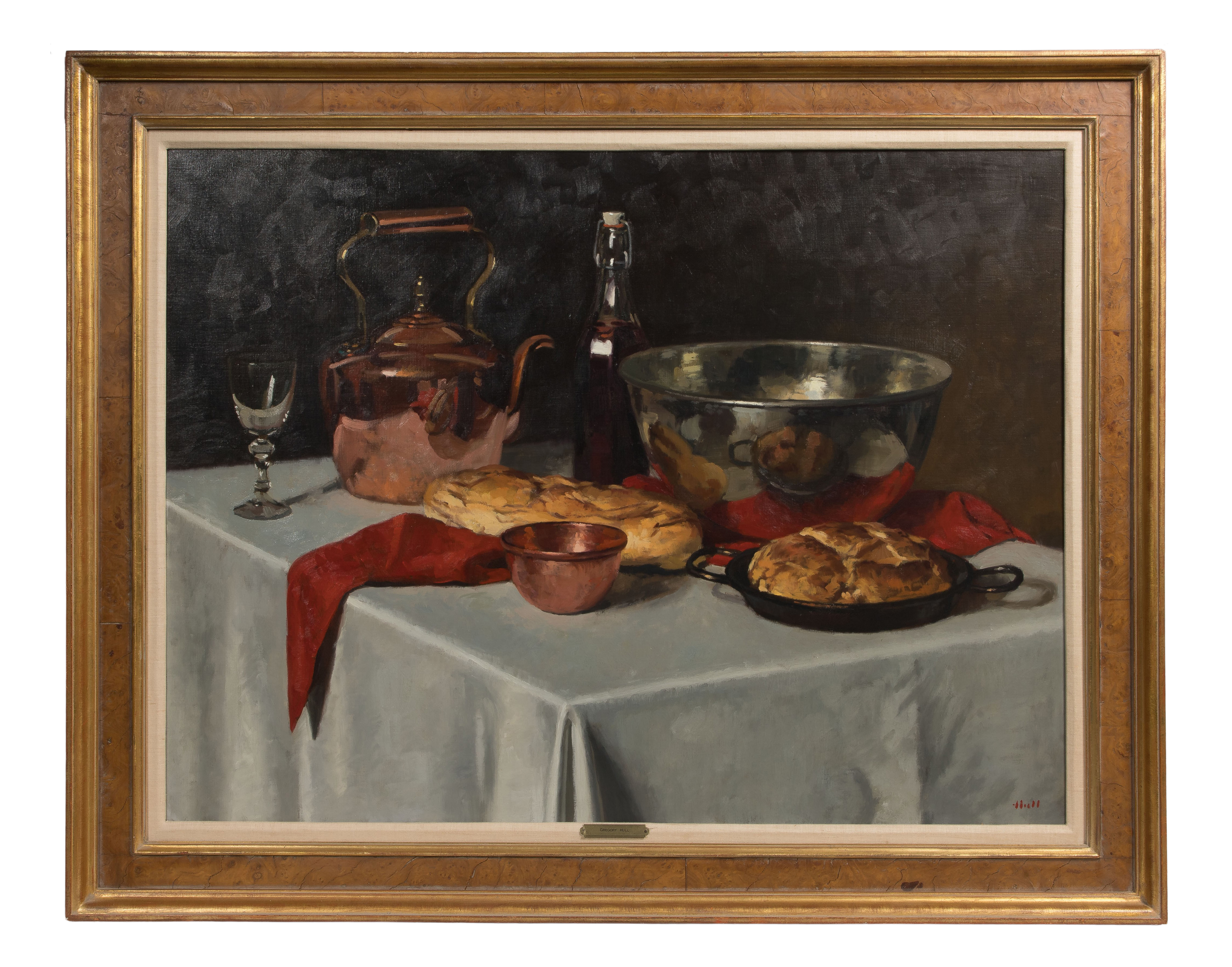 Undated, signed lower right, depicting a table having vessels and food, in a gold-tone wood frame having a linen liner and brass artist label