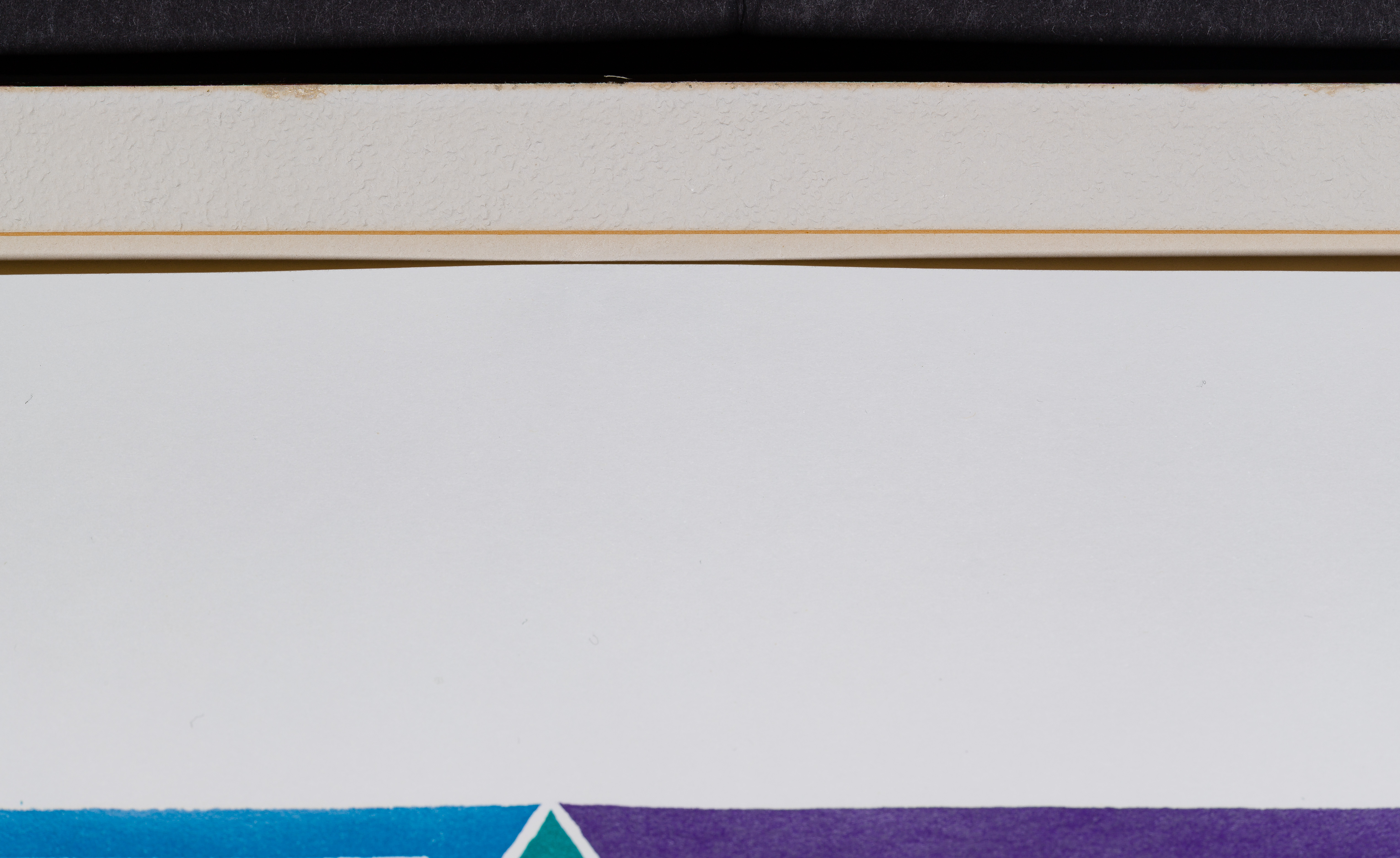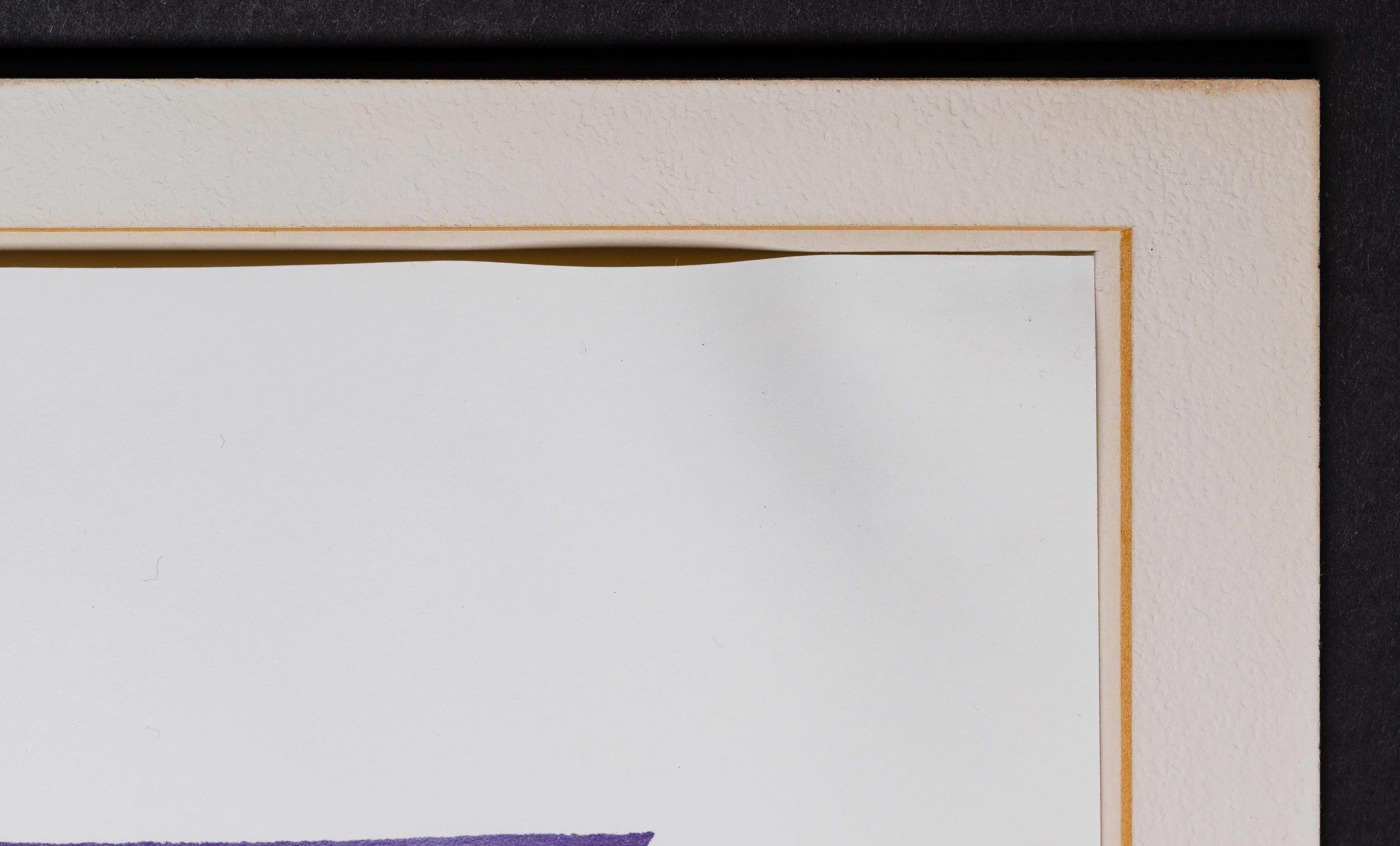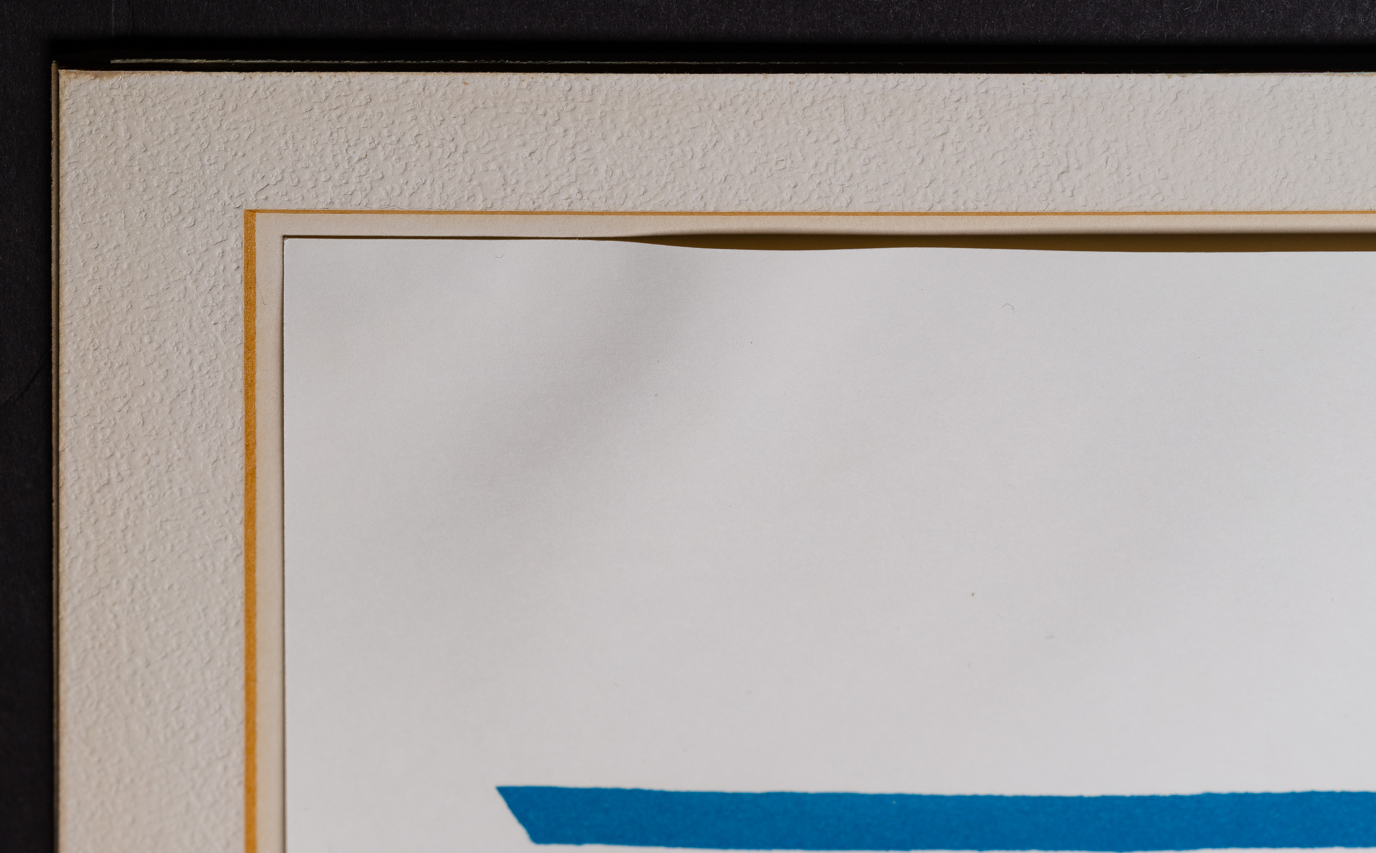 mounted with linen tape at upper left, upper center, and upper right, having some waviness to upper right and left corners where mounted, sustaining a shallow 1/2-inch curved crease near lower edge just right of center, frame having minor wear, light scratches to glass