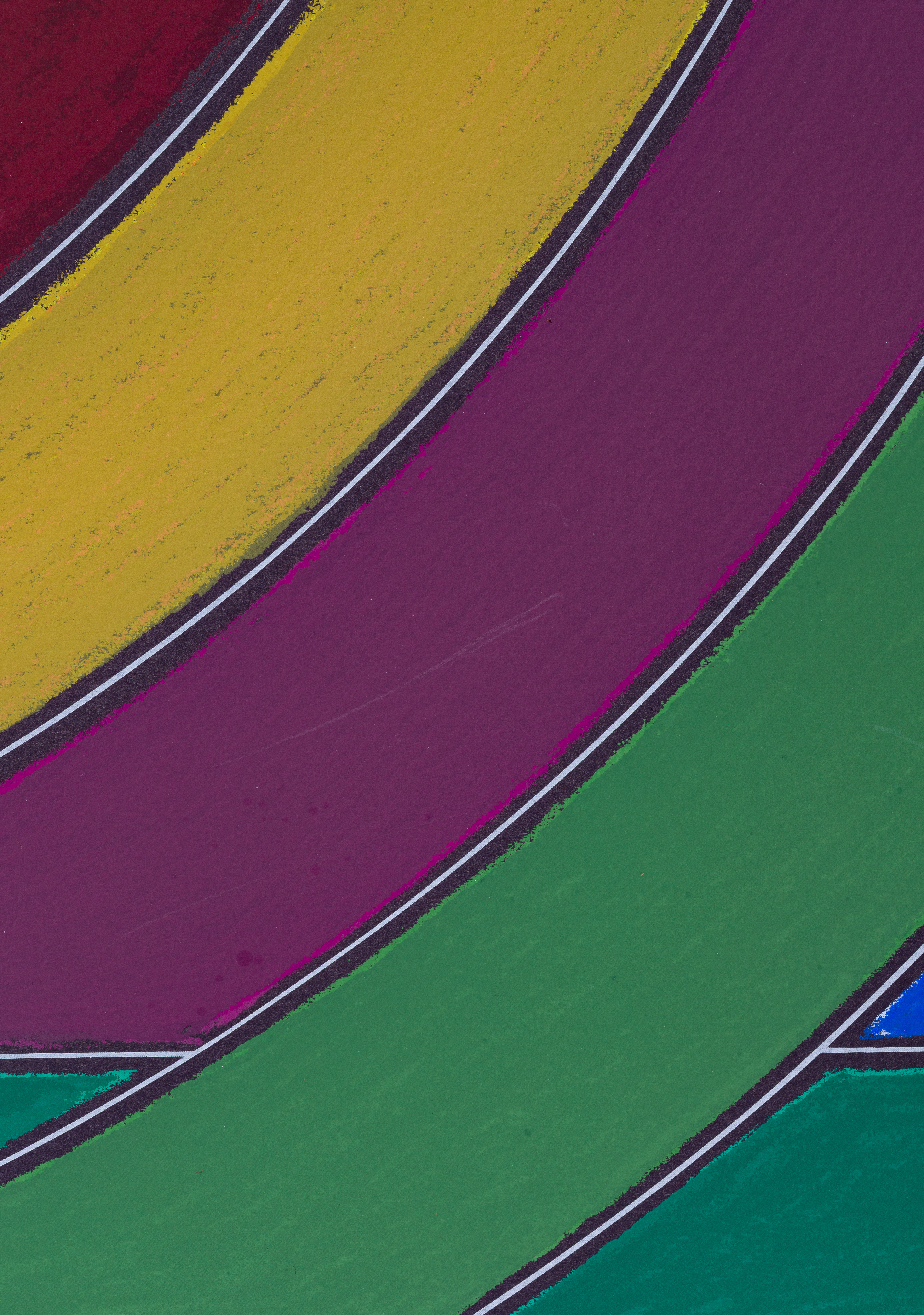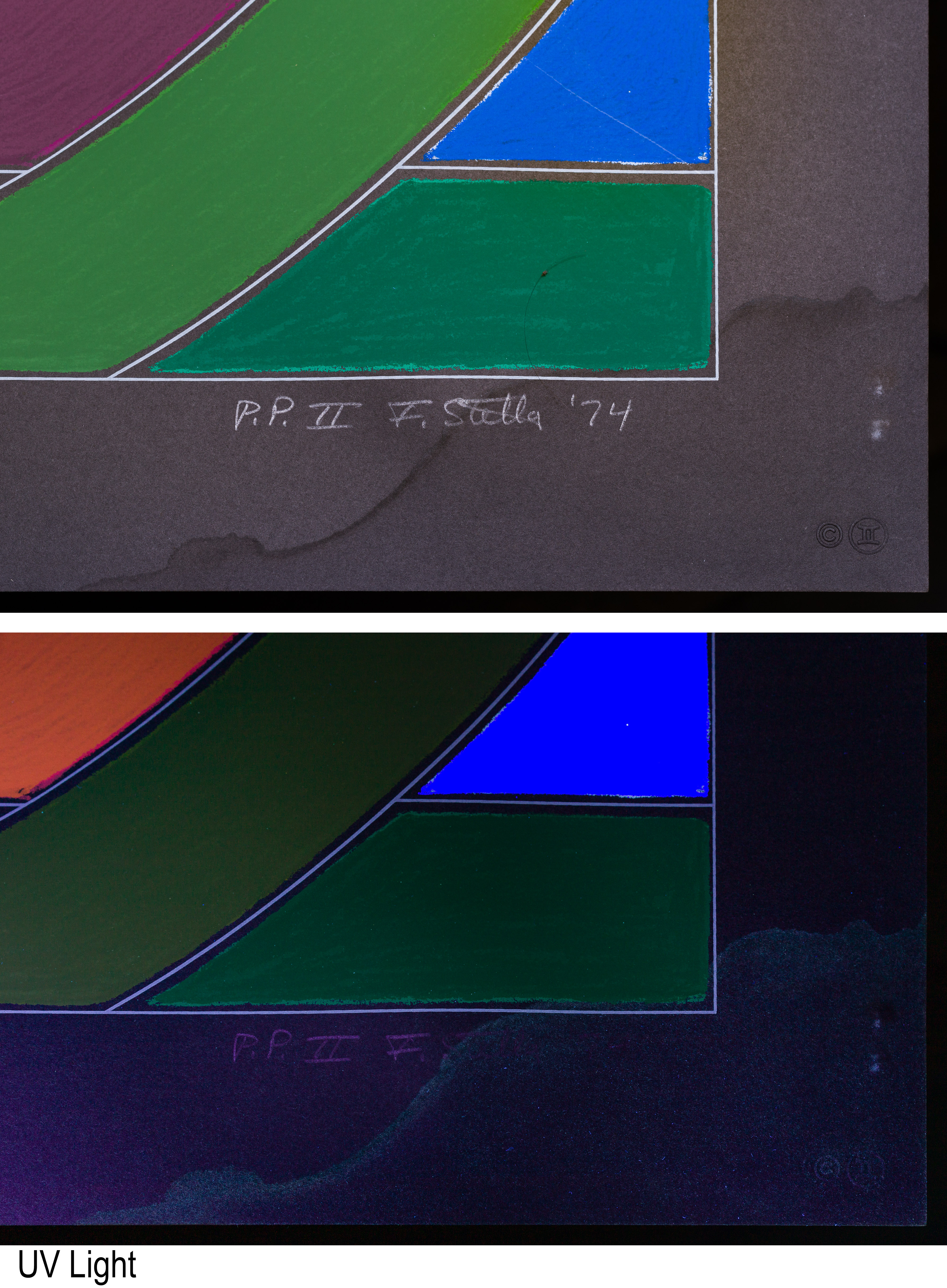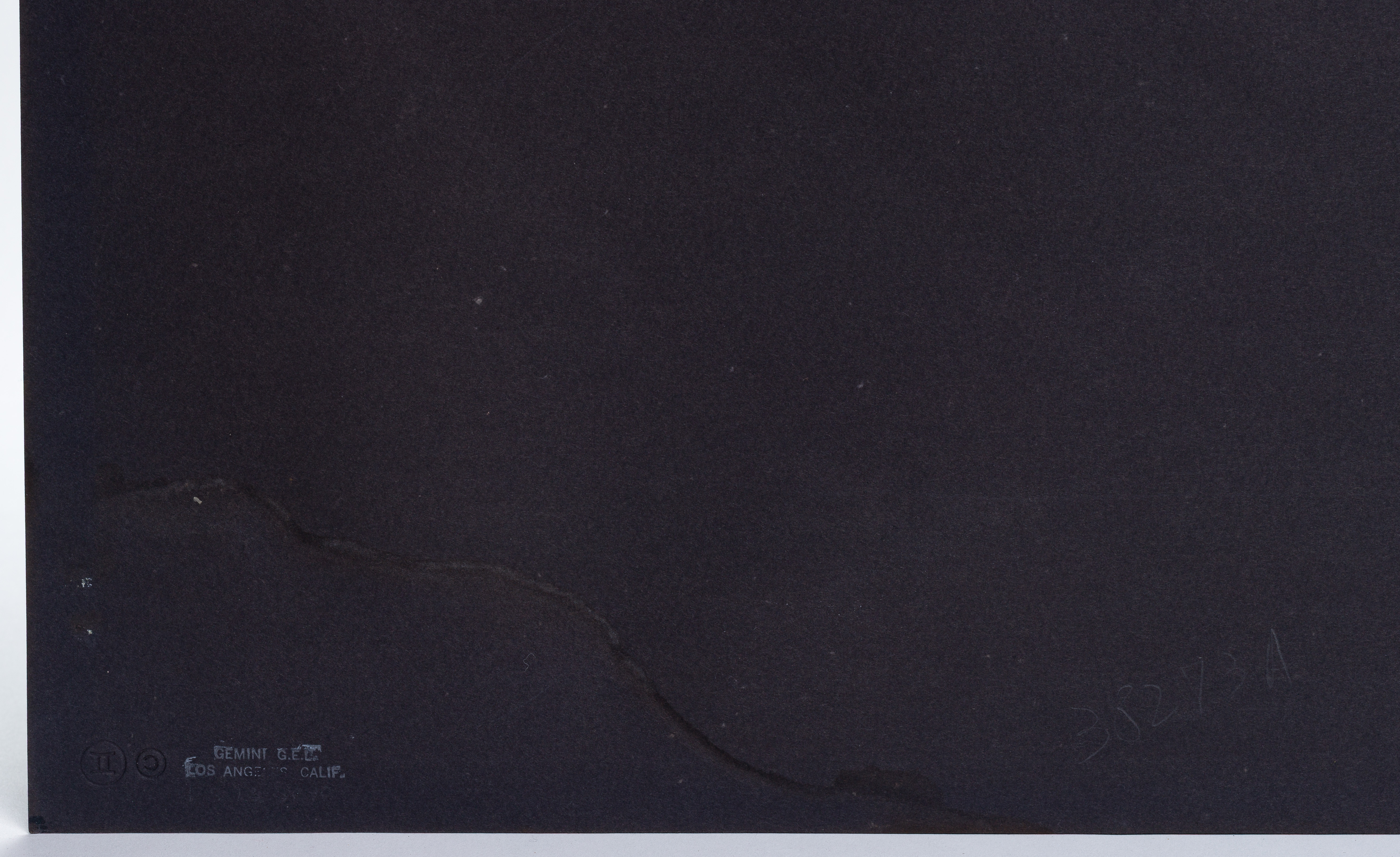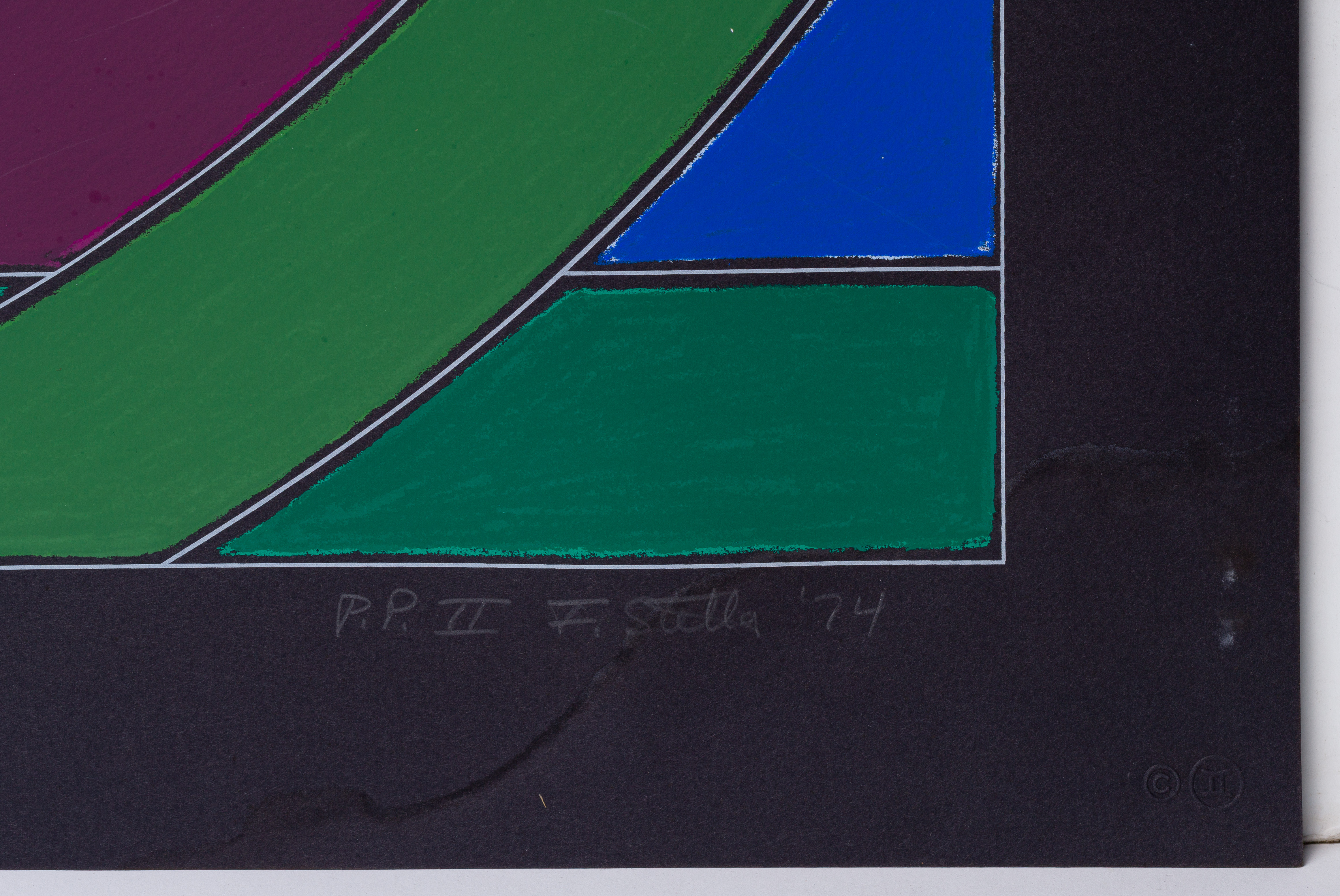1974, pencil signed, annotated ‘PP II’, blind stamp, a geometric abstraction featuring interlocking protractor shapes and bold color, published by Gemini G.E.L., having publisher rubber stamp and pencil ‘38273A’ sheet verso, unmounted, floated in acrylic box style frame