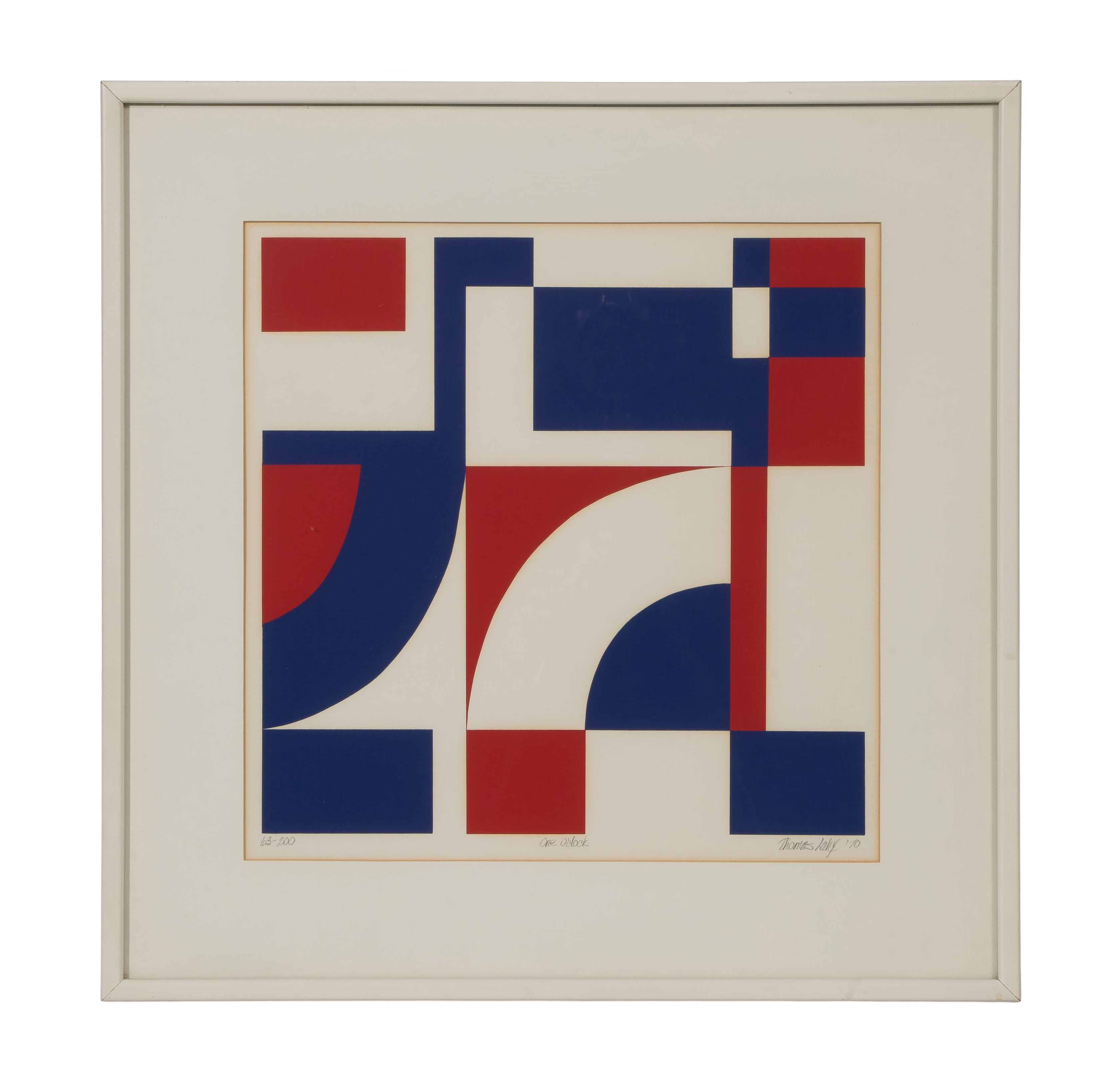 1970, pencil signed, titled, #63/200, an abstract composition featuring geometric shapes in blue, red, and white, matted under glass in a white painted wood frame