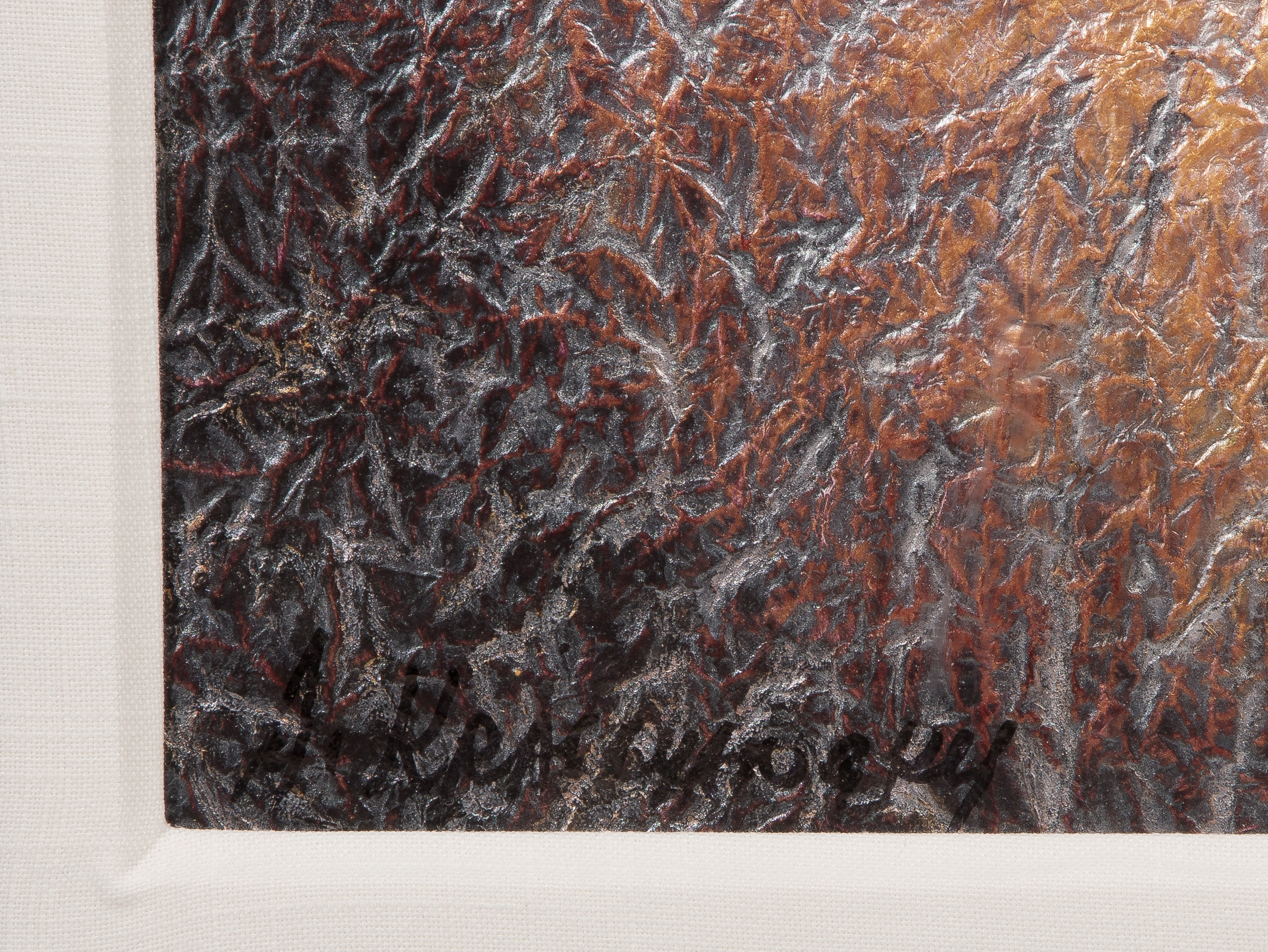 Undated, signed, depicting a jester in watercolor and oil on crinkled Japanese paper, matted under acrylic in a black and gold-tone painted frame, COA