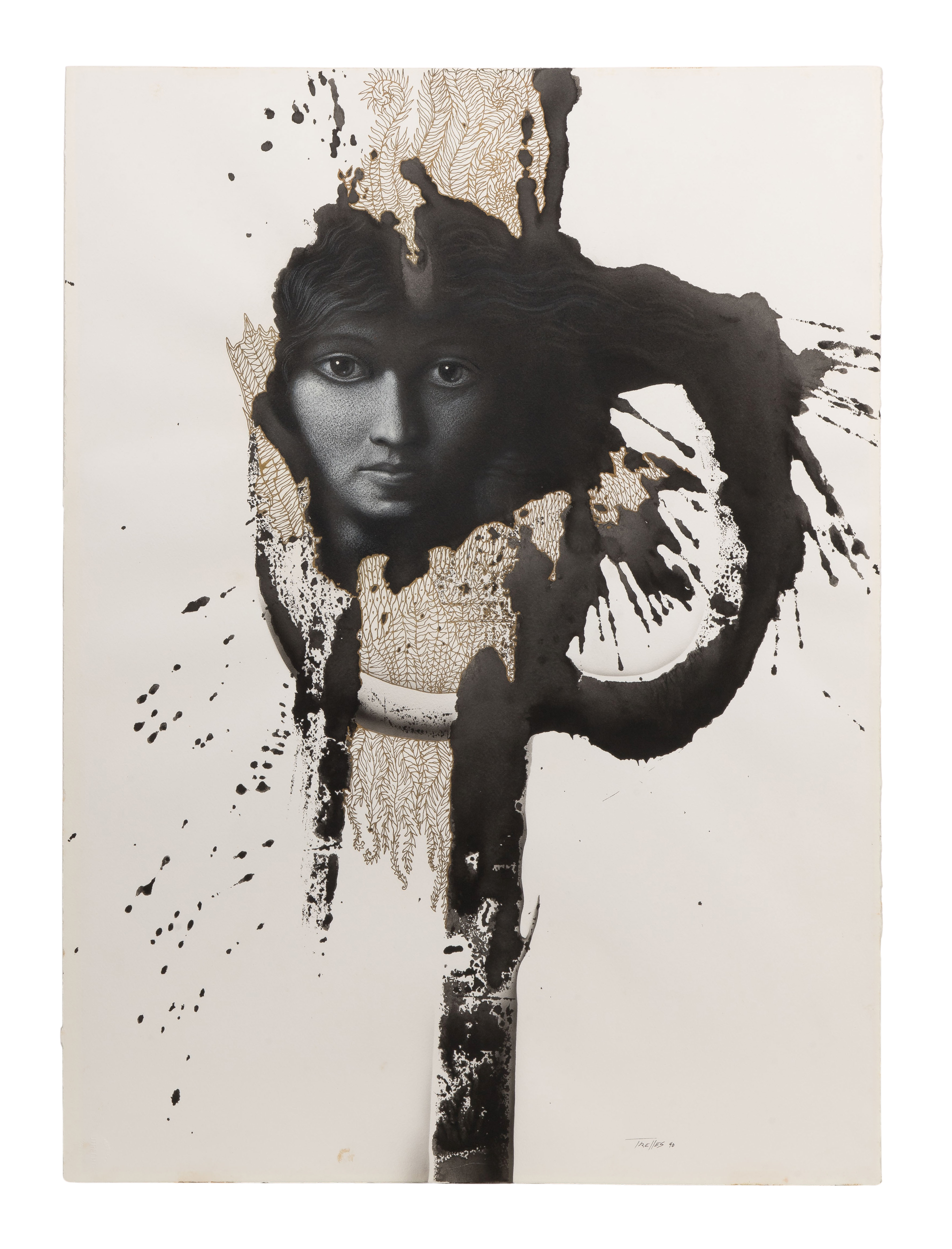 1990, ink signed and dated lower right, Utrecht paper blind stamp lower left, depicting a face emerging from sepia and black ink abstract work, unframed