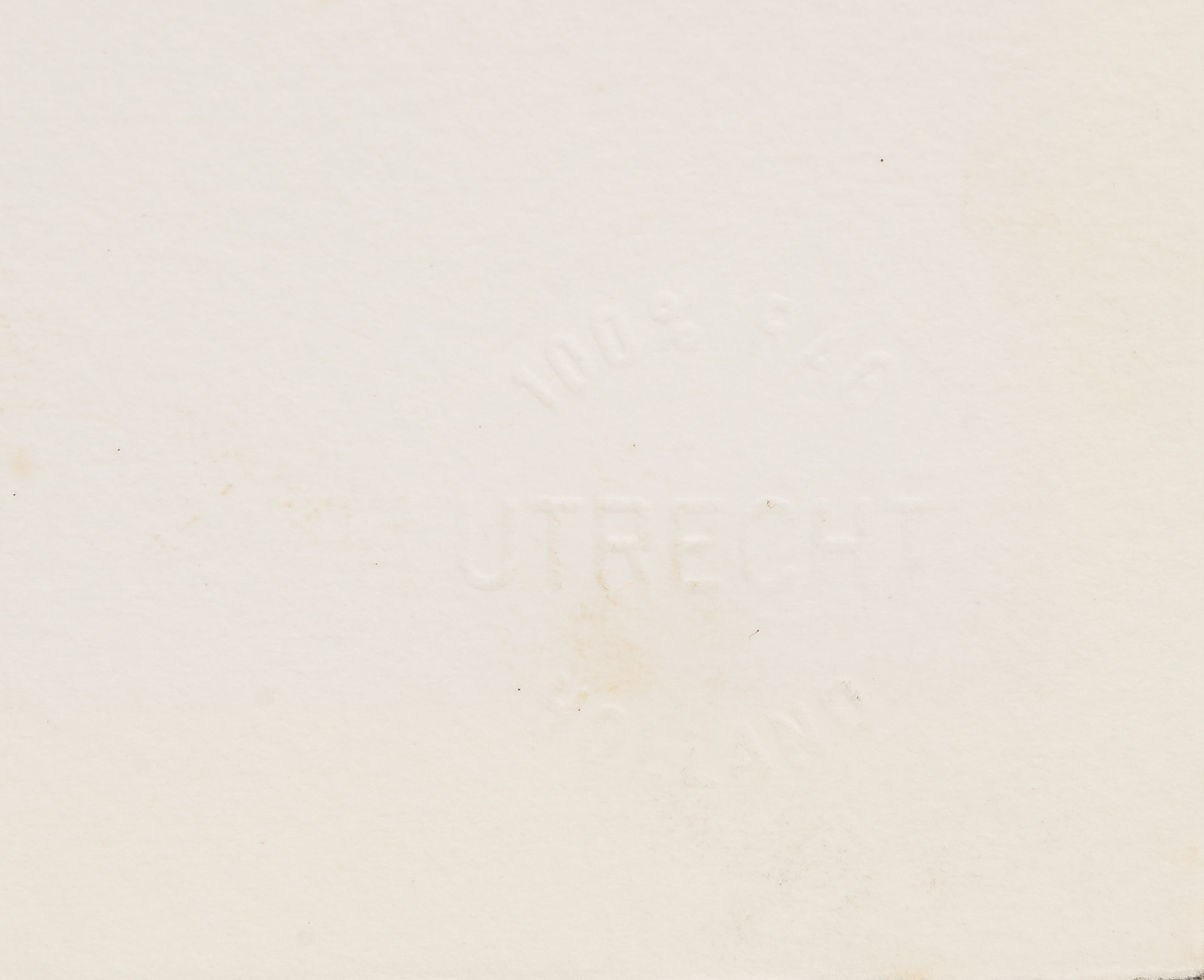 tape residue at upper and lower edges verso, a spot of discoloration left of center above lower edge, paper lightly warped from artist process