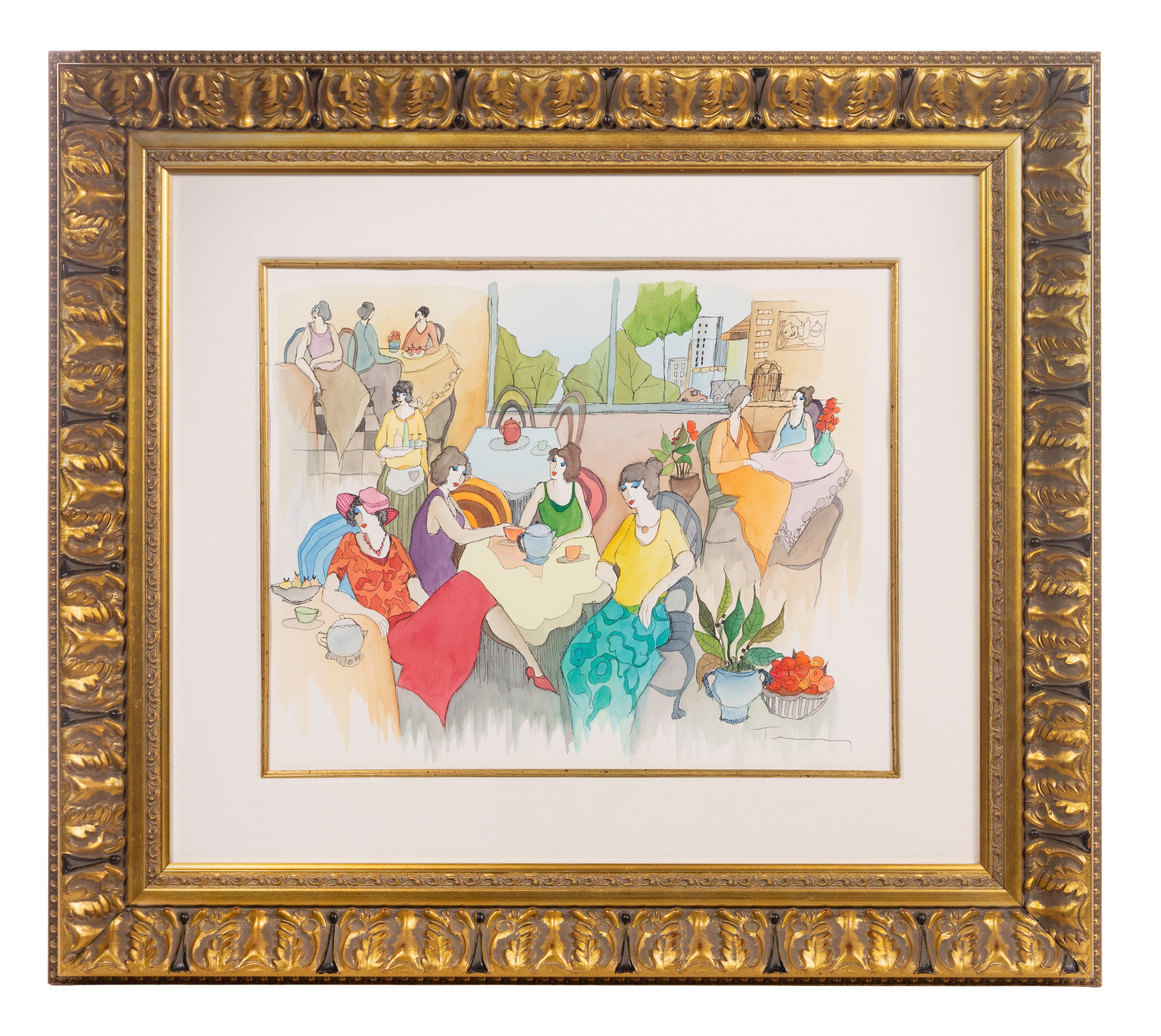 2005, signed, depicting ladies at lunch, matted under acrylic in a gold-tone painted wood frame, including paperwork
