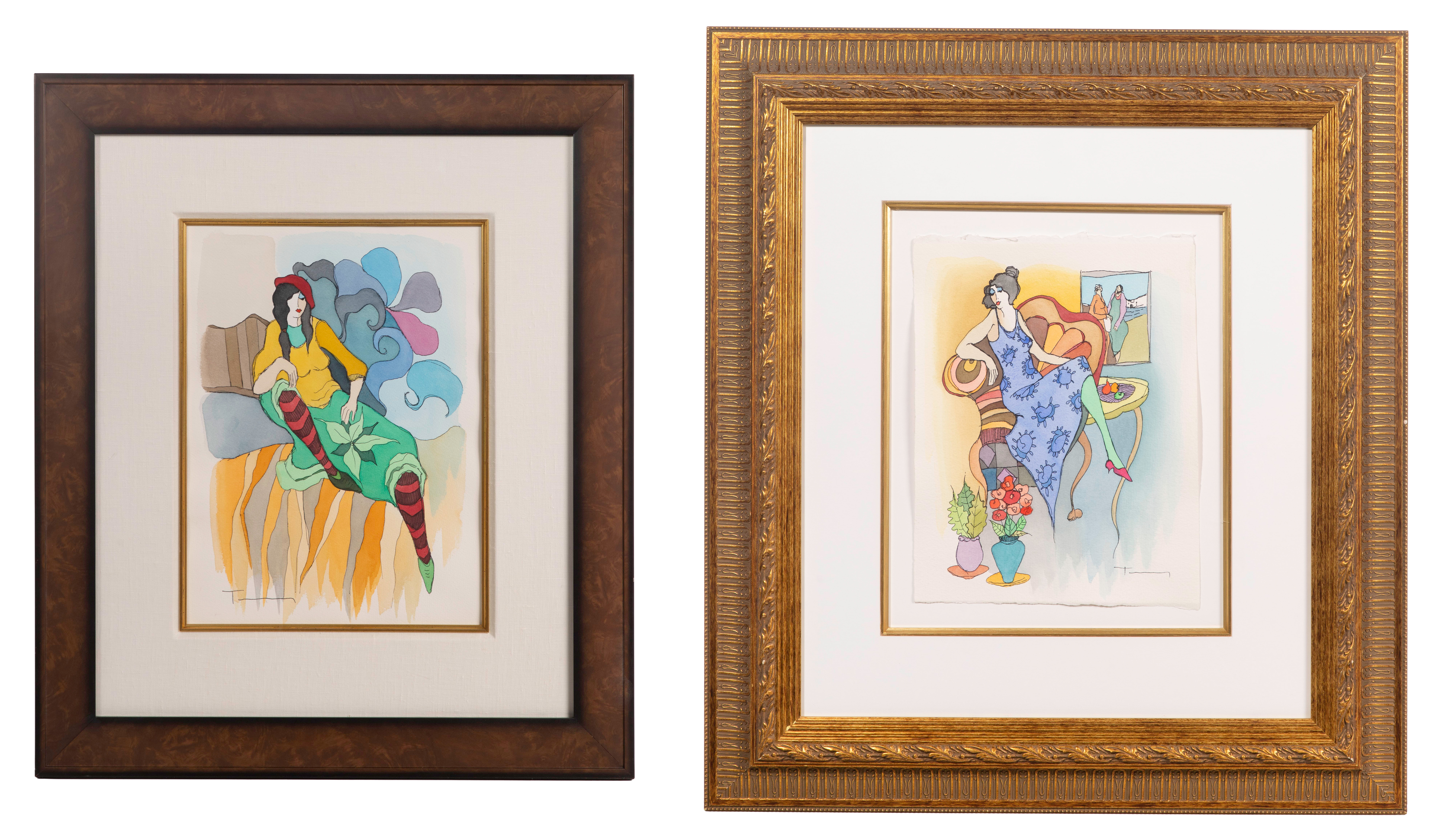 (2) undated items, signed, both titled verso, including ‘Vintage Fashion’ and ‘Simple Thoughts’ latter having COA, depicting reclining women using loose fluid lines and translucent washes, matted under acrylic in wood frames, having paperwork and COA