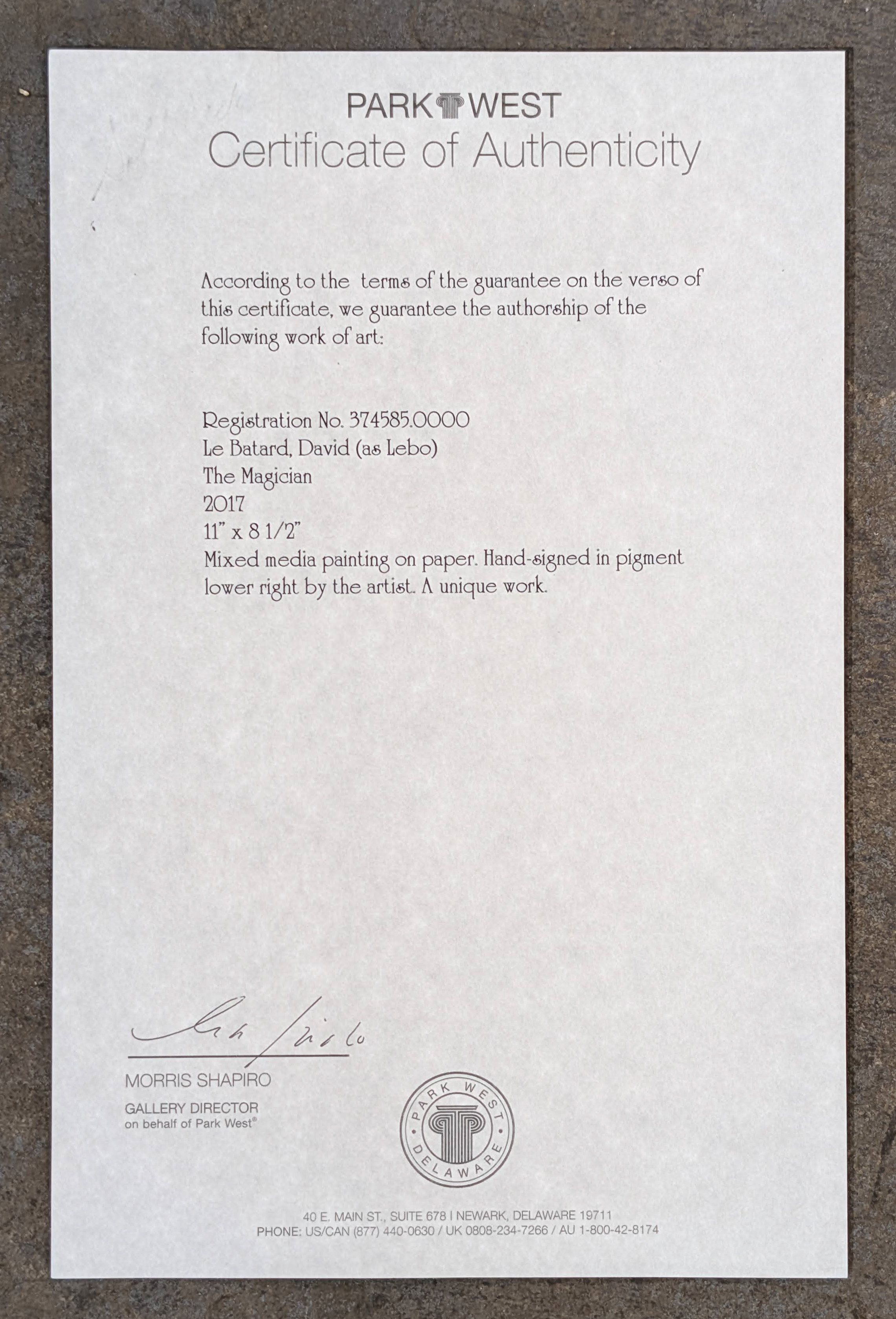 (2) undated items, signed ‘(LEBO)’ including ‘The Magician’ and ‘The Beat Tile C’, both under acrylic in wood frames, having paperwork and COA