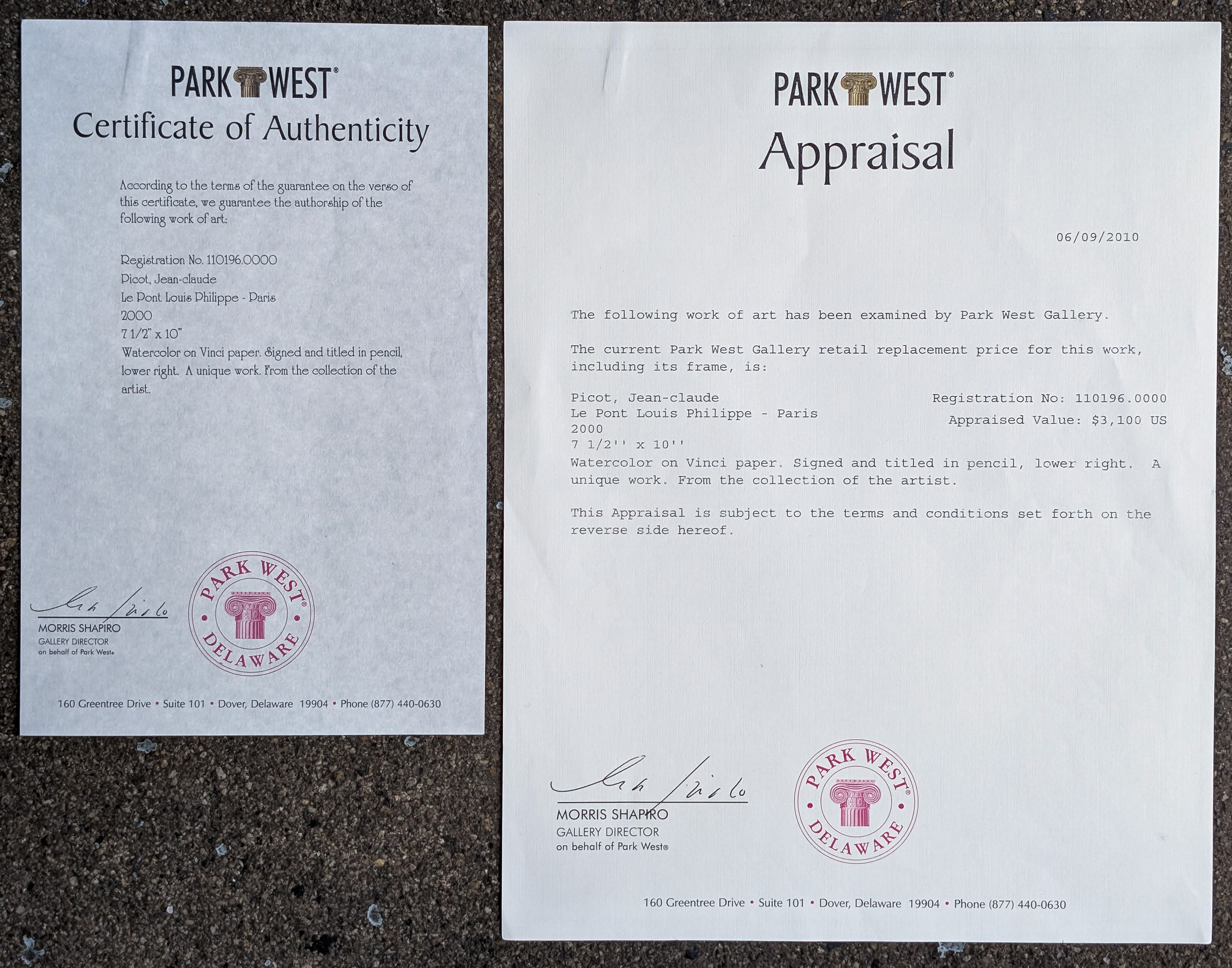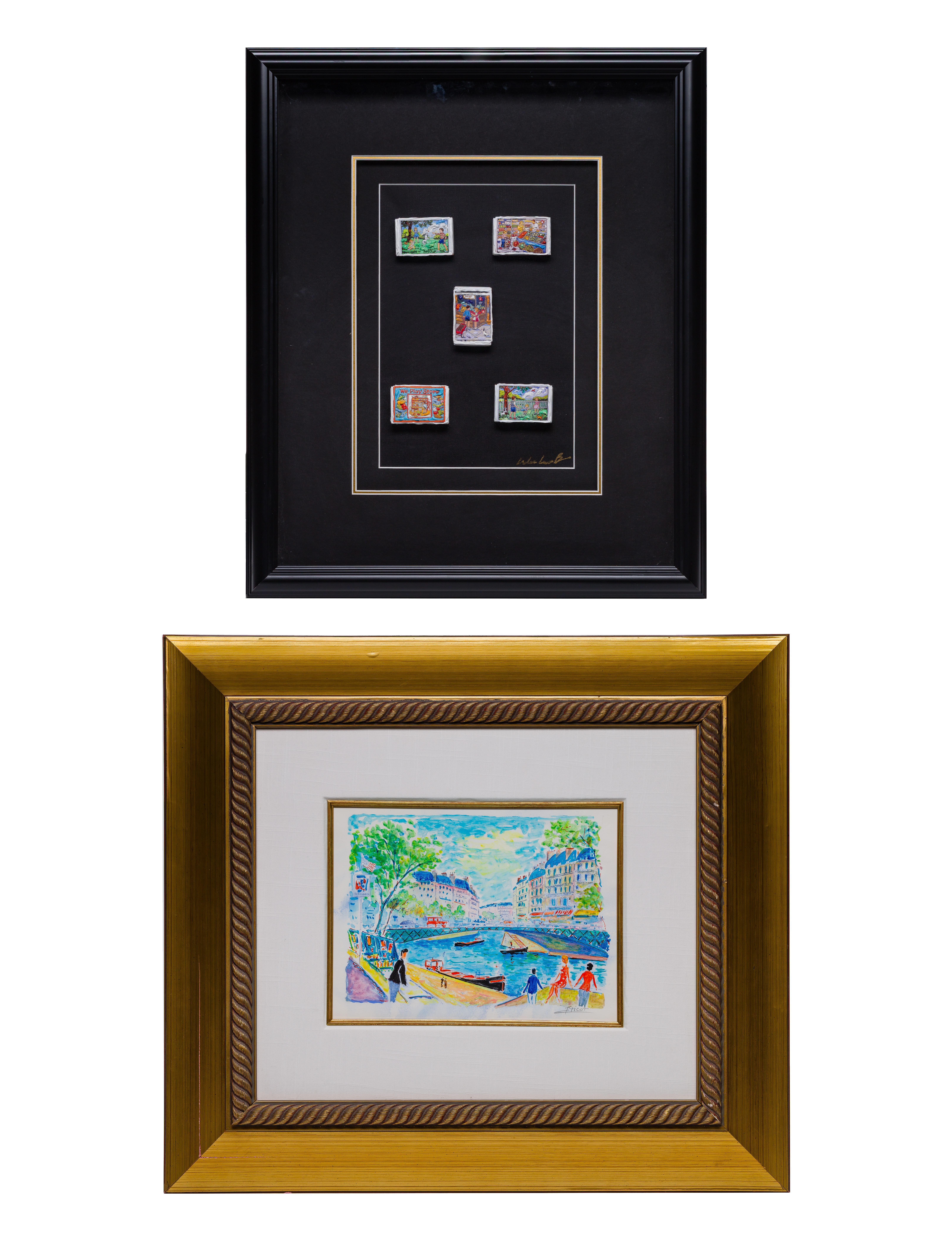 (2) total items including an undated, signed construction having five painted matchboxes float mounted in a black shadow box frame; together with a Jean-Claude Picot (French, 1933-2020) undated, signed lithograph ‘Pont Louis de Paris’, under acrylic in a gold-tone painted frame, having paperwork