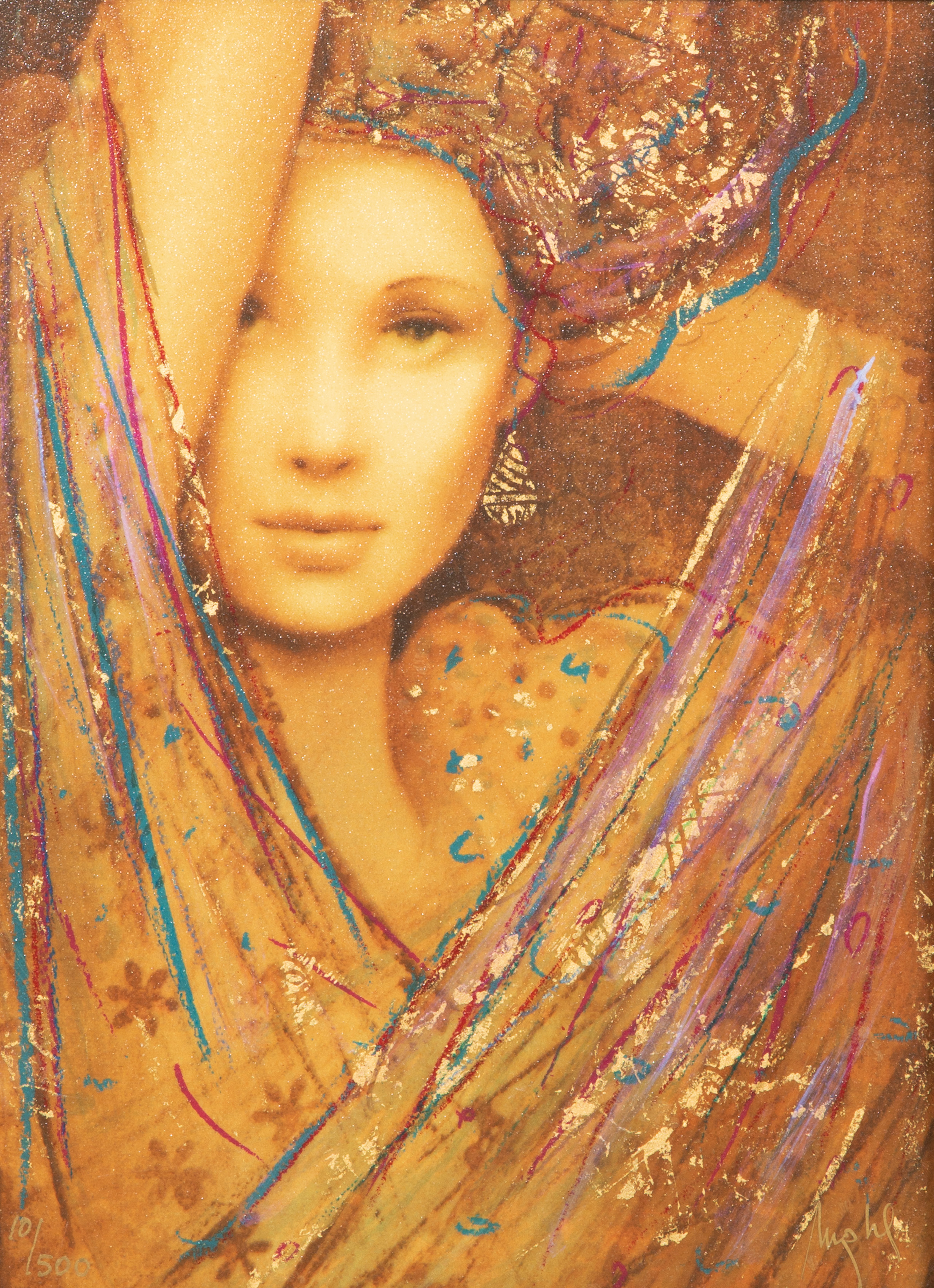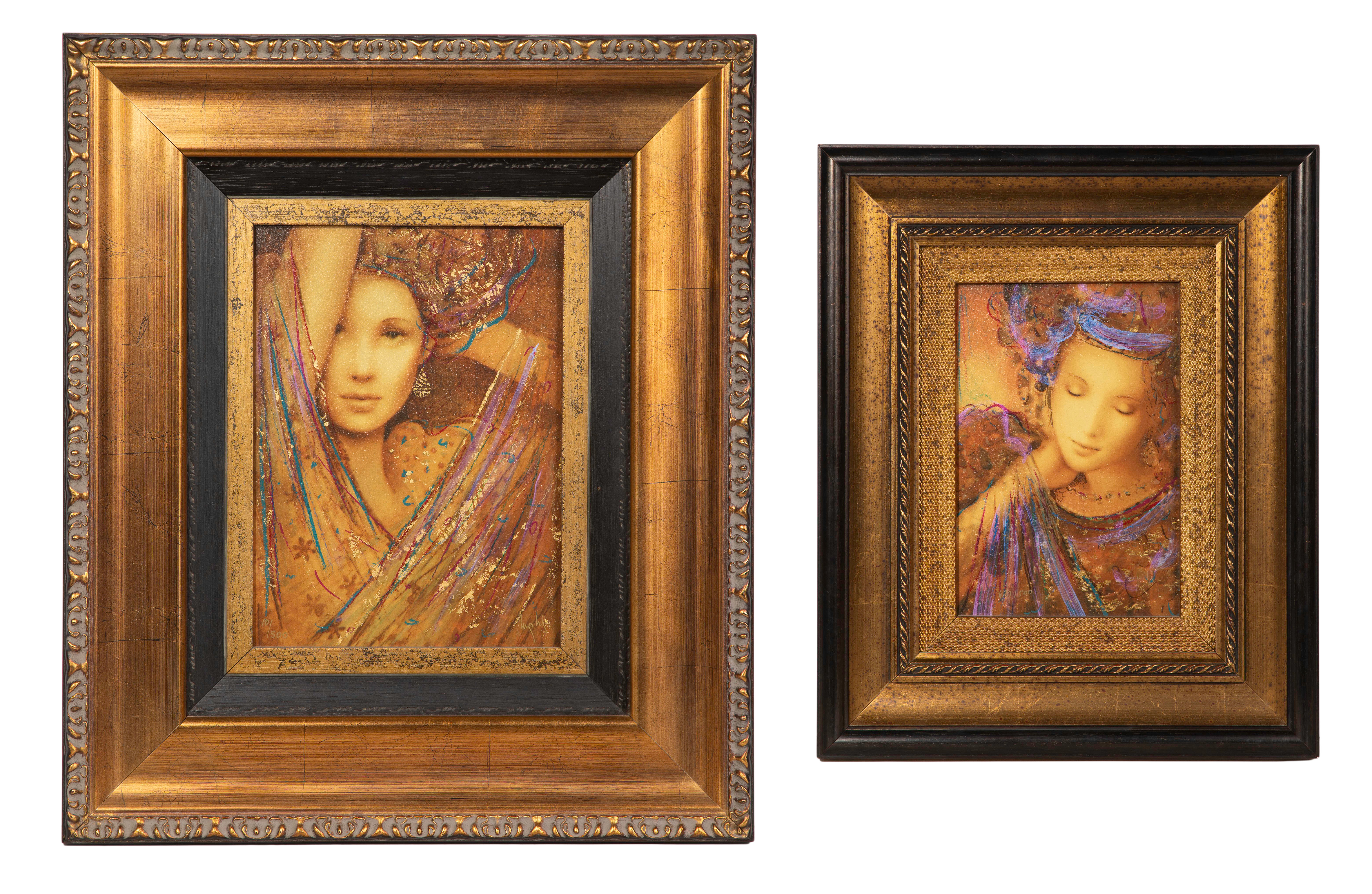 (2) items, both signed, including undated ‘Phoenia Palais VIP’ #939/1500, titled verso and 2006 ‘La Femme Charisma VIP’ #101/1500 having COA, both hand embellished portraits of veiled woman, in gold-tone painted wood frames, having paperwork