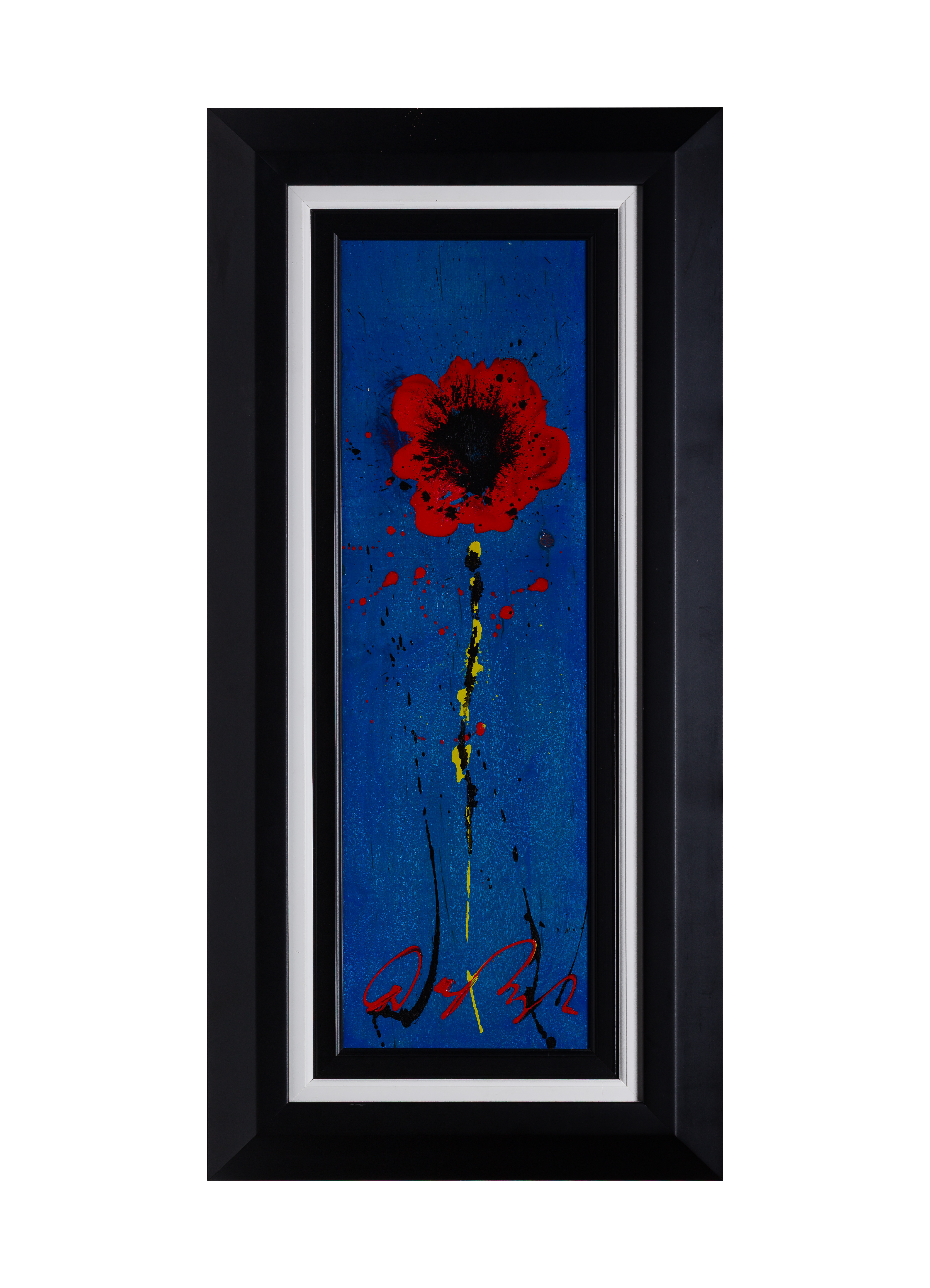 Undated, signed, titled verso, depicting a poppy against a blue ground, in a black wood frame, including paperwork and COA