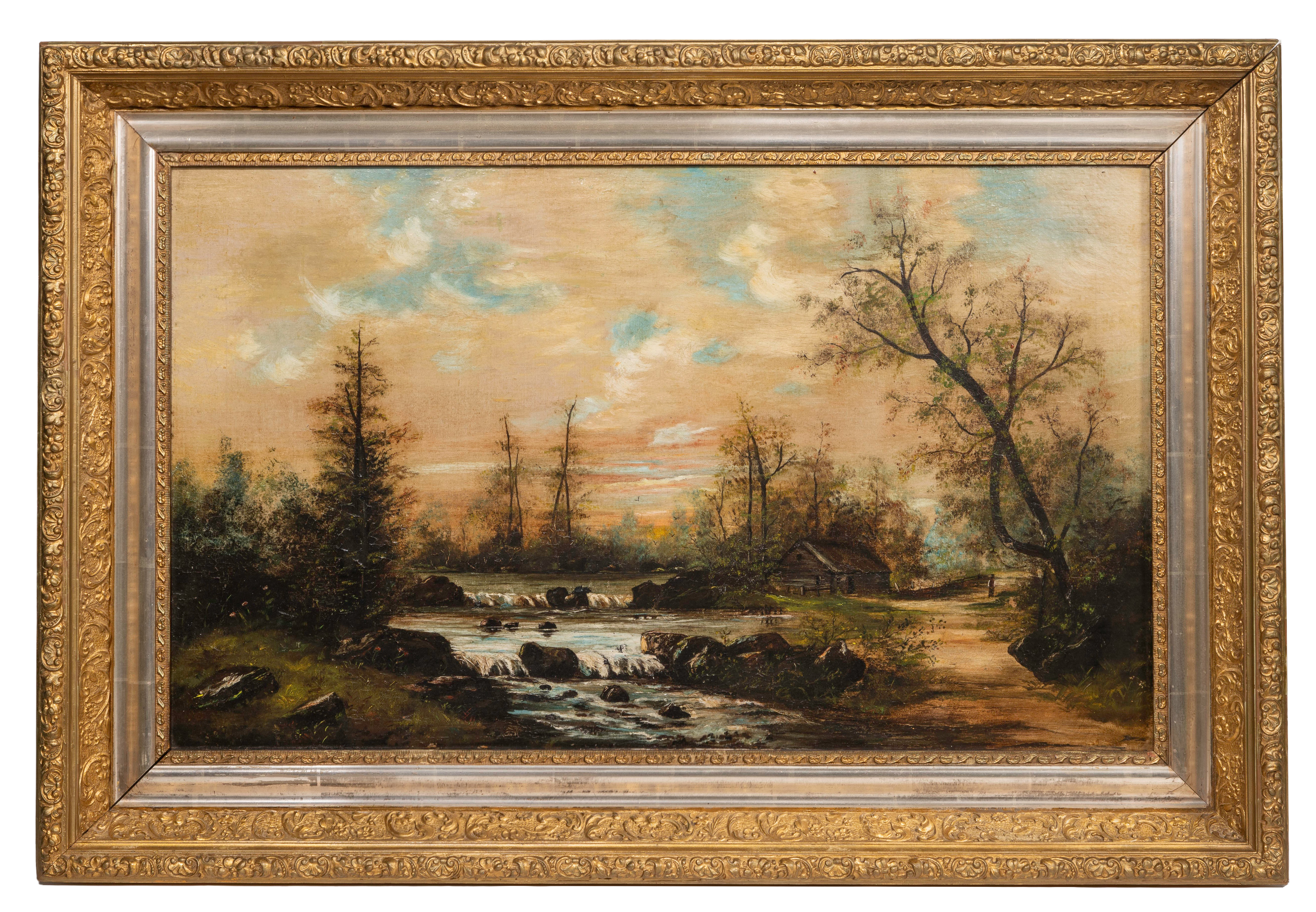Undated, unsigned, depicting a rocky stream amid a wooded landscape, in a gold-tone composite on wood frame having a silver-tone liner