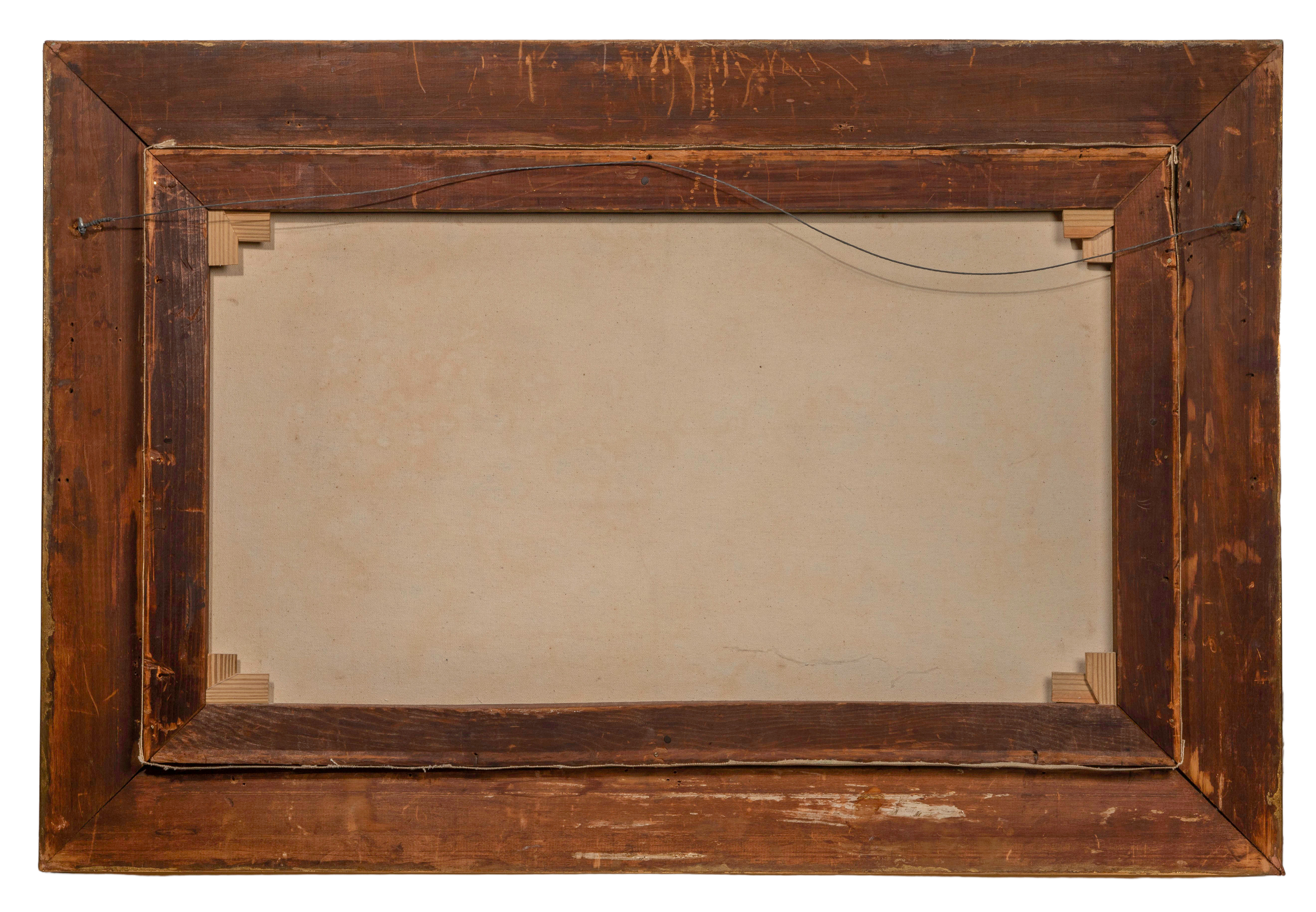 relined, craquelure lower left edge, accretion top edge right of center, frame having light wear, gap at miter